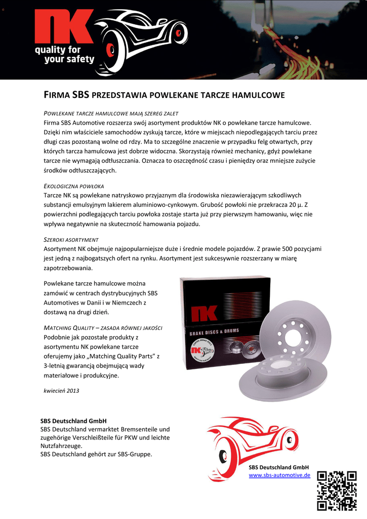 FIRMA SBS PRZEDSTAWIA POWLEKANE TARCZE HAMULCOWE POWLEKANE TARCZE HAMULCOWE MAJĄ SZEREG ZALET Firma SBS Automotive rozszerza swój asortyment produktów NK o powlekane tarcze hamulcowe. Dzięki nim właściciele samochodów zyskują tarcze, które w miejscach niepodlegających tarciu przez długi czas pozostaną wolne od rdzy. Ma to szczególne znaczenie w przypadku felg otwartych, przy których tarcza hamulcowa jest dobrze widoczna. Skorzystają również mechanicy, gdyż powlekane tarcze nie wymagają odtłuszczania. Oznacza to oszczędność czasu i pieniędzy oraz mniejsze zużycie środków odtłuszczających. EKOLOGICZNA POWŁOKA Tarcze NK są powlekane natryskowo przyjaznym dla środowiska niezawierającym szkodliwych substancji emulsyjnym lakierem aluminiowo-cynkowym. Grubość powłoki nie przekracza 20 µ. Z powierzchni podlegających tarciu powłoka zostaje starta już przy pierwszym hamowaniu, więc nie wpływa negatywnie na skuteczność hamowania pojazdu. SZEROKI ASORTYMENT Asortyment NK obejmuje najpopularniejsze duże i średnie modele pojazdów. Z prawie 500 pozycjami jest jedną z najbogatszych ofert na rynku. Asortyment jest sukcesywnie rozszerzany w miarę zapotrzebowania. Powlekane tarcze hamulcowe można zamówić w centrach dystrybucyjnych SBS Automotives w Danii i w Niemczech z dostawą na drugi dzień. MATCHING QUALITY – ZASADA RÓWNEJ JAKOŚCI Podobnie jak pozostałe produkty z asortymentu NK powlekane tarcze oferujemy jako „Matching Quality Parts” z 3-letnią gwarancją obejmującą wady materiałowe i produkcyjne. kwiecień 2013 SBS Deutschland GmbH SBS Deutschland vermarktet Bremsenteile und zugehörige Verschleißteile für PKW und leichte Nutzfahrzeuge. SBS Deutschland gehört zur SBS-Gruppe. SBS Deutschland GmbH www.sbs-automotive.de