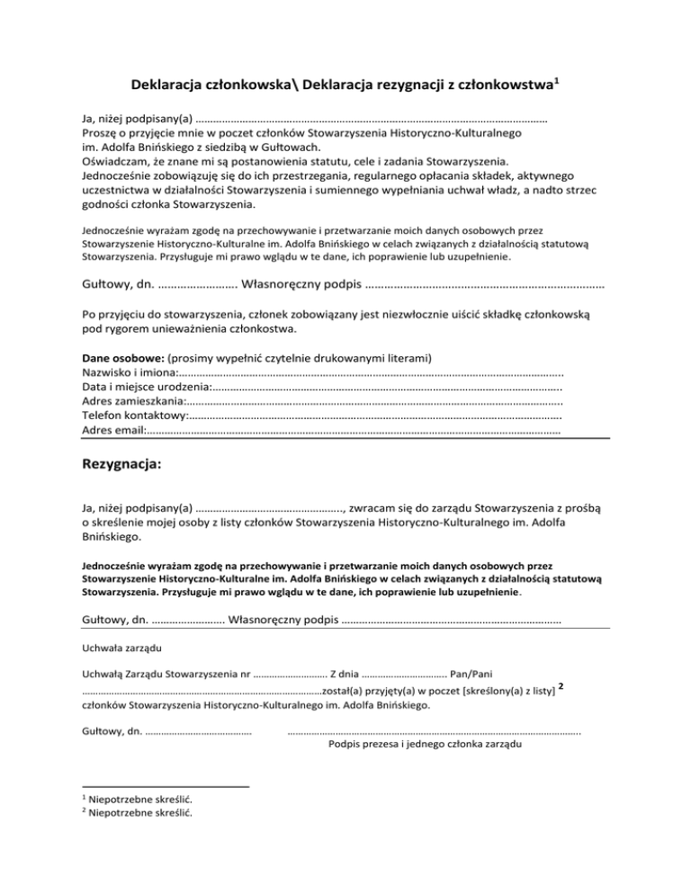 Deklaracja członkowska\ Deklaracja rezygnacji z członkowstwa1 Ja, niżej podpisany(a) ………………………………………………………………………………………………………… Proszę o przyjęcie mnie w poczet członków Stowarzyszenia Historyczno-Kulturalnego im. Adolfa Bnińskiego z siedzibą w Gułtowach. Oświadczam, że znane mi są postanowienia statutu, cele i zadania Stowarzyszenia. Jednocześnie zobowiązuję się do ich przestrzegania, regularnego opłacania składek, aktywnego uczestnictwa w działalności Stowarzyszenia i sumiennego wypełniania uchwał władz, a nadto strzec godności członka Stowarzyszenia. Jednocześnie wyrażam zgodę na przechowywanie i przetwarzanie moich danych osobowych przez Stowarzyszenie Historyczno-Kulturalne im. Adolfa Bnińskiego w celach związanych z działalnością statutową Stowarzyszenia. Przysługuje mi prawo wglądu w te dane, ich poprawienie lub uzupełnienie. Gułtowy, dn. ……………………. Własnoręczny podpis ………………………………………………………………… Po przyjęciu do stowarzyszenia, członek zobowiązany jest niezwłocznie uiścić składkę członkowską pod rygorem unieważnienia członkostwa. Dane osobowe: (prosimy wypełnić czytelnie drukowanymi literami) Nazwisko i imiona:………………………………………………………………………………………………………………….. Data i miejsce urodzenia:……………………………………………………………………………………………………….. Adres zamieszkania:……………………………………………………………………………………………………………….. Telefon kontaktowy:………………………………………………………………………………………………………………. Adres email:…………………………………………………………………………………………………………………………… Rezygnacja: Ja, niżej podpisany(a) ………………………………………….., zwracam się do zarządu Stowarzyszenia z prośbą o skreślenie mojej osoby z listy członków Stowarzyszenia Historyczno-Kulturalnego im. Adolfa Bnińskiego. Jednocześnie wyrażam zgodę na przechowywanie i przetwarzanie moich danych osobowych przez Stowarzyszenie Historyczno-Kulturalne im. Adolfa Bnińskiego w celach związanych z działalnością statutową Stowarzyszenia. Przysługuje mi prawo wglądu w te dane, ich poprawienie lub uzupełnienie. Gułtowy, dn. ……………………. Własnoręczny podpis ………………………………………………………………… Uchwała zarządu Uchwałą Zarządu Stowarzyszenia nr ………………………. Z dnia ………………………….. Pan/Pani ………………………………………………………………………………został(a) przyjęty(a) w poczet [skreślony(a) z listy] członków Stowarzyszenia Historyczno-Kulturalnego im. Adolfa Bnińskiego. Gułtowy, dn. …………………………………. 1 2 Niepotrzebne skreślić. Niepotrzebne skreślić. 2 ……………………………………………………………………………………………….. Podpis prezesa i jednego członka zarządu