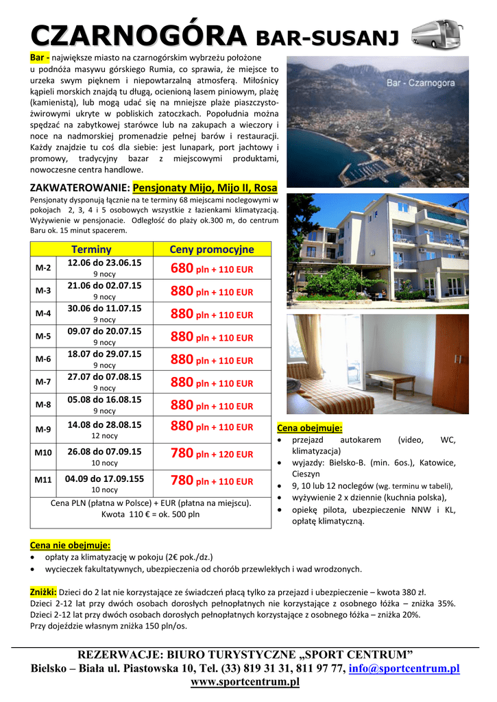CZARNOGÓRA BAR-SUSANJ Bar - największe miasto na czarnogórskim wybrzeżu położone u podnóża masywu górskiego Rumia, co sprawia, że miejsce to urzeka swym pięknem i niepowtarzalną atmosferą. Miłośnicy kąpieli morskich znajdą tu długą, ocienioną lasem piniowym, plażę (kamienistą), lub mogą udać się na mniejsze plaże piaszczystożwirowymi ukryte w pobliskich zatoczkach. Popołudnia można spędzać na zabytkowej starówce lub na zakupach a wieczory i noce na nadmorskiej promenadzie pełnej barów i restauracji. Każdy znajdzie tu coś dla siebie: jest lunapark, port jachtowy i promowy, tradycyjny bazar z miejscowymi produktami, nowoczesne centra handlowe. ZAKWATEROWANIE: Pensjonaty Mijo, Mijo II, Rosa Pensjonaty dysponują łącznie na te terminy 68 miejscami noclegowymi w pokojach 2, 3, 4 i 5 osobowych wszystkie z łazienkami klimatyzacją. Wyżywienie w pensjonacie. Odległość do plaży ok.300 m, do centrum Baru ok. 15 minut spacerem. Terminy M-2 12.06 do 23.06.15 M-3 21.06 do 02.07.15 M-4 30.06 do 11.07.15 M-5 09.07 do 20.07.15 M-6 18.07 do 29.07.15 M-7 27.07 do 07.08.15 M-8 05.08 do 16.08.15 M-9 14.08 do 28.08.15 M10 9 nocy 9 nocy 9 nocy 9 nocy 9 nocy 9 nocy 9 nocy 12 nocy 26.08 do 07.09.15 10 nocy M11 04.09 do 17.09.155 10 nocy Ceny promocyjne 680 pln + 110 EUR 880 pln + 110 EUR 880 pln + 110 EUR 880 pln + 110 EUR 880 pln + 110 EUR 880 pln + 110 EUR 880 pln + 110 EUR 880 pln + 110 EUR 780 pln + 120 EUR 780 pln + 110 EUR Cena PLN (płatna w Polsce) + EUR (płatna na miejscu). Kwota 110 € = ok. 500 pln Cena obejmuje: przejazd autokarem (video, WC, klimatyzacja) wyjazdy: Bielsko-B. (min. 6os.), Katowice, Cieszyn 9, 10 lub 12 noclegów (wg. terminu w tabeli), wyżywienie 2 x dziennie (kuchnia polska), opiekę pilota, ubezpieczenie NNW i KL, opłatę klimatyczną. Cena nie obejmuje: opłaty za klimatyzację w pokoju (2€ pok./dz.) wycieczek fakultatywnych, ubezpieczenia od chorób przewlekłych i wad wrodzonych. Zniżki: Dzieci do 2 lat nie korzystające ze świadczeń płacą tylko za przejazd i ubezpieczenie – kwota 380 zł. Dzieci 2-12 lat przy dwóch osobach dorosłych pełnopłatnych nie korzystające z osobnego łóżka – zniżka 35%. Dzieci 2-12 lat przy dwóch osobach dorosłych pełnopłatnych korzystające z osobnego łóżka – zniżka 20%. Przy dojeździe własnym zniżka 150 pln/os. REZERWACJE: BIURO TURYSTYCZNE „SPORT CENTRUM” Bielsko – Biała ul. Piastowska 10, Tel. (33) 819 31 31, 811 97 77, [email protected] www.sportcentrum.pl