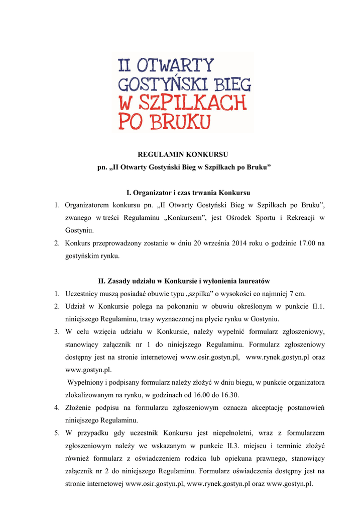REGULAMIN KONKURSU pn. „II Otwarty Gostyński Bieg w Szpilkach po Bruku” I. Organizator i czas trwania Konkursu 1. Organizatorem konkursu pn. „II Otwarty Gostyński Bieg w Szpilkach po Bruku”, zwanego w treści Regulaminu „Konkursem”, jest Ośrodek Sportu i Rekreacji w Gostyniu. 2. Konkurs przeprowadzony zostanie w dniu 20 września 2014 roku o godzinie 17.00 na gostyńskim rynku. II. Zasady udziału w Konkursie i wyłonienia laureatów 1. Uczestnicy muszą posiadać obuwie typu „szpilka” o wysokości co najmniej 7 cm. 2. Udział w Konkursie polega na pokonaniu w obuwiu określonym w punkcie II.1. niniejszego Regulaminu, trasy wyznaczonej na płycie rynku w Gostyniu. 3. W celu wzięcia udziału w Konkursie, należy wypełnić formularz zgłoszeniowy, stanowiący załącznik nr 1 do niniejszego Regulaminu. Formularz zgłoszeniowy dostępny jest na stronie internetowej www.osir.gostyn.pl, www.rynek.gostyn.pl oraz www.gostyn.pl. Wypełniony i podpisany formularz należy złożyć w dniu biegu, w punkcie organizatora zlokalizowanym na rynku, w godzinach od 16.00 do 16.30. 4. Złożenie podpisu na formularzu zgłoszeniowym oznacza akceptację postanowień niniejszego Regulaminu. 5. W przypadku gdy uczestnik Konkursu jest niepełnoletni, wraz z formularzem zgłoszeniowym należy we wskazanym w punkcie II.3. miejscu i terminie złożyć również formularz z oświadczeniem rodzica lub opiekuna prawnego, stanowiący załącznik nr 2 do niniejszego Regulaminu. Formularz oświadczenia dostępny jest na stronie internetowej www.osir.gostyn.pl, www.rynek.gostyn.pl oraz www.gostyn.pl. 6. Każdy z uczestników Konkursu po przybyciu na rynek, musi zgłosić swoją obecność i gotowość do startu w punkcie organizatora, gdzie otrzyma numer startowy. 7. Warunkiem przeprowadzenia Konkursu jest zgłoszenie się w punkcie organizatora minimum 5 uczestników. 8. Jednorazowo na wytyczonej trasie, o której mowa w punkcie II.2. Regulaminu, rywalizuje do 5 uczestników. 9. W przypadku zgłoszenia się na starcie więcej niż 5 uczestników, formułę przeprowadzenia eliminacji i biegu finałowego określi organizator, informując uczestników o ustalonej formule przed rozpoczęciem Konkursu. 10. Organizator Konkursu nie ponosi odpowiedzialności w przypadku doznania uszczerbku na zdrowiu przez uczestnika Konkursu, wskutek udziału w Konkursie. III. Laureaci i nagrody 1. Zwycięzcą Konkursu będzie uczestnik, który w biegu finałowym pokona trasę, o której mowa w punkcie II.2. Regulaminu, w obuwiu określonym w punkcie II.1. Regulaminu. 2. Ustanawia się trzy nagrody główne dla uczestników, którzy zajmą kolejno: pierwsze, drugie i trzecie miejsce. 3. Wręczenie nagród laureatom nastąpi bezpośrednio po zakończeniu Konkursu. 4. Za przeprowadzenie Konkursu odpowiada organizator. IV. Postanowienia końcowe 1. Regulamin Konkursu jest dostępny na stronie internetowej www.osir.gostyn.pl, www.rynek.gostyn.pl oraz www.gostyn.pl. 2. Z udziału w Konkursie wykluczeni są pracownicy Ośrodka Sportu i Rekreacji w Gostyniu, Urzędu Miejskiego w Gostyniu i członkowie ich rodzin. 3. Organizator ma prawo do zmiany podziału nagród. 4. W kwestiach nieuregulowanych postanowieniami niniejszego Regulaminu gremium uprawnionym do podjęcia wiążącej decyzji jest organizator. Formularz zgłoszeniowy (PROSZĘ WYPEŁNIĆ DRUKOWANYMI LITERAMI) Imię Nazwisko Data urodzenia Adres zamieszkania (miejscowość, ulica) Telefon kontaktowy Zgłaszam gotowość udziału w II Otwartym Gostyńskim Biegu w Szpilkach po Bruku, organizowanym w „Gostyńskim Dniu bez Samochodu” – w sobotę 20 września 2014 r. Oświadczam, że akceptuję postanowienia Regulaminu Konkursu pn. „II Otwarty Gostyński Bieg w Szpilkach po Bruku”. Przyjmuję do wiadomości, iż Organizator Konkursu nie ponosi odpowiedzialności w przypadku doznania przeze mnie uszczerbku na zdrowiu wskutek udziału w Konkursie. Wyrażam zgodę na umieszczenie danych osobowych w bazie danych Organizatora Konkursu oraz przetwarzanie ich, zgodnie z ustawą z dnia 29 sierpnia 1997 roku o ochronie danych osobowych (tekst jednolity Dz. U. z 2014 r., poz. 1182), dla potrzeb związanych z przeprowadzeniem niniejszego Konkursu i w związku z jego rozstrzygnięciem. Wyrażam zgodę na przetwarzanie danych osobowych na wyżej określonych zasadach. ………........................................................ (podpis) ………………………………, dnia …………… 2014 r. miejscowość dzień i miesiąc Oświadczenie rodzica/opiekuna prawnego* (PROSZĘ WYPEŁNIĆ DRUKOWANYMI LITERAMI) ZGODA na udział w Konkursie pn. „II Otwarty Gostyński Bieg w Szpilkach po Bruku” Ja niżej podpisany/a, ............................................................................................................ jako (imię i nazwisko wypełniającego załącznik) rodzic/opiekun prawny* ........................................................................................................... (imię i nazwisko uczestnika Konkursu) wyrażam zgodę na udział dziecka w Konkursie pn. „II Otwarty Gostyński Bieg w Szpilkach po Bruku”. Oświadczam, że zapoznałem/am się z Regulaminem Konkursu i akceptuję wszystkie jego postanowienia. ....................................................... (podpis rodzica lub opiekuna prawnego) ………………………………, dnia …………… 2014 r. miejscowość ---------------*) niepotrzebne skreślić dzień i miesiąc