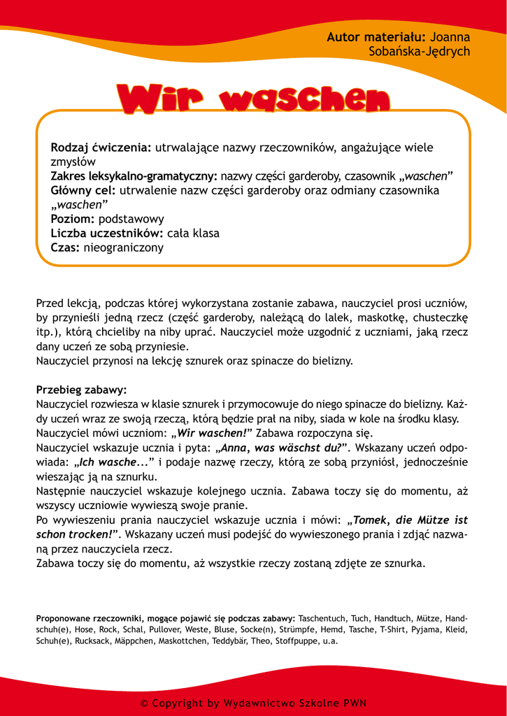Autor materiału: Joanna Sobańska-Jędrych Wir waschen Rodzaj ćwiczenia: utrwalające nazwy rzeczowników, angażujące wiele zmysłów Zakres leksykalno-gramatyczny: nazwy części garderoby, czasownik „waschen” Główny cel: utrwalenie nazw części garderoby oraz odmiany czasownika „waschen” Poziom: podstawowy Liczba uczestników: cała klasa Czas: nieograniczony Przed lekcją, podczas której wykorzystana zostanie zabawa, nauczyciel prosi uczniów, by przynieśli jedną rzecz (część garderoby, należącą do lalek, maskotkę, chusteczkę itp.), którą chcieliby na niby uprać. Nauczyciel może uzgodnić z uczniami, jaką rzecz dany uczeń ze sobą przyniesie. Nauczyciel przynosi na lekcję sznurek oraz spinacze do bielizny. Przebieg zabawy: Nauczyciel rozwiesza w klasie sznurek i przymocowuje do niego spinacze do bielizny. Każdy uczeń wraz ze swoją rzeczą, którą będzie prał na niby, siada w kole na środku klasy. Nauczyciel mówi uczniom: „Wir waschen!” Zabawa rozpoczyna się. Nauczyciel wskazuje ucznia i pyta: „Anna, was wäschst du?”. Wskazany uczeń odpowiada: „Ich wasche...” i podaje nazwę rzeczy, którą ze sobą przyniósł, jednocześnie wieszając ją na sznurku. Następnie nauczyciel wskazuje kolejnego ucznia. Zabawa toczy się do momentu, aż wszyscy uczniowie wywieszą swoje pranie. Po wywieszeniu prania nauczyciel wskazuje ucznia i mówi: „Tomek, die Mütze ist schon trocken!”. Wskazany uczeń musi podejść do wywieszonego prania i zdjąć nazwaną przez nauczyciela rzecz. Zabawa toczy się do momentu, aż wszystkie rzeczy zostaną zdjęte ze sznurka. Proponowane rzeczowniki, mogące pojawić się podczas zabawy: Taschentuch, Tuch, Handtuch, Mütze, Handschuh(e), Hose, Rock, Schal, Pullover, Weste, Bluse, Socke(n), Strümpfe, Hemd, Tasche, T-Shirt, Pyjama, Kleid, Schuh(e), Rucksack, Mäppchen, Maskottchen, Teddybär, Theo, Stoffpuppe, u.a. © Copyright by Wydawnictwo Szkolne PWN