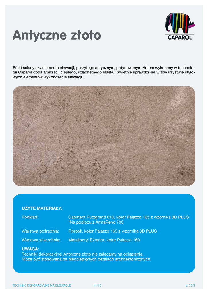 Antyczne złoto Efekt ściany czy elementu elewacji, pokrytego antycznym, patynowanym złotem wykonany w technologii Caparol doda aranżacji ciepłego, szlachetnego blasku. Świetnie sprawdzi się w towarzystwie stylowych elementów wykończenia elewacji. UŻYTE MATERIAŁY: Podkład: Capatect Putzgrund 610, kolor Palazzo 165 z wzornika 3D PLUS *Na podłożu z ArmaReno 700 Warstwa pośrednia: Fibrosil, kolor Palazzo 165 z wzornika 3D PLUS Warstwa wierzchnia: Metallocryl Exterior, kolor Palazzo 160 UWAGA: Techniki dekoracyjnej Antyczne złoto nie zalecamy na ocieplenie. Może być stosowana na nieocieplonych detalach architektonicznych. TECHNIKI DEKORACYJNE NA ELEWACJĘ 11/16 s. 23/2 Antyczne złoto krok po kroku KROK 1 Za pomocą wałka nałożyć farbę podkładową Capatect Putzgrund 610 w kolorze Palazzo 165 (wzornik 3D PLUS). KROK 2 Po wyschnięciu farby, za pomocą pacy nanieść Fibrosil w kolorze Palazzo 165 (wzornik 3D PLUS). KROK 3 Następnie pędzlem wymodelować całą powierzchnię. KROK 4 Po wyschnięciu nałożyć pędzlem farbę Metallocryl Exterior, kolor Palazzo 160 (metodą „mokre w mokre”). Poznaj pozostałe techniki dekoracji elewacji na www.caparol.pl TECHNIKI DEKORACYJNE NA ELEWACJĘ 11/16 s. 24/2