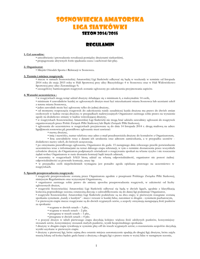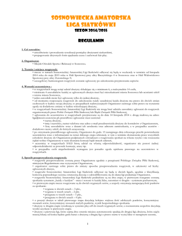 Sosnowiecka amatorska lIGA SIATKÓWKI SEZON 2014/2015 REGULAMIN 1. Cel zawodów: • umożliwienie i prowadzenie rywalizacji pomiędzy drużynami siatkarskimi, • propagowanie aktywnych form spędzania czasu i zachowań fair-play. 2. Organizator: • Miejski Ośrodek Sportu i Rekreacji w Sosnowcu. 3. Termin i miejsce rozgrywek: • mecze w ramach Sosnowieckiej Amatorskiej Ligi Siatkówki odbywać się będą w weekendy w terminie od listopada 2014 roku do maja 2015 roku w Hali Sportowej przy ulicy Baczyńskiego 4 w Sosnowcu oraz w Hali WidowiskowoSportowej przy ulicy Żeromskiego 9; • szczegółowy harmonogram rozgrywek zostanie ogłoszony po zakończeniu przyjmowania zapisów. 4. Warunki uczestnictwa : • w rozgrywkach mogą wziąć udział drużyny składające się z minimum 6, a maksymalnie 14 osób, • minimum 4 zawodników każdej ze zgłoszonych drużyn musi być mieszkańcami miasta Sosnowca lub uczniami szkół z terenu miasta Sosnowca, • jeden zawodnik może być zgłoszony tylko do jednej drużyny, • od momentu rozpoczęcia rozgrywek do zakończenia rundy zasadniczej każda drużyna ma prawo do dwóch zmian osobowych w kadrze swojej drużyny; w przypadkach nadzwyczajnych Organizator zastrzega sobie prawo na wyrażenie zgody na dodatkowe zmiany w kadrze wnioskującej drużyny, • w rozgrywkach Sosnowieckiej Amatorskiej Ligi Siatkówki nie mogą brać udziału zawodnicy zgłoszeni do rozgrywek organizowanych przez Polski Związek Piłki Siatkowej lub Śląski Związek Piłki Siatkowej, • zgłoszenia do uczestnictwa w rozgrywkach przyjmowane są do dnia 14 listopada 2014 r. drogą mailową na adres: [email protected]; prawidłowe zgłoszenie musi zawierać: • nazwę drużyny, • imię i nazwisko, numer telefonu oraz adres e-mail przedstawiciela drużyny do kontaktów z Organizatorem, • listę zawodników wraz z datami ich urodzenia oraz adresem zamieszkania, a w przypadku uczniów dodatkowo nazwy szkół, do których uczęszczają. • po otrzymaniu prawidłowego zgłoszenia, Organizator do godz. 15 następnego dnia roboczego prześle potwierdzenie uczestnictwa wraz z informacjami na temat dalszego etapu rekrutacji, w tym o terminie dostarczenia przez wszystkich członków drużyny do Organizatora podpisanych oświadczeń o rozgrywaniu spotkań na własne ryzyko i nie roszczeniu żądań wobec Organizatora w razie doznania kontuzji bądź innych zdarzeń, • uczestnicy w rozgrywkach SALS biorą udział na własną odpowiedzialność, organizator nie ponosi żadnej odpowiedzialności za powstałe kontuzje, urazy itp. • w przypadku osób niepełnoletnich wymagana jest ponadto zgoda opiekuna prawnego na uczestnictwo w rozgrywkach. 5. Sposób przeprowadzenia rozgrywek: • rozgrywki przeprowadzone zostaną przez Organizatora zgodnie z przepisami Polskiego Związku Piłki Siatkowej, niniejszym Regulaminem oraz wytycznymi Organizatora, • organizator zastrzega sobie prawo do zmiany sposobu przeprowadzenia rozgrywek, w zależności od liczby zgłoszonych drużyn, • rozgrywki Sosnowieckiej Amatorskiej Ligi Siatkówki odbywać się będą w dwóch ligach, zgodnie z klasyfikacją końcową poprzedniego sezonu; ostateczną decyzję o zakwalifikowaniu się do danej ligi podejmuje Organizator, • rozgrywki Sosnowieckiej Amatorskiej Ligi Siatkówki podzielone są na dwa etapy; w pierwszym rozegrane zostaną spotkania systemem „każdy z każdym” - mecz i rewanż w każdej lidze, natomiast w drugim - systemem pucharowym, • w pierwszym etapie mecze rozgrywane są do dwóch wygranych setów, a zespoły otrzymują następującą ilość punktów za spotkanie: • wygrana w dwóch setach – 3 pkt., • wygrana w trzech setach – 2 pkt. • przegrana w trzech setach – 1 pkt., • przegrana w dwóch setach – 0 pkt. • o pozycji drużyn w tabeli pierwszego etapu decydują kolejno: większa ilość zdobytych punktów, korzystniejszy stosunek setów, korzystniejszy stosunek małych punktów, wynik bezpośredniego spotkania. • drużyny w drugim etapie rywalizują w systemie play-off do trzech wygranych setów; o rozstawieniu zespołów decydują wyniki uzyskane w pierwszym etapie. • drużyny z pierwszej ligi, które zajmą dwa ostatnie miejsca automatycznie spadają do drugiej ligi; drużyna, która zajęła trzecią lokatę od końca będzie grała baraż z drużyną z drugiej ligi o prawo startu w wyżej lidze w następnym sezonie, 1 • warunkiem uczestnictwa zawodnika w spotkaniach drugiego etapu jest wystąpienie w co najmniej trzech meczach pierwszej fazy, • w przypadku niestawienia się zespołu w wyznaczonym terminie na mecz lub obecności zespołu niekompletnego (tj. mniej niż 6 osób), mecz wygrywa przeciwnik walkowerem, • Organizator zapewnia obsługę medyczną oraz sędziowską podczas rozgrywania spotkań. 6. Nagrody: • za miejsca 1-3 - puchary, medale i nagrody rzeczowe, • Organizator zastrzega sobie prawo do przyznania dodatkowych nagród. 7. Zasady finansowania, kary i opłaty: • warunkiem uczestnictwa jest wpłacenie Organizatorowi wpisowego w wysokości 100 zł (słownie: sto złotych) oraz kaucji w wysokości 400 zł (słownie: czterysta złotych) przez przedstawiciela drużyny; kaucja zostanie zwrócona po zakończeniu rozgrywek w całości lub pomniejszona o naliczone kary, opłat należy dokonać na rachunek bankowy MOSiR Sosnowiec o numerze: 87 1050 1360 1000 0008 0000 1646, • obowiązujące kary finansowe: • Organizator potrąci 100 zł (słownie: sto złotych) z kaucji za pierwszą przegraną walkowerem, • Organizator potrąci 100 zł (słownie: sto złotych) z kaucji za drugą przegraną walkowerem, • Organizator potrąci 200 zł (słownie: dwieście złotych) z kaucji za trzecią przegraną walkowerem. • obowiązujące kary niefinansowe: • w przypadku stwierdzenia faktu wystąpienia zawodnika nieuprawnionego do gry, drużyna zostaje ukarana walkowerem, • po trzecim walkowerze drużyna zostaje automatycznie wykluc