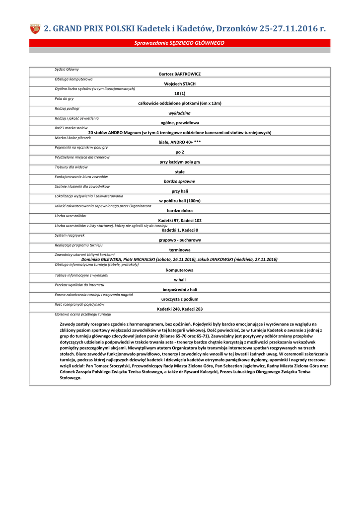 2. GRAND PRIX POLSKI Kadetek i Kadetów, Drzonków 25-27.11.2016 r. Sprawozdanie SĘDZIEGO GŁÓWNEGO Sędzia Główny Bartosz BARTKOWICZ Obsługa komputerowa Wojciech STACH Ogólna liczba sędziów (w tym licencjonowanych) 18 (1) Pola do gry całkowicie oddzielone płotkami (6m x 13m) Rodzaj podłogi wykładzina Rodzaj i jakość oświetlenia ogólne, prawidłowa Ilość i marka stołów 20 stołów ANDRO Magnum (w tym 4 treningowe oddzielone banerami od stołów turniejowych) Marka i kolor piłeczek białe, ANDRO 40+ *** Pojemniki na ręczniki w polu gry po 2 Wydzielone miejsca dla trenerów przy każdym polu gry Trybuny dla widzów stałe Funkcjonowanie biura zawodów bardzo sprawne Szatnie i łazienki dla zawodników przy hali Lokalizacja wyżywienia i zakwaterowania w poblizu hali (100m) Jakość zakwaterowania zapewnionego przez Organizatora bardzo dobra Liczba uczestników Kadetki 97, Kadeci 102 Liczba uczestników z listy startowej, którzy nie zgłosili się do turnieju Kadetki 1, Kadeci 0 System rozgrywek grupowo - pucharowy Realizacja programu turnieju terminowa Zawodnicy ukarani żółtymi kartkami Dominika GILEWSKA, Piotr MICHALSKI (sobota, 26.11.2016), Jakub JANKOWSKI (niedziela, 27.11.2016) Obsługa informatyczna turnieju (tabele, protokoły) komputerowa Tablice informacyjne z wynikami w hali Przekaz wyników do internetu bezpośredni z hali Forma zakończenia turnieju i wręczania nagród uroczysta z podium Ilość rozegranych pojedynków Kadetki 248, Kadeci 283 Opisowa ocena przebiegu turnieju Zawody zostały rozegrane zgodnie z harmonogramem, bez opóźnień. Pojedynki były bardzo emocjonujące i wyrównane ze względu na zbliżony poziom sportowy większości zawodników w tej kategorii wiekowej. Dość powiedzieć, że w turnieju Kadetek o awansie z jednej z grup do turnieju głównego zdecydował jeden punkt (bilanse 65-70 oraz 65-71). Zauważalny jest pozytywny odbiór zmiany przepisów dotyczących udzielania podpowiedzi w trakcie trwania seta - trenerzy bardzo chętnie korzystają z możliwości przekazania wskazówek pomiędzy poszczególnymi akcjami. Niewątpliwym atutem Organizatora była transmisja internetowa spotkań rozgrywanych na trzech stołach. Biuro zawodów funkcjonowało prawidłowo, trenerzy i zawodnicy nie wnosili w tej kwestii żadnych uwag. W ceremonii zakończenia turnieju, podczas której najlepszych dziewięć kadetek i dziewięciu kadetów otrzymało pamiątkowe dyplomy, upominki i nagrody rzeczowe wzięli udział: Pan Tomasz Sroczyński, Przewodniczący Rady Miasta Zielona Góra, Pan Sebastian Jagiełowicz, Radny Miasta Zielona Góra oraz Członek Zarządu Polskiego Związku Tenisa Stołowego, a także dr Ryszard Kulczycki, Prezes Lubuskiego Okręgowego Związku Tenisa Stołowego.