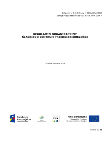 Załącznik nr 2 do Uchwały nr 1292/123/V/2016 Zarządu Województwa Śląskiego z dnia 28.06.2016 r. REGULAMIN ORGANIZACYJNY ŚLĄSKIEGO CENTRUM PRZEDSIĘBIORCZOŚCI Chorzów, czerwiec 2016 Strona 1 z 19 Spis treści Rozdział I Postanowienia ogólne .........................................................................................2 Rozdział II Zakres działania i zadania Śląskiego Centrum Przedsiębiorczości .........................................................................................................................3 Rozdział III Wewnętrzna struktura Śląskiego Centrum Przedsiębiorczości.5 Rozdział IV Zakres działania Dyrektora............................................................................5 Rozdział V Zakres działania komórek organizacyjnych Śląskiego Centrum Przedsiębiorczości .........................................................................................................................6 Załącznik nr 1 Struktura organizacyjna Śląskiego Centrum Przedsiębiorczości .......................................................................................................................19 Rozdział I Postanowienia ogólne Strona 2 z 19 §1 1. Regulamin Organizacyjny Śląskiego Centrum Przedsiębiorczości, nazywany dalej „Regulaminem”, określa: 1) Zakres działania i zadania Śląskiego Centrum Przedsiębiorczości. 2) Wewnętrzną strukturę Śląskiego Centrum Przedsiębiorczości. 3) Zakres działania Dyrektora. 4) Zakresy działania komórek organizacyjnych, w tym wydziałów, zespołów i samodzielnych stanowisk. 2. Ilekroć w Regulaminie jest mowa o IZ RPO WSL oznacza to Instytucję Zarządzającą Regionalnym Programem Operacyjnym Województwa Śląskiego. §2 1. Śląskie Centrum Przedsiębiorczości zwane dalej „Centrum” jest wojewódzką samorządową jednostką organizacyjną w formie jednostki budżetowej, która pełni funkcję: - Instytucji Pośredniczącej II Stopnia we wdrażaniu RPO WSL 2007-2013, - Instytucji Pośredniczącej we wdrażaniu RPO WSL 2014-2020. 2. Centrum działa na podstawie następujących aktów prawnych: 1) Ustawy z dnia 27 sierpnia 2009r. o finansach publicznych (t. j. Dz. U. z 2013 r. poz. 885 z późniejszymi zmianami); 2) Ustawy z dnia 5 czerwca 1998r. o samorządzie województwa (t. j. Dz. U. z 2016 r. poz. 486); 3) Ustawy z dnia 6 grudnia 2006r. o zasadach prowadzenia polityki rozwoju (t. j. Dz. U. z 2016 r., poz. 383); 4) Ustawy z dnia 11 lipca 2014 r. o zasadach realizacji programów w zakresie polityki spójności finansowanych w perspektywie finansowej 2014-2020 (Dz. U. z 2016 r. poz. 217); 5) Statutu Śląskiego Centrum Przedsiębiorczości (uchwała Nr III/13/4/2007 Sejmiku Województwa Śląskiego z dnia 19 września 2007 roku z późniejszymi zmianami); 6) Porozumienia nr 115/RR/2007 z dn. 31 października 2007 r. w sprawie realizacji Regionalnego Programu Operacyjnego Województwa Śląskiego na lata 2007 – 2013 zawartego między Zarządem Województwa Śląskiego a Śląskim Centrum Przedsiębiorczości z późniejszymi zmianami. 7) Porozumienia nr 8/RR/2015 z dn. 16 marca 2015 r. w sprawie realizacji Regionalnego Programu Operacyjnego Województwa Śląskiego na lata 2014 – 2020 zawartego między Zarządem Województwa Śląskiego a Śląskim Centrum Przedsiębiorczości z późniejszymi zmianami. 8) Uchwały nr 972/340/IV/2014 Zarządu Województwa Śląskiego z dnia 27 maja 2014 r. w sprawie przyjęcia propozycji podziału zadań dla instytucji zaangażowanych w realizację Regionalnego Programu Operacyjnego Województwa Śląskiego na lata 2014-2020 z późniejszymi zmianami. 3. Nadzór nad działalnością Centrum sprawuje Zarząd Województwa Śląskiego. Rozdział II Zakres działania i zadania Śląskiego Centrum Przedsiębiorczości §3 1. Zakres działania Centrum określa Statut Śląskiego Centrum Przedsiębiorczości przyjmowany uchwałą Sejmiku Województwa Śląskiego. 2. Do zadań Centrum w ramach wdrażania Regionalnego Programu Operacyjnego Województwa Śląskiego (RPO WSL) na lata 2007-2013 w części Europejskiego Funduszu Rozwoju Regionalnego (EFRR) należą w szczególności: a) czynności w zakresie naboru i oceny projektów, b) czynności w zakresie przygotowania i podpisywania umów o dofinansowanie projektów, c) czynności w zakresie rozliczania projektów, d) czynności w zakresie procedur finansowych, e) czynności w zakresie monitorowania i sprawozdawczości, f) czynności w zakresie ewaluacji, Strona 3 z 19 g) h) i) j) k) l) m) czynności w zakresie kontroli, czynności w zakresie informacji i promocji, czynności w zakresie archiwizacji dokumentów, czynności w zakresie audytu, czynności w zakresie obsługi informatycznej, administracyjno-technicznej, czynności wynikające z przepisów prawa unijnego, krajowego i wytycznych ministerialnych, czynności w zakresie wprowadzania danych do systemów informatycznych zgodnie z dokumentami źródłowymi, n) czynności w zakresie wykrywania, raportowania i usuwania nieprawidłowości, o) czynności w zakresie odzyskiwania kwot nienależnie wypłaconych beneficjentom, w tym wydawania decyzji o zwrocie środków przekazanych na realizację projektów, o której mowa w przepisach o finansach publicznych oraz innych decyzji administracyjnych i innych rozstrzygnięć podejmowanych w toku postępowania administracyjnego, a także wykonywania obowiązków i uprawnień wierzyciela, p) czynności w zakresie poświadczania środków RPO WSL. 3. Do zadań Centrum powierzonych do realizacji w ramach Regionalnego Programu Operacyjnego Województwa Śląskiego na lata 2014-2020 (dalej: RPO WSL 2014-2020) w części Europejskiego Funduszu Rozwoju Regionalnego (EFRR) należą w szczególności: a) czynności w zakresie naboru wniosków o dofinansowanie oraz oceny i wyboru projektów, b) działania zmierzające do zapewnienia zgodności wyboru projektów z obowiązującymi w tym zakresie przepisami o