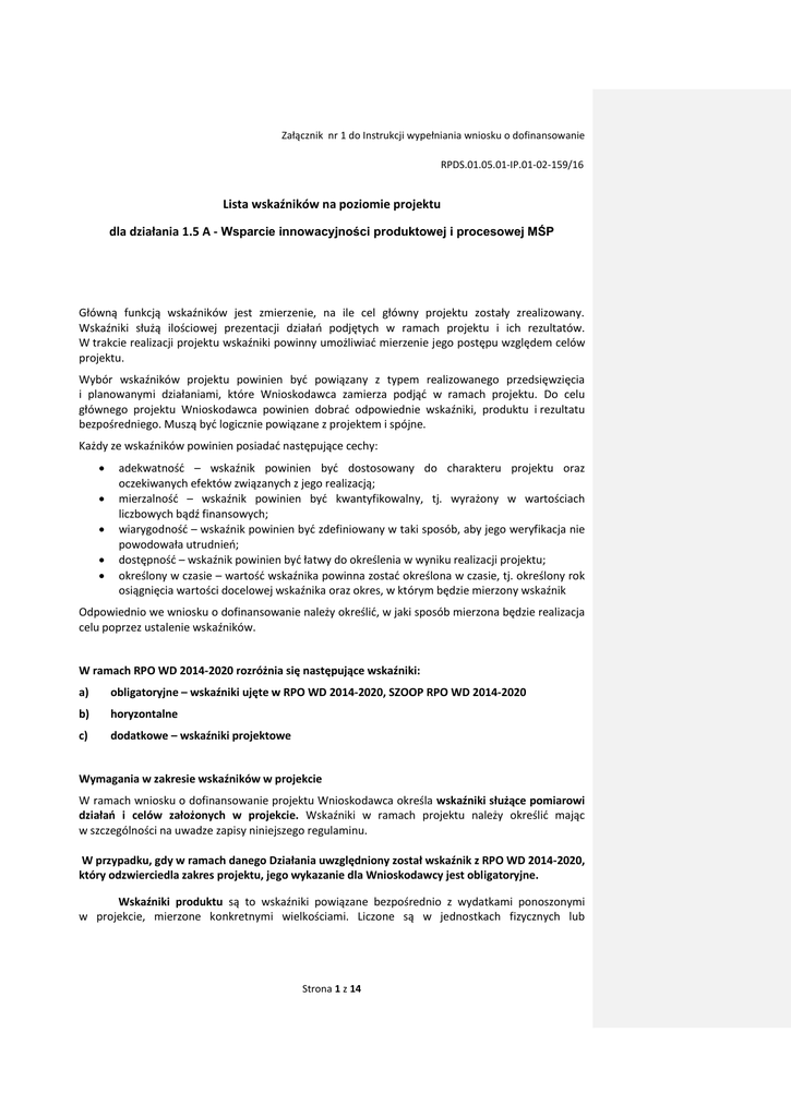 Załącznik nr 1 do Instrukcji wypełniania wniosku o dofinansowanie RPDS.01.05.01-IP.01-02-159/16 Lista wskaźników na poziomie projektu dla działania 1.5 A - Wsparcie innowacyjności produktowej i procesowej MŚP Główną funkcją wskaźników jest zmierzenie, na ile cel główny projektu zostały zrealizowany. Wskaźniki służą ilościowej prezentacji działań podjętych w ramach projektu i ich rezultatów. W trakcie realizacji projektu wskaźniki powinny umożliwiać mierzenie jego postępu względem celów projektu. Wybór wskaźników projektu powinien być powiązany z typem realizowanego przedsięwzięcia i planowanymi działaniami, które Wnioskodawca zamierza podjąć w ramach projektu. Do celu głównego projektu Wnioskodawca powinien dobrać odpowiednie wskaźniki, produktu i rezultatu bezpośredniego. Muszą być logicznie powiązane z projektem i spójne. Każdy ze wskaźników powinien posiadać następujące cechy: adekwatność – wskaźnik powinien być dostosowany do charakteru projektu oraz oczekiwanych efektów związanych z jego realizacją; mierzalność – wskaźnik powinien być kwantyfikowalny, tj. wyrażony w wartościach liczbowych bądź finansowych; wiarygodność – wskaźnik powinien być zdefiniowany w taki sposób, aby jego weryfikacja nie powodowała utrudnień; dostępność – wskaźnik powinien być łatwy do określenia w wyniku realizacji projektu; określony w czasie – wartość wskaźnika powinna zostać określona w czasie, tj. określony rok osiągnięcia wartości docelowej wskaźnika oraz okres, w którym będzie mierzony wskaźnik Odpowiednio we wniosku o dofinansowanie należy określić, w jaki sposób mierzona będzie realizacja celu poprzez ustalenie wskaźników. W ramach RPO WD 2014-2020 rozróżnia się następujące wskaźniki: a) obligatoryjne – wskaźniki ujęte w RPO WD 2014-2020, SZOOP RPO WD 2014-2020 b) horyzontalne c) dodatkowe – wskaźniki projektowe Wymagania w zakresie wskaźników w projekcie W ramach wniosku o dofinansowanie projektu Wnioskodawca określa wskaźniki służące pomiarowi działań i celów założonych w projekcie. Wskaźniki w ramach projektu należy określić mając w szczególności na uwadze zapisy niniejszego regulaminu. W przypadku, gdy w ramach danego Działania uwzględniony został wskaźnik z RPO WD 2014-2020, który odzwierciedla zakres projektu, jego wykazanie dla Wnioskodawcy jest obligatoryjne. Wskaźniki produktu są to wskaźniki powiązane bezpośrednio z wydatkami ponoszonymi w projekcie, mierzone konkretnymi wielkościami. Liczone są w jednostkach fizycznych lub Strona 1 z 14 Załącznik nr 1 do Instrukcji wypełniania wniosku o dofinansowanie RPDS.01.05.01-IP.01-02-159/16 monetarnych. Wybrane przez Wnioskodawcę wskaźniki muszą być adekwatne do zakresu projektu oraz mają być powiązane z głównymi kategoriami wydatków w projekcie. Dla każdego z wybranych wskaźników Wnioskodawca zobowiązany jest do wskazania „Jednostki miary”, „Wartości bazowej”, „Wartości docelowej wskaźnika”, a także „Źródła informacji o wskaźniku”. Wartość docelowa dla wskaźnika produktu to wyrażony liczbowo stan danego wskaźnika na moment zakończenia rzeczowej realizacji projektu. Jako źródło informacji o wskaźniku wskazać należy odpowiedni dokument (np. protokół odbioru robót). W ramach Działania 1.5 A określono poniższe wskaźniki produktu: Nazwa wskaźnika produktu Liczba przedsiębiorstw otrzymujących wsparcie Jednost ka miary [szt.] Definicja wskaźnika Number of enterprises receiving support in any form from Structural Funds (whether the support represents state aid or not). Enterprise: Organisation producing products or services to satisfy market needs in order to reach profit. The legal form of enterprise may be various (self-employed persons, partnerships, etc.). Wersja robocza: Liczba przedsiębiorstw otrzymujących wsparcie w każdej formie z Europejskiego Funduszu Rozwoju Regionalnego (niezależnie czy wsparcie stanowi pomoc publiczną, czy nie). Przedsiębiorstwo - podmiot gospodarczy wytwarzający dobra lub usługi dla zaspokojenia potrzeb zgłaszanych przez rynek, w celu osiągnięcia zysku. Przedsiębiorstwa mogą przyjmować różne formy prawne (osoba fizyczna wykonująca działalność gospodarczą, spółki, itp.). W przypadku, gdy beneficjentem pozostaje jeden podmiot, we wskaźniku należy ująć wartość „1”. W przypadku, gdy projekt jest realizowany przez partnerstwo podmiotów, w wartości wskaźnika należy ująć każdy z podmiotów wchodzących w skład partnerstwa. Wskaźnik „Liczba przedsiębiorstw otrzymujących wsparcie” występuje łącznie ze wskaźnikiem „Liczba przedsiębiorstw otrzymujących dotacje” oraz „Liczba przedsiębiorstw otrzymujących wsparcie finansowe inne niż dotacje”. Strona 2 z 14 Rodzaj dokumentu, w którym określono wskaźnik RPO WD 20142020 Załącznik nr 1 do Instrukcji wypełniania wniosku o dofinansowanie RPDS.01.05.01-IP.01-02-159/16 Liczba przedsiębiorstw otrzymujących dotacje [szt.] Number of enterprises receiving support in forms of non-refundable direct financial support conditional only to completion of project (grants). Subset of 'Number of enterprises receiving support' Wersja robocza: Liczba przedsiębiorstw otrzymujących wsparcie w formie bezpośredniego bezzwrotnego wsparcia finansowego pod warunkiem zakończenia projektu (dotacje). Podwskaźnik „Liczba przedsiębiorstw otrzymujących wsparcie”. RPO WD 20142020 Przedsiębiorstwo: w rozumieniu art. 1 zał. 1 Rozporządzenia Komisji Europejskiej nr 651/2014 z dnia 17 czerwca 2014 roku uznającego niektóre rodzaje pomocy za zgodne z rynkiem wewnętrznym z zastosowaniem art.107 i 108 Traktatu. W przypadku, gdy beneficjentem pozostaje jeden podmiot, we wskaźniku należy ująć wartość „1”. W przypadku, gdy projekt jest realizowany przez partnerstwo podmiotów, w wartości wskaźnika należy ująć ka