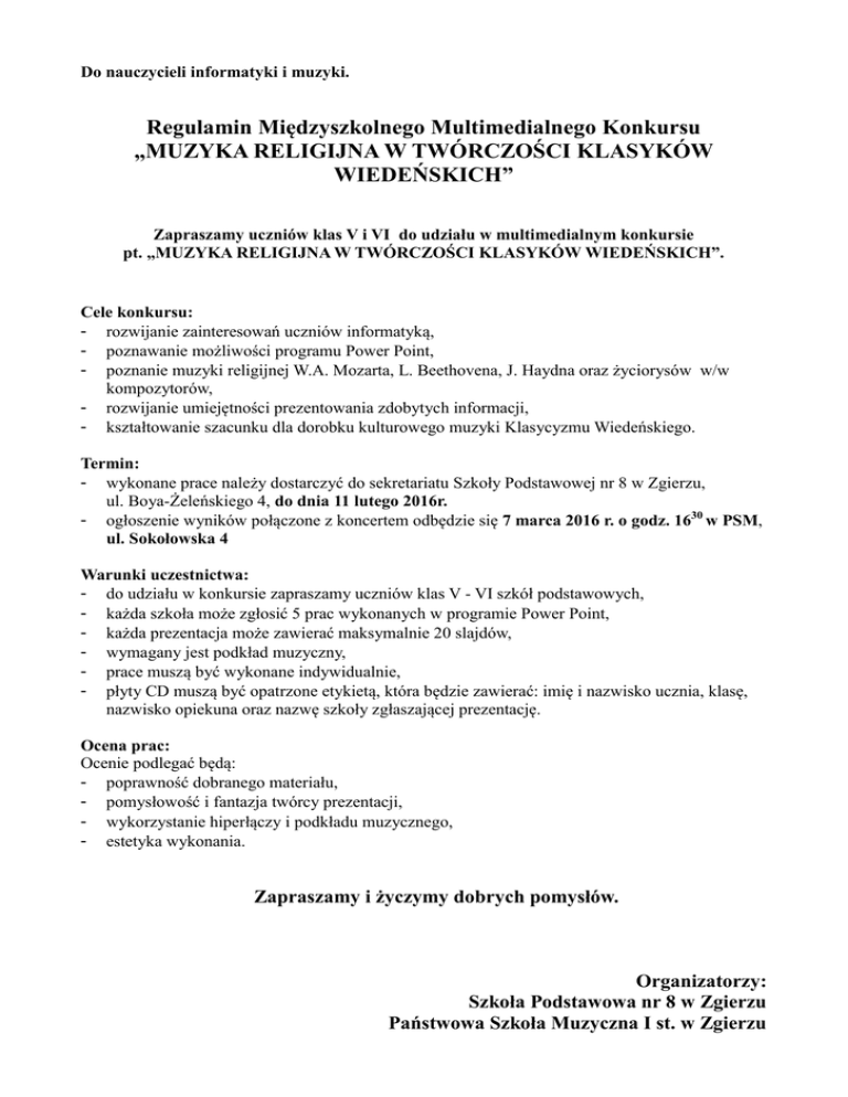 Do nauczycieli informatyki i muzyki. Regulamin Międzyszkolnego Multimedialnego Konkursu „MUZYKA RELIGIJNA W TWÓRCZOŚCI KLASYKÓW WIEDEŃSKICH” Zapraszamy uczniów klas V i VI do udziału w multimedialnym konkursie pt. „MUZYKA RELIGIJNA W TWÓRCZOŚCI KLASYKÓW WIEDEŃSKICH”. Cele konkursu: - rozwijanie zainteresowań uczniów informatyką, - poznawanie możliwości programu Power Point, - poznanie muzyki religijnej W.A. Mozarta, L. Beethovena, J. Haydna oraz życiorysów w/w kompozytorów, - rozwijanie umiejętności prezentowania zdobytych informacji, - kształtowanie szacunku dla dorobku kulturowego muzyki Klasycyzmu Wiedeńskiego. Termin: - wykonane prace należy dostarczyć do sekretariatu Szkoły Podstawowej nr 8 w Zgierzu, ul. Boya-Żeleńskiego 4, do dnia 11 lutego 2016r. - ogłoszenie wyników połączone z koncertem odbędzie się 7 marca 2016 r. o godz. 1630 w PSM, ul. Sokołowska 4 Warunki uczestnictwa: - do udziału w konkursie zapraszamy uczniów klas V - VI szkół podstawowych, - każda szkoła może zgłosić 5 prac wykonanych w programie Power Point, - każda prezentacja może zawierać maksymalnie 20 slajdów, - wymagany jest podkład muzyczny, - prace muszą być wykonane indywidualnie, - płyty CD muszą być opatrzone etykietą, która będzie zawierać: imię i nazwisko ucznia, klasę, nazwisko opiekuna oraz nazwę szkoły zgłaszającej prezentację. Ocena prac: Ocenie podlegać będą: - poprawność dobranego materiału, - pomysłowość i fantazja twórcy prezentacji, - wykorzystanie hiperłączy i podkładu muzycznego, - estetyka wykonania. Zapraszamy i życzymy dobrych pomysłów. Organizatorzy: Szkoła Podstawowa nr 8 w Zgierzu Państwowa Szkoła Muzyczna I st. w Zgierzu