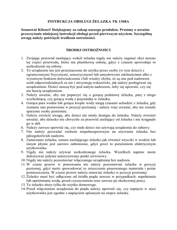 INSTRUKCJA OBSŁUGI ŻELAZKA TK 1368A Szanowni Klienci! Dziękujemy za zakup naszego produktu. Prosimy o uważne przeczytanie niniejszej instrukcji obsługi przed pierwszym użyciem. Szczególną uwagę należy poświęcić środkom ostrożności. ŚRODKI OSTROŻNOŚCI 1. Zwijając przewód zasilający wokół żelazka nigdy nie należy zaginać zbyt mocno tej części przewodu, która ma plastikową osłonę, gdyż z czasem spowoduje to uszkodzenie tej osłony. 2. To urządzenie nie jest przeznaczone do użytku przez osoby (w tym dzieci) z ograniczonymi fizycznymi, sensorycznymi lub umysłowymi zdolnościami albo z wyraźnym brakiem doświadczenia i/lub wiedzy chyba, że są one pod nadzorem osób odpowiedzialnych za nie i otrzymują wskazówki, jak należy posługiwać się urządzeniem. Dzieci muszą być pod stałym nadzorem, żeby się upewnić, czy się nie bawią urządzeniem. 3. Należy uważać, aby nie poparzyć się o gorącą podstawę żelazka, parę z niego wychodzącą, czy gorącą wodę z pojemnika w żelazku. 4. Gorąca para wodna lub gorące krople wody mogą czasami uchodzić z żelazka, gdy zostanie ono postawione w pozycji poziomej - należy więc uważać, aby nie zostały sparzone osoby postronne. 5. Należy zwrócić uwagę, aby dzieci nie miały dostępu do żelazka. Należy również uważać, aby dziecko nie chwyciło za przewód zasilający od żelazka i nie ściągnęło go w dół. 6. Należy zawsze upewnić się, czy małe dzieci nie używają urządzenia do zabawy. 7. Nie należy pozwalać osobom niepełnosprawnym na używanie żelazka bez jakiegokolwiek nadzoru. 8. Zanurzanie żelazka, sznura zasilającego żelazko jak również wtyczki w wodzie lub innym płynie jest surowo zabronione, gdyż grozi to porażeniem elektrycznym użytkownika. 9. Nigdy nie należy używać uszkodzonego żelazka. Wszelkich napraw może dokonywać jedynie autoryzowany punkt serwisowy. 10. Nigdy nie należy pozostawiać włączonego urządzenia bez nadzoru. 11. W czasie przerw w prasowaniu nie należy pozostawiać żelazka w pozycji poziomej, gdyż może spowodować to zniszczenie prasowanego materiału i pożar pomieszczenia. W czasie przerw należy ustawiać żelazko w pozycji poziomej. 12. Żelazko musi być odłączone od źródła prądu zawsze w przypadkach: napełniania lub opróżniania wodą, przed czyszczeniem oraz zawsze po skończonej pracy. 13. To żelazko służy tylko do użytku domowego. 14. Przed włączeniem urządzenia do prądu należy upewnić się, czy napięcie w sieci użytkownika jest zgodne z napięciem opisanym na stopce żelazka. INSTRUKCJA OBSŁUGI 1. Żelazko należy wyjąć z opakowania i usunąć z niego wszelkie nalepki. 2. Użytkownikowi nie wolno pozostawić bez nadzoru żelazka podłączonego do sieci zasilającej. 3. Przed pierwszym użyciem należy wypróbować pracę żelazka na kawałku niepotrzebnej tkaniny. 4. Żelazko musi być używane używane na stabilnej powierzchni i na taką musi być odstawiane. 5. Żelazko nie powinno być używane, jeżeli spadło, jeżeli ma widoczne ślady uszkodzenia, lub jeżeli wycieka z niego woda. 6. Przed podłączeniem żelazka do prądu należy napełnić je wodą. W tym celu należy: - postawić żelazko płasko, - ściągnąć gałkę spryskiwacza, - napełnić pojemnik żelazka wodą z kranu do maksymalnej wysokości zaznaczonej na zbiorniczku. - nie należy przekraczać maksymalnie dopuszczalnej ilości wody w zbiorniczku. - napełnienia należy dokonywać jedynie przy pomocy pojemniczka specjalnie do tego przeznaczonego. - należy używać jedynie wody z kranu, gdyż żelazko wyposażone jest w system uniemożliwiający powstawanie osadu wewnątrz urządzenia. Stosowanie innego rodzaju wody spowoduje uszkodzenie tego systemu. 7. Po skończeniu prasowania żelazko należy odłączyć od źródła prądu, ściągnąć gałkę spryskiwacza i wylać wodę, która pozostała po prasowaniu. 8. Gałkę spryskiwacza należy umieścić na swoim miejscu, a żelazko postawić w pozycji pionowej. WYBÓR WŁAŚCIWEJ TEMPERATURY Przed rozpoczęciem prasowania należy zawsze sprawdzić opis zalecanej przez producenta temperatury prasowania umieszczony na metce wszytej wewnątrz odzieży. Kropki oznaczające wysokość temperatury znajdujące się na metce wewnątrz odzieży należy dopasować do kropek umieszczonych na termostacie żelazka. Jeżeli wewnątrz odzieży nie znajdziemy informacji o zalecanej wysokości temperatury prasowania, wówczas należy stosować się do następujących reguł: • • • bawełna i len. • • wełna i jedwab, • materiały syntetyczne ( acryl, nylon, polyester ). Prasowanie należy zawsze rozpoczynać od najniższej temperatury, a potem stopniowo podnosić temperaturę do góry. Prasując według tej reguły użytkownik ponosi mniejsze ryzyko uszkodzenia odzieży przez żelazko, niż gdyby zaczynał prasowanie od wyższych temperatur ( żelazko bowiem potrzebuje więcej czasu na schłodzenie niż na ogrzanie ). Jeżeli materiał, z którego wykonana jest odzież, składa się z kilku rodzajów materiału ( np. z bawełny • • • i polyestru • ) - zawsze należy stosować niższą temperaturę. Wyboru właściwej temperatury dokonujemy za pomocą termostatu. - żelazko ustawiamy w pozycji pionowej; 2 - termostat obracamy w kierunku żądanej temperatury; - paląca się lampka kontrolna wskazuje na rozgrzewanie się urządzenia; - zgaśnięcie lampki kontrolnej oznacza osiągnięcie żądanej temperatury prasowania; SPRYSKIWANIE ODZIEŻY WODĄ Spryskiwanie odzieży wodą następuje po naciśnięciu gałki spryskiwacza. UDERZENIA PARY Uderzenia pary należy stosowa, gdy termostat żelazka ustawiony jest na wysokie temperatury tzn. • • •. Aby uzyskać strumień pary należy nacisnąć gałkę pary wodnej. Para będzie wydostawała się ze stopki żelazka przez 3 – 4 sekundy. Aby ponownie nacisnąć gałkę pary wodnej należy odczekać 4 sekundy. PRASOWANIE PR