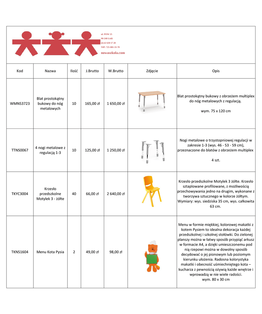 ul. POW 25 90-248 Łódź tel.42 630 17 28 NIP: 725-001-33-78 nowaszkola.com Kod Nazwa WMNS3723 Blat prostokątny bukowy do nóg metalowych TTNS0067 4 nogi metalowe z regulacją 1-3 Ilość 10 J.Brutto 165,00 zł W.Brutto 1 650,00 zł Zdjęcie Opis Blat prostokątny bukowy z obrzeżem multiplex do nóg metalowych z regulacją. wym. 75 x 120 cm 10 125,00 zł 1 250,00 zł Nogi metalowe o trzystopniowej regulacji w zakresie 1-3 (wys. 46 - 53 - 59 cm), przeznaczone do blatów z obrzeżem multiplex 4 szt. TKYC3004 TKNS1604 Krzesło przedszkolne Motylek 3 - żółte Menu Kota Pysia 40 2 66,00 zł 49,00 zł 2 640,00 zł Krzesło przedszkolne Motylek 3 żółte. Krzesło sztaplowane profilowane, z możliwością przechowywania jedno na drugim, wykonane z tworzywa sztucznego w kolorze żółtym. Wymiary: wys. siedziska 35 cm, wys. całkowita 63 cm. 98,00 zł Menu w formie miękkiej, kolorowej makatki z kotem Pysiem to idealna dekoracja każdej przedszkolnej i szkolnej stołówki. Do zielonej planszy można w łatwy sposób przypiąć arkusz w formacie A4, a dzięki umieszczonemu pod nią rzepowi można w dowolny sposób decydować o jej pionowym lub poziomym kierunku ułożenia. Radosna kolorystyka makatki i obecność uśmiechniętego kota – kucharza z pewnością ożywią każde wnętrze i wprowadzą w nie wiele radości. wym. 80 x 30 cm Kod TKPP0050 Nazwa Kucharz. Aplikacje na stołówkę Ilość 1 J.Brutto 50,00 zł W.Brutto Zdjęcie Opis 50,00 zł Aplikacje na stołówkę. Jadłospis z postacią uśmiechniętego kucharza, czapkami kucharskimi, garnkiem, patelnią oraz innymi atrybutami zwiazanymi z przygotowywaniem posiłów. Aplikacje można przymocować za pomocą taśmy, magnesów lub przyczepić pinezkami. 4 arkusze kredowanego lakierowanaego papieru o wym. 61 x 43 cm z 30 częściami do odseparowania. wiek: 3+ TTNS1362 Jadłospis Kota Pysia 1 42,00 zł 42,00 zł Znany wszystkim bohater Kot Pysio zaprasza do wspólnego posiłku… Nowa wygodna forma przedszkolnego jadłospisu. Duża magnetyczna tablica, do której w łatwy sposób, za pomocą magnesów, można przyczepić kartkę z menu na dany dzień. w zestawie dołączone 2 magnesy wym. 35 x 25 cm TKTP0007 Kosz na śmieci 25 l 2 36,00 zł 72,00 zł mix kolorów wybierany losowo (czerwony, niebieski, żółty, zielony, brązowy) 5 802,00 zł