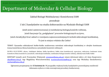 Zakład Biologii Molekularnej i Komórkowej UAM poszukuje 1 lub 2 kandydatów na studia doktoranckie na Wydziale Biologii UAM Jeżeli jesteś zainteresowana(-y) molekularną biologią komórki roślinnej, Jeżeli fascynuje Cię „podglądanie” procesów biologicznych na żywo, Jeżeli chciał(a)byś brać udział w rozwijaniu najnowocześniejszych technik mikroskopii konfokalnej, To jest to miejsce właśnie dla Ciebie! TEMAT: Dynamika oddziaływań białko-białko analizowana metodami mikroskopii konfokalnej w obrębie kontinuum ściana komórkowa-błona komórkowa-cytoszkielet komórek roślinnych SŁOWA KLUCZOWE: aktyna, Arabidopsis thaliana, białka łącznikowe, białka ścian komórkowych, egzocytoza, endocytoza, kontinuum ściana komórkowa-błona komórkowa-cytoszkielet, mikroskopia konfokalna, molekularna biologia komórki roślinnej, oddziaływania białko-białko KONTAKT (email): prof. Przemysław Wojtaszek: [email protected]; więcej informacji także u dr Anny Kasprowicz: [email protected], mgr Magdaleny Wierzchowieckiej: [email protected], oraz mgr Michaliny Smolarkiewicz: [email protected] Zgłoszenia przyjmujemy do 15 kwietnia br. W przypadku większej liczby kandydatów przewidujemy możliwość dokonania wyboru w toku wewnętrznej procedury konkursowej.