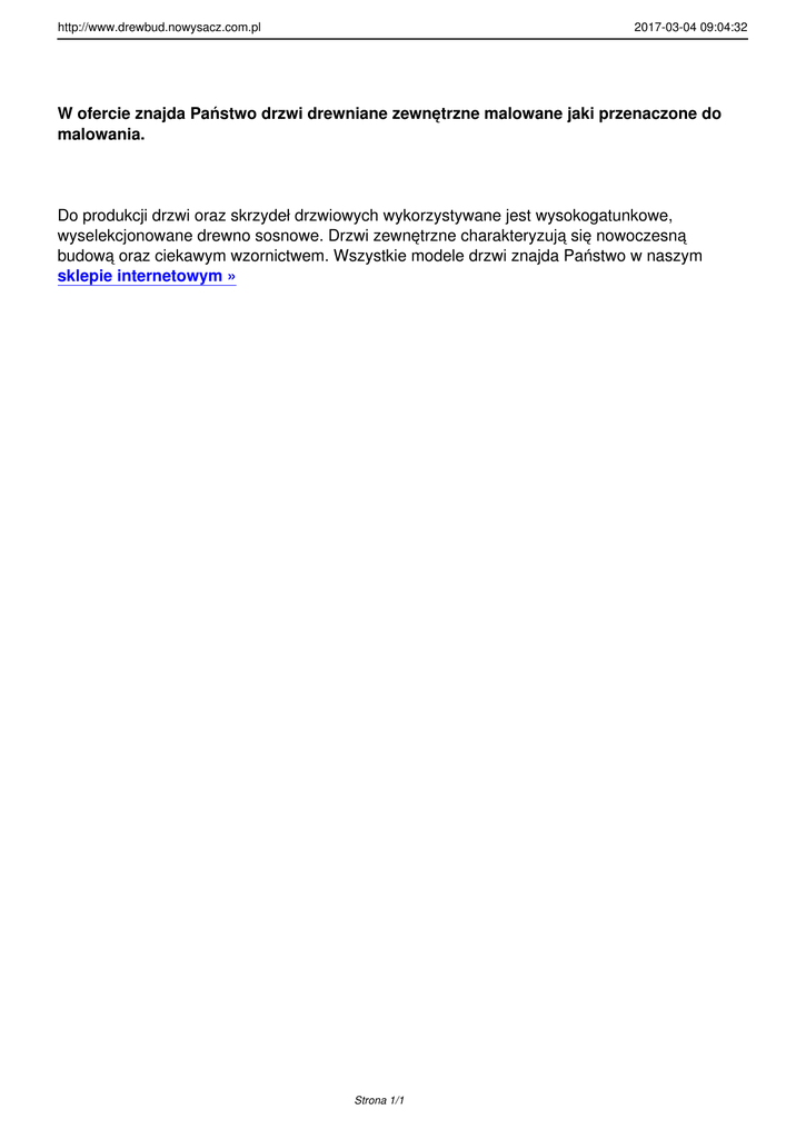 http://www.drewbud.nowysacz.com.pl 2017-03-04 09:04:32 W ofercie znajda Państwo drzwi drewniane zewnętrzne malowane jaki przenaczone do malowania. Do produkcji drzwi oraz skrzydeł drzwiowych wykorzystywane jest wysokogatunkowe, wyselekcjonowane drewno sosnowe. Drzwi zewnętrzne charakteryzują się nowoczesną budową oraz ciekawym wzornictwem. Wszystkie modele drzwi znajda Państwo w naszym sklepie internetowym » Strona 1/1