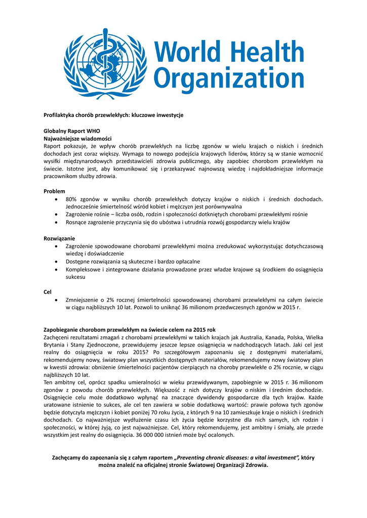 Profilaktyka chorób przewlekłych: kluczowe inwestycje Globalny Raport WHO Najważniejsze wiadomości Raport pokazuje, że wpływ chorób przewlekłych na liczbę zgonów w wielu krajach o niskich i średnich dochodach jest coraz większy. Wymaga to nowego podejścia krajowych liderów, którzy są w stanie wzmocnić wysiłki międzynarodowych przedstawicieli zdrowia publicznego, aby zapobiec chorobom przewlekłym na świecie. Istotne jest, aby komunikować się i przekazywać najnowszą wiedzę i najdokładniejsze informacje pracownikom służby zdrowia. Problem  80% zgonów w wyniku chorób przewlekłych dotyczy krajów o niskich i średnich dochodach. Jednocześnie śmiertelność wśród kobiet i mężczyzn jest porównywalna  Zagrożenie rośnie – liczba osób, rodzin i społeczności dotkniętych chorobami przewlekłymi rośnie  Rosnące zagrożenie przyczynia się do ubóstwa i utrudnia rozwój gospodarczy wielu krajów Rozwiązanie  Zagrożenie spowodowane chorobami przewlekłymi można zredukować wykorzystując dotychczasową wiedzę i doświadczenie  Dostępne rozwiązania są skuteczne i bardzo opłacalne  Kompleksowe i zintegrowane działania prowadzone przez władze krajowe są środkiem do osiągnięcia sukcesu Cel  Zmniejszenie o 2% rocznej śmiertelności spowodowanej chorobami przewlekłymi na całym świecie w ciągu najbliższych 10 lat. Pozwoli to uniknąć 36 milionom przedwczesnych zgonów w 2015 r. Zapobieganie chorobom przewlekłym na świecie celem na 2015 rok Zachęceni rezultatami zmagań z chorobami przewlekłymi w takich krajach jak Australia, Kanada, Polska, Wielka Brytania i Stany Zjednoczone, przewidujemy jeszcze lepsze osiągnięcia w nadchodzących latach. Jaki cel jest realny do osiągnięcia w roku 2015? Po szczegółowym zapoznaniu się z dostępnymi materiałami, rekomendujemy nowy, światowy plan wszystkich dostępnych materiałów, rekomendujemy nowy światowy plan w kwestii zdrowia: obniżenie śmiertelności pacjentów cierpiących na choroby przewlekłe o 2% rocznie, w ciągu najbliższych 10 lat. Ten ambitny cel, oprócz spadku umieralności w wieku przewidywanym, zapobiegnie w 2015 r. 36 milionom zgonów z powodu chorób przewlekłych. Większość z nich dotyczy krajów o niskim i średnim dochodzie. Osiągnięcie celu może dodatkowo wpłynąć na znaczące dywidendy gospodarcze dla tych krajów. Każde uratowane istnienie to sukces, ale cel ten zawiera w sobie dodatkową wartość: prawie połowa tych zgonów będzie dotyczyła mężczyzn i kobiet poniżej 70 roku życia, z których 9 na 10 zamieszkuje kraje o niskich i średnich dochodach. Co najważniejsze wydłużenie czasu ich życia będzie korzystne dla nich samych, ich rodzin i społeczności, w której żyją, co jest najważniejsze. Cel, który rekomendujemy, jest ambitny i śmiały, ale przede wszystkim jest realny do osiągnięcia. 36 000 000 istnień może być ocalonych. Zachęcamy do zapoznania się z całym raportem „Preventing chronic diseases: a vital investment”, który można znaleźć na oficjalnej stronie Światowej Organizacji Zdrowia.