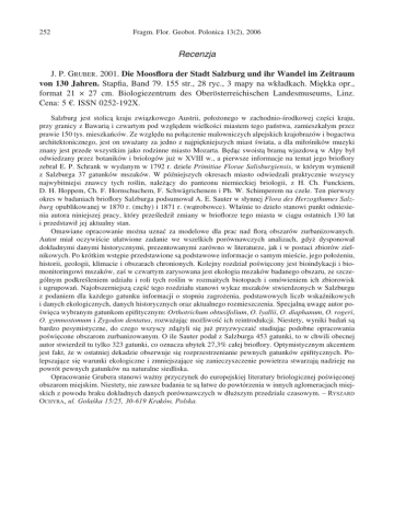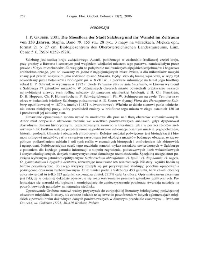 252 Fragm. Flor. Geobot. Polonica 13(2), 2006 Recenzja J. P. GRUBER. 2001. Die Moosflora der Stadt Salzburg und ihr Wandel im Zeitraum von 130 Jahren. Stapfia, Band 79. 155 str., 28 ryc., 3 mapy na wkładkach. Miękka opr., format 21 × 27 cm. Biologiezentrum des Oberösterreichischen Landesmuseums, Linz. Cena: 5 €. ISSN 0252-192X. Salzburg jest stolicą kraju związkowego Austrii, położonego w zachodnio-środkowej części kraju, przy granicy z Bawarią i czwartym pod względem wielkości miastem tego państwa, zamieszkałym przez prawie 150 tys. mieszkańców. Ze względu na połączenie malowniczych alpejskich krajobrazów i bogactwa architektonicznego, jest on uważany za jedno z najpiękniejszych miast świata, a dla miłośników muzyki znany jest przede wszystkim jako rodzinne miasto Mozarta. Będąc swoistą bramą wjazdową w Alpy był odwiedzany przez botaników i briologów już w XVIII w., a pierwsze informacje na temat jego brioflory zebrał E. P. Schrank w wydanym w 1792 r. dziele Primitiae Florae Salisburgiensis, w którym wymienił z Salzburga 37 gatunków mszaków. W późniejszych okresach miasto odwiedzali praktycznie wszyscy najwybitniejsi znawcy tych roślin, należący do panteonu niemieckiej briologii, z H. Ch. Funckiem, D. H. Hoppem, Ch. F. Hornschuchem, F. Schwägrichenem i Ph. W. Schimperem na czele. Ten pierwszy okres w badaniach brioflory Salzburga podsumował A. E. Sauter w słynnej Flora des Herzogthumes Salzburg opublikowanej w 1870 r. (mchy) i 1871 r. (wątrobowce). Właśnie to dzieło stanowi punkt odniesienia autora niniejszej pracy, który prześledził zmiany w brioflorze tego miasta w ciągu ostatnich 130 lat i przedstawił jej aktualny stan. Omawiane opracowanie można uznać za modelowe dla prac nad florą obszarów zurbanizowanych. Autor miał oczywiście ułatwione zadanie we wszelkich porównawczych analizach, gdyż dysponował dokładnymi danymi historycznymi, prezentowanymi zarówno w literaturze, jak i w postaci zbiorów zielnikowych. Po krótkim wstępie przedstawione są podstawowe informacje o samym mieście, jego położeniu, historii, geologii, klimacie i obszarach chronionych. Kolejny rozdział poświęcony jest bioindykacji i biomonitoringowi mszaków, zaś w czwartym zarysowana jest ekologia mszaków badanego obszaru, ze szczególnym podkreśleniem udziału i roli tych roślin w rozmaitych biotopach i omówieniem ich zbiorowisk i ugrupowań. Najobszerniejszą część tego rozdziału stanowi wykaz mszaków stwierdzonych w Salzburgu z podaniem dla każdego gatunku informacji o stopniu zagrożenia, podstawowych liczb wskaźnikowych i danych ekologicznych, danych historycznych oraz aktualnego rozmieszczenia. Specjalną uwagę autor poświęca wybranym gatunkom epifitycznym: Orthotrichum obtusifolium, O. lyallii, O. diaphanum, O. rogeri, O. gymnostomum i Zygodon dentatus, rozważając możliwość ich reintrodukcji. Niestety, wyniki badań są bardzo pesymistyczne, do czego wszyscy zdążyli się już przyzwyczaić studiując podobne opracowania poświęcone obszarom zurbanizowanym. O ile Sauter podał z Salzburga 453 gatunki, to w chwili obecnej autor stwierdził tu tylko 323 gatunki, co oznacza ubytek 27,3% całej brioflory. Optymistycznym akcentem jest fakt, że w ostatniej dekadzie obserwuje się rozprzestrzenianie pewnych gatunków epifitycznych. Polepszające się warunki ekologiczne i zmniejszające się zanieczyszczenie powietrza stwarzają nadzieję na powrót pewnych gatunków na naturalne siedliska. Opracowanie Grubera stanowi ważny przyczynek do europejskiej literatury briologicznej poświęconej obszarom miejskim. Niestety, nie zawsze badania te są łatwe do powtórzenia w innych aglomeracjach miejskich z powodu braku dokładnych danych porównawczych w dłuższym przedziale czasowym. – RYSZARD OCHYRA, ul. Gołaśka 15/25, 30-619 Kraków, Polska.