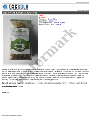 Informacje o produkcie Utworzono 04-03-2017 Green Plant Rumianek Kwiat 40g Cena : 3,50 zł at er m ar k Producent : Green Plant Dostępność : Dostępny Stan magazynowy : bardzo wysoki Średnia ocena : brak recenzji w Rumianek pospolity wykazuje działanie przeciwzapalne, rozkurczające mięśnie gładkie, przyspieszające gojenie się ran, dezodoryzujące, przeciwbakteryjne i neutralizujące toksyny bakteryjne, pobudzające przemianę materii w skórze. Koszyczki rumianku stosuje się wewnętrznie w skurczach i stanach zapalnych żołądka i jelit. Zewnętrznie stosuje się je przy stanach zapalnych skóry i błon śluzowych, bakteryjnych schorzeniach skóry i jamy ustnej, ranach, oparzeniach i owrzodzeniach, alergiach skórnych, stanach zapalnych dróg oddechowych (w postaci inhalacji). Stosowany jako płukanka świetnie wpływa na kondycję włosów. Sposób parzenia naparu:1 łyżkę kwiatów rumianku zalać szklanką wrzątku. Nakryć i odstawić na ok. 8 minut. Kraj Pochodzenia: Polska Waga: 40g Wygenerowano w programie www.oscGold.com