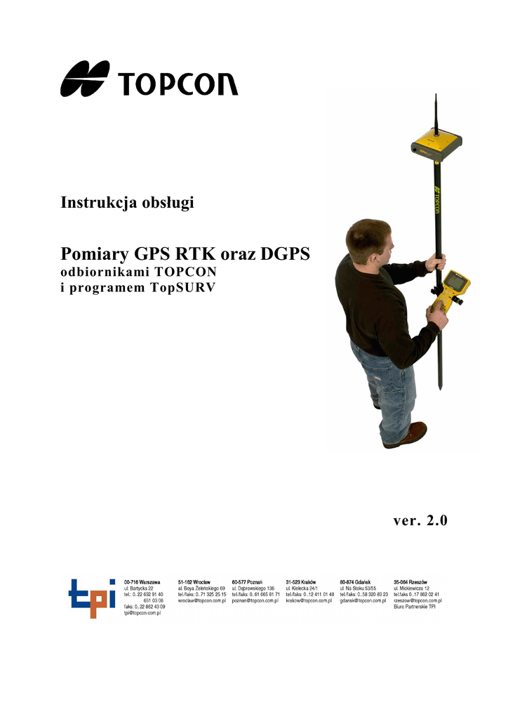 Instrukcja obsługi Pomiary GPS RTK oraz DGPS odbiornikami TOPCON i programem TopSURV ver. 2.0 SPIS TREŚCI 1.Wstęp......................................................................................................................................................................3 1.1 . Instalacja programu TopSURV.................................................................................................................... 3 1.2 Usuwanie programu TopSURV......................................................................................................................6 1.3 Ponowne zainstalowanie programu po resecie palmtopa ............................................................................. 6 1.4 Kody programu..............................................................................................................................................6 2. Przygotowanie do pracy........................................................................................................................................ 8 2.1 Charakterystyka pomiarów GPS RTK i DGPS..............................................................................................8 2.2 Odbiornik i kontroler....................................................................................................................................8 2.3 Zasilanie.......................................................................................................................................................9 2.4 Reset odbiornika i kontrolera......................................................................................................................10 3. Nowa robota ....................................................................................................................................................... 11 3.1 Konfiguracja pomiarów GPS........................................................................................................................15 4.Operacje na danych.............................................................................................................................................. 20 4.1 Dodawanie i edytowanie punktów................................................................................................................20 4.2 Dodawanie i edycja kodów...........................................................................................................................21 4.3 Dane obserwacyjne.......................................................................................................................................21 4.4 Lista Punktów............................................................................................................................................... 22 5.Import i eksport.................................................................................................................................................... 24 5.1 Import........................................................................................................................................................... 24 5.1.1. Import z roboty.................................................................................................................................... 24 5.1.2 Import z pliku....................................................................................................................................... 24 5.1.3 Import z drugiego kontrolera................................................................................................................ 26 5.2 Eksport..........................................................................................................................................................26 5.2.1Eksport do roboty.................................................................................................................................. 26 5.2.2Eksport do pliku.....................................................................................................................................27 5.2.3Eksport do drugiego kontrolera............................................................................................................. 28 6.Wykonywanie pomiarów......................................................................................................................................29 6.1 Przygotowanie pomiaru................................................................................................................................ 29 6.2 Status............................................................................................................................................................ 29 6.3 Lokalizacja .................................................................................................................................................. 31 6.4 Start stacji bazowej.......................................................................................................................................32 6.5 Pomiary ........................................................................................................................................................33 6.6 Pomiar automatyczny................................................................................................................................... 34 6.7 Pomiary punktów niedostępnych (ofset)...................................................................................................... 35 6.7.1Ofset liniowy - Prosta............................................................................................................................ 35 6.7.2Ofset kątowy – Az Odl ......................................................................................................................... 36 6.8 Współpraca z zestawem mmGPS.....................................................................................................................37 7.Tyczenie....................
