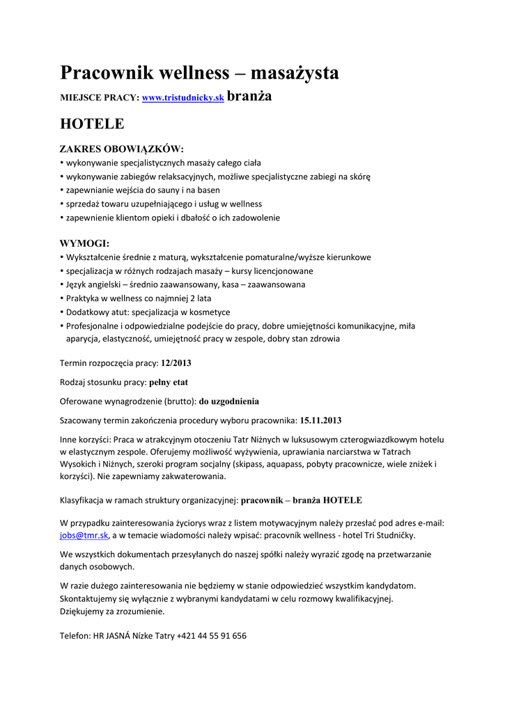 Pracownik wellness – masażysta MIEJSCE PRACY: www.tristudnicky.sk branża HOTELE ZAKRES OBOWIĄZKÓW: • wykonywanie specjalistycznych masaży całego ciała • wykonywanie zabiegów relaksacyjnych, możliwe specjalistyczne zabiegi na skórę • zapewnianie wejścia do sauny i na basen • sprzedaż towaru uzupełniającego i usług w wellness • zapewnienie klientom opieki i dbałość o ich zadowolenie WYMOGI: • Wykształcenie średnie z maturą, wykształcenie pomaturalne/wyższe kierunkowe • specjalizacja w różnych rodzajach masaży – kursy licencjonowane • Język angielski – średnio zaawansowany, kasa – zaawansowana • Praktyka w wellness co najmniej 2 lata • Dodatkowy atut: specjalizacja w kosmetyce • Profesjonalne i odpowiedzialne podejście do pracy, dobre umiejętności komunikacyjne, miła aparycja, elastyczność, umiejętność pracy w zespole, dobry stan zdrowia Termin rozpoczęcia pracy: 12/2013 Rodzaj stosunku pracy: pełny etat Oferowane wynagrodzenie (brutto): do uzgodnienia Szacowany termin zakończenia procedury wyboru pracownika: 15.11.2013 Inne korzyści: Praca w atrakcyjnym otoczeniu Tatr Niżnych w luksusowym czterogwiazdkowym hotelu w elastycznym zespole. Oferujemy możliwość wyżywienia, uprawiania narciarstwa w Tatrach Wysokich i Niżnych, szeroki program socjalny (skipass, aquapass, pobyty pracownicze, wiele zniżek i korzyści). Nie zapewniamy zakwaterowania. Klasyfikacja w ramach struktury organizacyjnej: pracownik – branża HOTELE W przypadku zainteresowania życiorys wraz z listem motywacyjnym należy przesłać pod adres e-mail: [email protected], a w temacie wiadomości należy wpisać: pracovník wellness - hotel Tri Studničky. We wszystkich dokumentach przesyłanych do naszej spółki należy wyrazić zgodę na przetwarzanie danych osobowych. W razie dużego zainteresowania nie będziemy w stanie odpowiedzieć wszystkim kandydatom. Skontaktujemy się wyłącznie z wybranymi kandydatami w celu rozmowy kwalifikacyjnej. Dziękujemy za zrozumienie. Telefon: HR JASNÁ Nízke Tatry +421 44 55 91 656