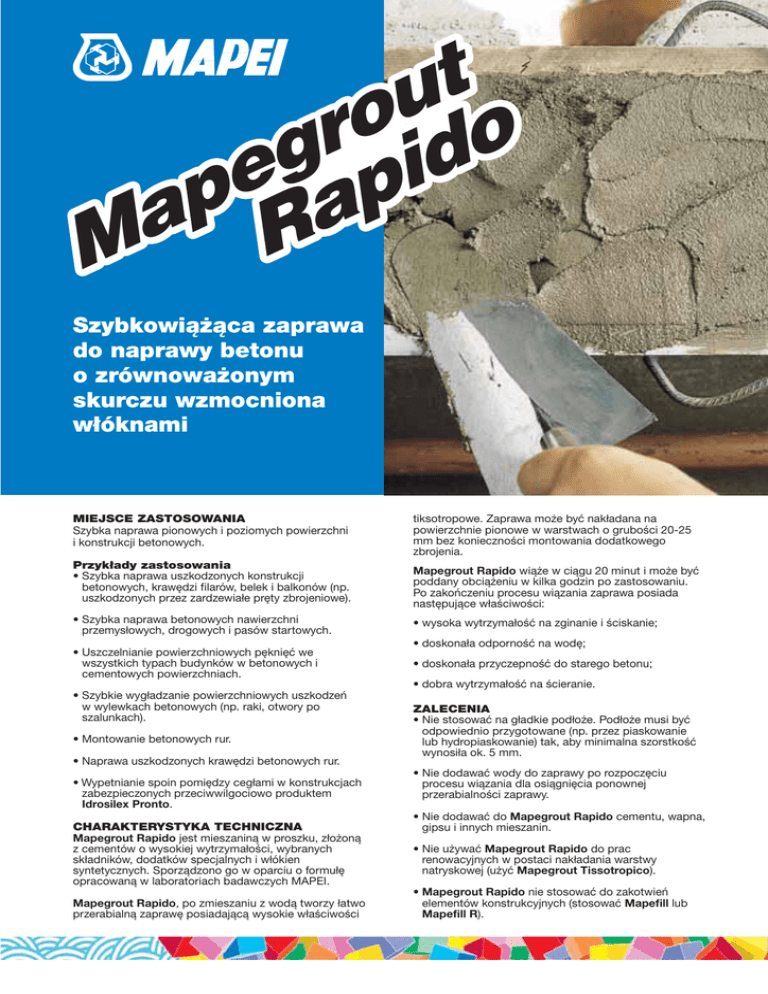 t u o r o g d i e p p a a M R Szybkowiążąca zaprawa do naprawy betonu o zrównoważonym skurczu wzmocniona włóknami MIEJSCE ZASTOSOWANIA Szybka naprawa pionowych i poziomych powierzchni i konstrukcji betonowych. Przykłady zastosowania • Szybka naprawa uszkodzonych konstrukcji betonowych, krawędzi filarów, belek i balkonów (np. uszkodzonych przez zardzewiałe pręty zbrojeniowe). • Szybka naprawa betonowych nawierzchni przemysłowych, drogowych i pasów startowych. • Uszczelnianie powierzchniowych pęknięć we wszystkich typach budynków w betonowych i cementowych powierzchniach. tiksotropowe. Zaprawa może być nakładana na powierzchnie pionowe w warstwach o grubości 20-25 mm bez konieczności montowania dodatkowego zbrojenia. Mapegrout Rapido wiąże w ciągu 20 minut i może być poddany obciążeniu w kilka godzin po zastosowaniu. Po zakończeniu procesu wiązania zaprawa posiada następujące właściwości: • wysoka wytrzymałość na zginanie i ściskanie; • doskonała odporność na wodę; • doskonała przyczepność do starego betonu; • dobra wytrzymałość na ścieranie. • Szybkie wygładzanie powierzchniowych uszkodzeń w wylewkach betonowych (np. raki, otwory po szalunkach). • Montowanie betonowych rur. • Naprawa uszkodzonych krawędzi betonowych rur. • Wypetnianie spoin pomiędzy cegłami w konstrukcjach zabezpieczonych przeciwwilgociowo produktem Idrosilex Pronto. CHARAKTERYSTYKA TECHNICZNA Mapegrout Rapido jest mieszaniną w proszku, złożoną z cementów o wysokiej wytrzymałości, wybranych składników, dodatków specjalnych i włókien syntetycznych. Sporządzono go w oparciu o formułę opracowaną w laboratoriach badawczych MAPEI. Mapegrout Rapido, po zmieszaniu z wodą tworzy łatwo przerabialną zaprawę posiadającą wysokie właściwości ZALECENIA • Nie stosować na gładkie podłoże. Podłoże musi być odpowiednio przygotowane (np. przez piaskowanie lub hydropiaskowanie) tak, aby minimalna szorstkość wynosiła ok. 5 mm. • Nie dodawać wody do zaprawy po rozpoczęciu procesu wiązania dla osiągnięcia ponownej przerabialności zaprawy. • Nie dodawać do Mapegrout Rapido cementu, wapna, gipsu i innych mieszanin. • Nie używać Mapegrout Rapido do prac renowacyjnych w postaci nakładania warstwy natryskowej (użyć Mapegrout Tissotropico). • Mapegrout Rapido nie stosować do zakotwień elementów konstrukcyjnych (stosować Mapefill lub Mapefill R). [sche3] 307 Polacco - 1 (Mapegrout Rapido) (18.04.05 - 5ª Bozza/Ciano Digitale/PDF/CD) ut o r egapido p Ma R • Nie używać Mapegrout Rapido do precyzyjnych zakotwień. specjalną farbą do betonu Elastocolor Pittura po upływie 3 dni przy temperaturze +20°C. • Nie stosować Mapegrout Rapido na suchych i brudnych powierzchniach. B) Naprawa nawierzchni betonowych Nałożyć Mapegrout Rapido kielnią na świeżo przygotowane podłoże i wygładzić pacą tynkarską. Po nałożeniu chronić naprawianą powierzchnię przed gwałtowną utratą wilgotności poprzez zabezpieczenie folią polietylenową lub mokrym workiem. • Początek twardnienia Mapegrout Rapido następuje po ok.15min., w związku z tym zaleca się rozrabiać tylko tyle zaprawy ile można zużyć w ciągu 10-15 min. • Przed użyciem nie wystawiać Mapegrout Rapido na działanie promieni słonecznych. • Nie stosować Mapegrout Rapido przy temperaturze otoczenia niższej od +5°C. • Nie stosować Mapegrout Rapido, którego opakowanie było uszkodzone bądź otwarte dużo wcześniej. SPOSÓB UŻYCIA Przygotowanie podłoża A) Naprawa uszkodzonych prefabrykowanych elementów konstrukcji betonowych Usunąć uszkodzony i luźny beton aż do uzyskania solidnego, wytrzymałego i chropowatego podłoża. Wcześniejsze warstwy, o ile nie posiadają właściwej wytrzymałości należy usunąć. Oczyścić beton i pręty zbrojeniowe z pyłu, rdzy, gruzu cementowego, smaru, oleju i farby przez piaskowanie lub w przypadku niezbyt dużej powierzchni, szczotką drucianą. Zabezpieczyć wszystkie pręty zbrojeniowe preparatem Mapefer lub Mapefer 1K. Zwilżyć podłoże wodą. Przed nałożeniem zaprawy poczekać, aby z podłoża wyparował nadmiar wody. O ile jest konieczne użyć sprężonego powietrza lub gąbki. Dla uzyskania lepszej przyczepności można wykonać warstwę zczepną przez obrzucenie podłoża przy użyciu szczotki zaprawą sporządzoną z 1 części Mapegrout Rapido oraz 0,24-0,25 części wody i nanosić zaprawę mokre na mokre. B) Naprawa nawierzchni betonowych Usunąć cały uszkodzony i luźny beton. Zdłutować krawędzie naprawianej powierzchni pod odpowiednim kątem i oczyścić ze wszystkich pozostałości, Nawilżyć podłoże wodą. Jeżeli podłoże jest bardzo chłonne sporządzić warstwę wiążącą poprzez obrzucenie podłoża przy pomocy szczotki zaprawą sporządzoną z 1 części Mapegrout Rapido i 0,24-0,25 części wody. Przygotowanie zaprawy Wsypać 25 kg Mapegrout Rapido do wcześniej przygotowanej czystej wody w ilości 3,75-4,00 litrów. Mieszać elektrycznym mieszadłem aż do otrzymania gładkiej jednorodnej masy bez grudek. Z uwagi na szybkie twardnienie Mapegrout Rapido, które w temperaturze +20°C wynosi 10 minut, należy rozrobić tylko tyle zaprawy, ile można przerobić w ciągu ok.10 min. Układanie zaprawy A) Naprawa uszkodzonych prefabrykowanych elementów konstrukcji betonowych Nałożyć zaprawę pacą lub kielnią na świeżo przygotowane podłoże. Maksymalna grubość jednej warstwy nie może przekraczać 25 mm. Kolejna warstwa może być nakładania po ok. 15 minutach. Po skończonej naprawie zabezpieczyć nawierzchnię przed odparowaniem przez czas wiązania (ok. 30-40 minut). Mapegrout Rapido może być malowany Mapegrout Rapido może być obciążony lekkim ruchem po upływie 3 godzin od nałożenia (temp. +20°C). ŚRODKI OSTROŻNOŚCI PODCZAS PRZYGOTOWYWANIA I NAKŁADANIA MAPEGROUT RAPIDO Nie ma potrzeby zachowywania środków ostrożności przy tem