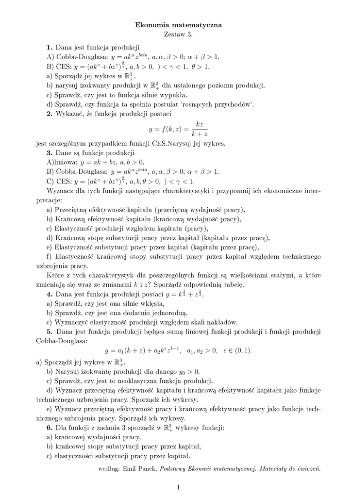 Ekonomia matematyczna Zestaw 3. 1. Dana jest funkcja produkcji y = ak α z beta , a, α, β > 0; α + β > 1, θ γ γ B) CES: y = (ak + bz ) γ , a, b > 0, ) < γ < 1, θ > 1. 3 a) Sporz¡d¹ jej wykres w R+ . 2 b) narysuj izokwanty produkcji w R+ dla ustalonego poziomu A) Cobba-Douglasa: produkcji. c) Sprawd¹, czy jest to funkcja silnie wypukªa. d) Sprawd¹, czy funkcja ta speªnia postulat 'rosn¡cych przychodów'. 2. Wykaza¢, »e funkcja produkcji postaci y = f (k, z) = kz k+z jest szczególnym przypadkiem funkcji CES.Narysuj jej wykres. 3. Dane s¡ funkcje produkcji y = ak + bz , a, b > 0. α beta Cobba-Douglasa: y = ak z , a, α, β > 0; α + β > 1. θ γ γ γ CES: y = (ak + bz ) , a, b, θ > 0, ) < γ < 1. A)liniowa: B) C) Wyznacz dla tych funkcji nast¦puj¡ce charakterystyki i przypomnij ich ekonomiczne interpretacje: a) Przeci¦tn¡ efektywno±¢ kapitaªu (przeci¦tn¡ wydajno±¢ pracy), b) Kra«cow¡ efektywno±¢ kapitaªu (kra«cow¡ wyda jno±¢ pracy), c) Elastyczno±¢ produkcji wzgl¦dem kapitaªu (pracy), d) Kra«cow¡ stop¦ substytucji pracy przez kapitaª (kapitaªu przez prac¦), e) Elastyczno±¢ substytucji pracy przez kapitaª (kapitaªu przez prac¦), f ) Elastyczno±¢ kra«cowej stopy substytucji pracy przez kapitaª wzgl¦dem technicznego uzbrojenia pracy. Które z tych charakterystyk dla poszczególnych funkcji s¡ wielko±ciami staªymi, a które zmieniaj¡ si¦ wraz ze zmianami k i z? Sporz¡d¹ odpowiedni¡ tabel¦. 1 1 y = k2 + z3. 4. Dana jest funkcja produkcji postaci a) Sprawd¹, czy jest ona silnie wkl¦sªa, b) Sprawd¹, czy jest ona dodatnio jednorodn¡. c) Wyznaczy¢ elastyczno±¢ produkcji wzgl¦dem skali nakªadów. 5. Dana jest funkcja produkcji b¦d¡ca sum¡ liniowej funkcji produkcji i funkcji produkcji Cobba-Douglasa: y = a1 (k + z) + a2 k ε z 1−ε , a1 , a2 > 0, ∈ (0, 1). a) Sporz¡d¹ jej wykres w R3+ . b) Narysuj izokwant¦ produkcji dla danego y0 > 0. c) Sprawd¹, czy jest to neoklasyczna funkcja produkcji. d) Wyznacz przeci¦tn¡ efektywno±¢ kapitaªu i kra«cow¡ efektywno±¢ kapitaªu jako funkcje technicznego uzbrojenia pracy. Sporz¡d¹ ich wykresy. e) Wyznacz przeci¦tn¡ efektywno±¢ pracy i kra«cow¡ efektywno±¢ pracy jako funkcje technicznego uzbro jenia pracy. Sporz¡d¹ ich wykresy. 6. Dla funkcji z zadania 3 sporz¡d¹ w R3+ wykresy funkcji: a) kra«cowej wyda jno±ci pracy, b) kra«cowej stopy substytucji pracy przez kapitaª, c) elastyczno±ci substytucji pracy przez kapitaª. wedªug: Emil Panek, Podstawy Ekonmii matematycznej. Materiaªy do ¢wicze«. 1