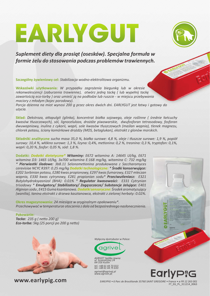 EARLYGUT Suplement diety dla prosiąt (osesków). Specjalna formuła w formie żelu do stosowania podczas problemów trawiennych. Szczególny żywieniowy cel: Stabilizacja wodno-elektrolitowa organizmu. Wskazówki użytkowania: W przypadku zagrożenia biegunką lub w okresie rekonwalescencji (zaburzenia trawienne), otwórz jedną tackę ( lub wypełnij tackę zawartością eco-torby ) oraz umieść ją na podłodze lub ruszcie - w miejscu przebywania maciory z młodym (kojec porodowy). Porcja dzienna na miot wynosi 200 g przez okres dwóch dni. EARLYGUT jest łatwy i gotowy do użycia. Skład: Dekstroza, attapulgit (glinka), koncentrat białka sojowego, oleje roślinne ( średnie łańcuchy kwasów tłuszczowych), sól, lignoceluloza, drożdże piwowarskie, dwufosforan tetrasodowy, fosforan dwuwapniowy, inulina z cykorii, wapń, sole kwasów tłuszczowych (maślan wapnia), tlenek magnezu, chlorek potasu, ściany komórkowe drożdży (MOS, betaglukan), ekstrakt z glonów morskich. Składniki analityczne sucha masa 35,0 %, białko surowe: 4,8 %, oleje i tłuszcze surowe: 1,9 %, popiół surowy: 10,4 %, włókno surowe: 1,3 %, lizyna: 0,4%, metionina: 0,2 %, treonina: 0,3 %, tryptofan: 0,1%, wapń: 0,20 %, fosfor: 0,05 %, sód: 1,8 %. Dodatki: Dodatki dietetyczne* Witaminy: E672 witamina A: 14645 Ul/kg, E671 witamina D3: 1465 Ul/kg, 3a700 witamina E:168 mg/kg, witamina C: 732 mg/kg * Pierwiastki śladowe: 3b8.11 Selonometionina produkowana z Saccharomyces cerevisiae NCYC R397: 0.25 mg/kg Dodatki technologiczne: * Środki konserwujące: E202 Sorbinian potasu, E280 kwas propionowy, E297 kwas fumarowy, E327 mleczan wapnia, E330 kwas cytrynowy, E281 propionian sodu* Przeciwutleniacz: E321 Butylohydroksyasnizol (BHA): 0.01% * Regulator kwasowości: E331 Cytrynian trisodowy * Emulgatory/ Stabilizatory/ Zagęszczacze/ Substancje żelujące: E401 Alginian sodu , E415 Guma ksantanowa. Dodatki sensoryczne: Środek aromatyzujący (wanilia), tanina ekstrakt z drzewa kasztanowca, ekstrakt z zielonej herbaty: 0.02%. Okres magazynowania: 24 miesiące w oryginalnym opakowaniu*. Przechowywać w temperaturze otoczenia z dala od bezpośredniego nasłonecznienia. Pakowanie: Tacka: 235 g ( netto 200 g) Eco-torba: 5kg (25 porcji po 200 g netto) Wyłączny dystrybutor w Polsce: AGRIVET Spółka Jawna ul. Sczanieckiej 24 64-316 Kuślin tel. +48 61 44 73 013 tel. +48 61 44 75 633 [email protected] www.agrivet.pl www.earlypig.com EARLYPIG • 6 Parc de Brocéliande 35760 SAINT GREGOIRE • France • α FR 12 263 001 FT_EG_PL_311214_0063 EARLYGUT WŁAŚCIWOŚCI PREPARATU: Glinokrzemian: niespieniająca glinka, z pozytywnym wpływem na ochronę enterocytów błony śluzowej jelit, zmniejsza stan zapalny powierzchni jelita i wiąże toksyny bakteryjne. Białko sojowe: skoncentrowane bardzo bogate w aminokwasy egzogenne i enzymatycznie przetwarzane. Produkt zawiera białka małych rozmiarów (doskonałe wchłanianie) i działa przeciwalergicznie. Posiada wszystkie ważne właściwości odżywcze soi (o wysokiej strawności). Naturalne włókna: oczyszczona celuloza przyczynia się do regulacji trawienia w przewodzie pokarmowym, poprawia tranzyt treści jelitowej, w szczególności w przypadku problemów z trawieniem. Ponieważ nie są wchłaniane przez jelita, pomagają zachować strukturę masy kałowej (osusza odchody). Sangwinaryna: ma naturalne działanie przeciwzapalne (z rodziny alkaloidów), ma korzystne działanie przeciwko patogenom bakteryjnym. Taniny: wyciąg z drzewa kasztanowca (polifenole), które aktywują jelitową warstwę śluzu, korzystne dla ochrony komórek jelitowych oraz mają pozytywne działanie zmniejszające utlenienie organizmu. FOS (jest źródłem inuliny): to prebiotyk, który przyczynia się do rozwoju zrównoważonej flory układu pokarmowego, poprzez pobudzanie bifidobakterii i hamuje patogeny jelitowe. MOS (mannanooligosacharydy) oraz betaglukany : ekstrakty ze ścian komórkowych drożdży, mające silny wpływ na układ odpornościowy (immunostymulacja). Glutaminian sodu: jest preferowanym źródłem energii dla enterocytów, promuje szybkie odtworzenie błony śluzowej i flory jelitowej – zniszczonej w następstwie stresu (biegunki, odwodnienia, zatrucia, zakażenia i zarażenia). Dekstrozy: najprostszy i najbardziej istotny monocukier, jego trawienie nie wymaga enzymów (energia). Pomaga zrównoważyć podstawową regulację hormonalną, przez proces regulacji poziomu insuliny. Wyciąg z alg (DHA): najważniejsze kwasy tłuszczowe (omega-3), które regulują równowagę między hormonami (prostaglandyny, tromboksany, leukotrieny). Betaina: cząsteczkę, która pomaga w jelitach w walce przeciw wodorotlenowej destabilizacji, takich jak np. straty wody podczas biegunki. Maślan wapnia: wpływa na dojrzewanie błony śluzowej jelit, pomaga w regulacji systemu odpornościowego i kontroli flory bakteryjnej, bierze udział w produkcji hormonów trawiennych (gastryny, greliny) oraz wpływa na dojrzewanie układu pokarmowego i nerwowego. Jest on również składnikiem mleka preferowanego przez prosięta oraz pobudza spożycie paszy. Witaminy A, D3, E (lipofilne) oraz witamina C i witaminy grupy B (hydrofilne): witaminy są niezbędne dla prosiąt do wszystkich przemian metabolicznych. Aminokwasy ( lizyna, metionina, treonina, tryptofan): lizyna wpływa na przyrosty i na procesy enzymatyczne; metionina ochrania wątrobę, reguluje metabolizm mięśni; treonina jest ważna dla rozwoju systemu odpornościowego; tryptofan (prekursor serotoniny) wpływa pozytywnie na spożycie paszy (stymulacja apetytu). Aromat waniliowy i słodzik: poprawiają smakowitość i atrakcyjność paszy, są niezbędne do stymulowania poboru paszy. Tlenek magnezu: źródło magnezu, ważny składnik mineralny w komórkach, odpowiada za impulsy nerwowe, ważny w przypadku strat elektrolitów, które występują podczas biegunki. Chlorek potasu: zawiera potas, niezbędny minerał wewnątrz komórki, a także pomaga 