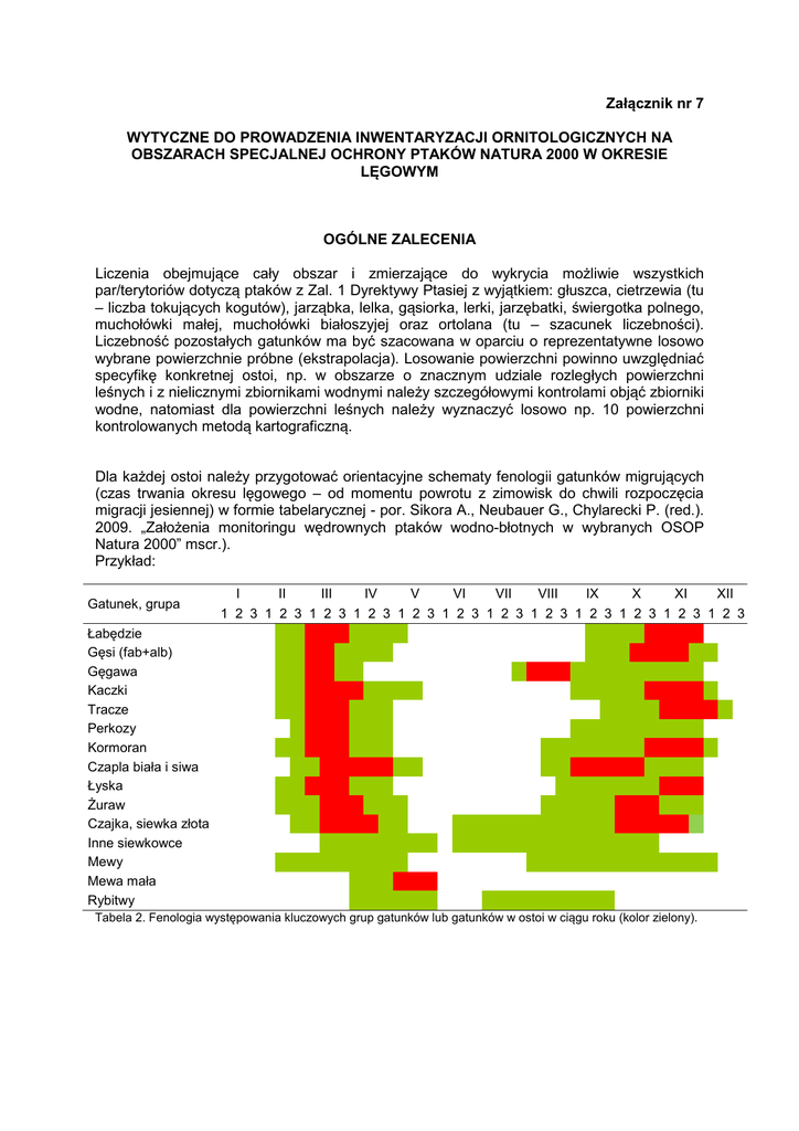 Załącznik nr 7 WYTYCZNE DO PROWADZENIA INWENTARYZACJI ORNITOLOGICZNYCH NA OBSZARACH SPECJALNEJ OCHRONY PTAKÓW NATURA 2000 W OKRESIE LĘGOWYM OGÓLNE ZALECENIA Liczenia obejmujące cały obszar i zmierzające do wykrycia możliwie wszystkich par/terytoriów dotyczą ptaków z Zal. 1 Dyrektywy Ptasiej z wyjątkiem: głuszca, cietrzewia (tu – liczba tokujących kogutów), jarząbka, lelka, gąsiorka, lerki, jarzębatki, świergotka polnego, muchołówki małej, muchołówki białoszyjej oraz ortolana (tu – szacunek liczebności). Liczebność pozostałych gatunków ma być szacowana w oparciu o reprezentatywne losowo wybrane powierzchnie próbne (ekstrapolacja). Losowanie powierzchni powinno uwzględniać specyfikę konkretnej ostoi, np. w obszarze o znacznym udziale rozległych powierzchni leśnych i z nielicznymi zbiornikami wodnymi należy szczegółowymi kontrolami objąć zbiorniki wodne, natomiast dla powierzchni leśnych należy wyznaczyć losowo np. 10 powierzchni kontrolowanych metodą kartograficzną. Dla każdej ostoi należy przygotować orientacyjne schematy fenologii gatunków migrujących (czas trwania okresu lęgowego – od momentu powrotu z zimowisk do chwili rozpoczęcia migracji jesiennej) w formie tabelarycznej - por. Sikora A., Neubauer G., Chylarecki P. (red.). 2009. „Założenia monitoringu wędrownych ptaków wodno-błotnych w wybranych OSOP Natura 2000” mscr.). Przykład: Gatunek, grupa I II III IV V VI VII VIII IX X XI XII 1 2 3 1 2 3 1 2 3 1 2 3 1 2 3 1 2 3 1 2 3 1 2 3 1 2 3 1 2 3 1 2 3 1 2 3 Łabędzie Gęsi (fab+alb) Gęgawa Kaczki Tracze Perkozy Kormoran Czapla biała i siwa Łyska Żuraw Czajka, siewka złota Inne siewkowce Mewy Mewa mała Rybitwy Tabela 2. Fenologia występowania kluczowych grup gatunków lub gatunków w ostoi w ciągu roku (kolor zielony). METODYKA INWENTARYZACJI AWIFAUNY LĘGOWEJ W KRAJOBRAZIE LEŚNYM (na podstawie Chylarecki i inn. 20091, Chmielewski i Stelmach 20092, zmienione) Ze względu na fenologię gatunków oraz specyfikę krajobrazu leśnego zaleca się następujące terminy kontroli: Kontrola 1. 15 marca – 31 marca Kontrola 2. 1 kwietnia – 15 kwietnia (połączona z wyznaczeniem powierzchni monitoringowych) Kontrola 3. 16 kwietnia – 30 kwietnia (kontrola monitoringowa) Kontrola 4. 1 maja – 15 maja Kontrola 5. 16 maja – 31 maja (kontrola monitoringowa) Kontrola 6. 1 czerwca – 15 czerwca Kontrola 7. 16 czerwca – 30 czerwca Kontrola 8. 1 lipca – 31 lipca (kontrole 1-2, 4, 6-8) są kontrolami inwentaryzacyjnymi, natomiast kontrola 3 i 5 przeznaczone są na liczenia na powierzchniach monitoringowych prowadzone zgodnie z osobną metodyką1). Ponadto: — marzec: 2 nocne kontrole w celu wykrycia puchacza i puszczyka uralskiego (kilka godzin po zachodzie słońca w bezchmurne i bezwietrzne noce, w odstępie 10 dni) połączone ze stymulacją głosową3 — kwiecień: 2 nocne kontrole w celu wykrycia włochatki (2-3 godziny po zapadnięciu zmroku) połączone ze stymulacja głosową3. — czerwiec: 2 nocne kontrole w celu wykrycia lelka (do 2 godzin po zmroku i 2 godziny przed brzaskiem) połączone ze stymulacją głosową4. Prowadzenie obserwacji terenowych Przed każdą kontrolą, obserwator na mapie powinien wyznaczyć (ołówkiem) trasę przejścia, z możliwością jej modyfikacji w trakcie kontroli. Po wykonaniu kontroli, rzeczywiście przebytą trasę oznacza na mapie (jaskrawym kolorem). Trasa przejścia powinna tak przebiegać, aby uwzględniała wszystkie śródleśne bagna, najstarsze drzewostany, polany oraz śródleśne osady. Jeśli w granicach ostoi znajdowują się pola, również one powinny być objęte kontrolą pod kątem występowania gatunków objętych inwentaryzacją. Kontrolami należy objąć także pas ekotonu na skraju kompleksu leśnego, ponieważ tu właśnie skoncentrowane są często stanowiska lęgowe np. świergotka polnego czy ortolana. W przypadku wykrycia zajętego gniazda szponiastych i innych gatunków objętych ochroną strefową, nie zaleca się wykonywania jego powtórnej kontroli – w ten sposób unika się niepotrzebnego niepokojenia ptaków i narażania lęgu na straty. Natomiast powtórna kontrola jest wskazana w przypadku podejrzenia straty lęgu w wykrytym gnieździe i podejrzeniem założenia kolejnego gniazda w pobliżu pierwszego. Kontrole należy przeprowadzać podczas sprzyjających warunków pogodowych – bez silnego wiatru, opadów deszczu itp. Szczególnie ważne jest rejestrowanie jednocześnie słyszanych/widzianych par ptaków/tokujących samców. W przypadku gatunków licznych, na ile to możliwe, po zakończeniu inwentaryzacji, należy podjąć próbę szacowania liczebności, zakładając nawet duży przedział ekstrapolując wyniki uzyskane z powierzchni próbnych. Zalecana skala mapy do wykonania inwentaryzacji terenowej 1: 20 000 lub topograficzna 1:25 000 Zalecane symbole do zapisów (na mapie) obserwacji ptaków (na przykładzie dzięcioła czarnego): DM (obwiedzione pełnym kółkiem) - zachowanie godowe: głos godowy, śpiew, lot tokującego ptaka, DM (obwiedzione przerywanym kółkiem) – niedokładnie zlokalizowany głos, śpiew, DM (obwiedzione przerywanym czworobokiem) – niedokładnie zlokalizowany ptak (nie odzywający się lub odzywający się innym głosem niż godowy), DM X DM – zachowania agresywne, np. walka, odganianie, pozy grożenia, *DM (so, 10)– „gwiazdka” dokładnie lokalizująca gniazdo danego gatunku, w tym przypadku zajętą dziuplę - na sośnie na wysokości 10 m, DM - - - - DM – jednocześnie widziane różne ptaki, DM - - - ? - - - DM – przypuszczalnie dwa różne ptaki, DM - - - DM – jednocześnie słyszane głosy godowe różnych ptaków, DM♂ - - - - DM – jednoczesne stwierdzenie pary i głosu godowego pojedynczego ptaka, + DM- -- --- (przerywana strzałka) - przemieszczenie (obserwacja ptaka w locie) o nie zlokalizowanym zakończeniu lotu, DM- ------- I (ciągła strzałka) - przemieszczenie o z