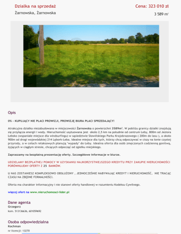 Dzialka na sprzedaż Cena: 323 010 zł Żarnowska, Żarnowska 3 589 m 2 Opis 0% ‐ KUPUJĄCY NIE PŁACI PROWIZJI, PROWIZJĘ BIURA PŁACI SPRZEDAJĄCY! Atrakcyjna działka niezabudowana w miejscowości Żarnowska o powierzchni 3589m2. W pobliżu granicy działki znajdują się przyłącza energii i wody. Nieruchomość usytuowana jest około 2,5 km na południe od centrum Łeby, 800m od Jeziora Łebsko (wspaniałe miejsce dla windsurfingu) w sąsiedztwie Słowińskiego Parku Krajobrazowego ( 200m do lasu ), a około 900m od drogi wojewódzkiej 214 Lębork‐Łeba. Idealne miejsce dla tych, którzy chcą odpoczywać w ciszy na łonie czystej przyrody, a w celach relaksowych planują "wypady" do Łeby. Idealna oferta dla osób zmęczonych codzienną gonitwą, żyjących w ciągłym stresie, chcących odpocząć od zgiełku miejskiego. Zapraszamy na bezpłatną prezentację oferty. Szczegółowe informacje w biurze. UDZIELAMY BEZPŁATNEJ POMOCY W UZYSKANIU NAJKORZYSTNIEJSZEGO KREDYTU PRZY ZAKUPIE NIERUCHOMOŚCI PORÓWNUJEMY OFERTY Z 25 BANKÓW. U NAS ZOSTANIESZ KOMPLEKSOWO OBSŁUŻONY , JEDNOCZEŚNIE NABYWAJĄC KREDYT I NIERUCHOMOŚĆ, NIE TRACĄC CZASU NA ZBĘDNE FORMALNOŚCI. Oferta ma charakter informacyjny i nie stanowi oferty handlowej w rozumieniu Kodeksu Cywilnego. więcej ofert na www.nieruchomosci‐lider.pl Dane agenta Grzegorz kom. 513136636, 601059692 Osoba odpowiedzialna Kochman nr licencji: 13270 Szczegóły Symbol oferty Lokalizacja Przeznaczenie działki Nieruchomość LID‐GS‐6971 Żarnowska, Żarnowska budowlano ‐ rolna Zagosp. działki Ukształtowanie działki Kształt działki Pow. całkowita [m2] 3 589,00 m² Ogrodzenie działki Cena 323 010 PLN Woda Dojazd Pomieszczenia Otoczenie Alarm zagospodarowana płaska prostokąt brak tak ‐ miejska asfalt działki zabudowane nie Odległość do komunikacji publicznej [m] 600 m Odl. do sklepu [m] 600 m Odl. do szkoły [m] 3m Odl. do przedszkola [m] 3m Winda nie Drzwi antywłamaniowe nie Położenie Prąd Kanalizacja obrzeża miasta w ulicy tak