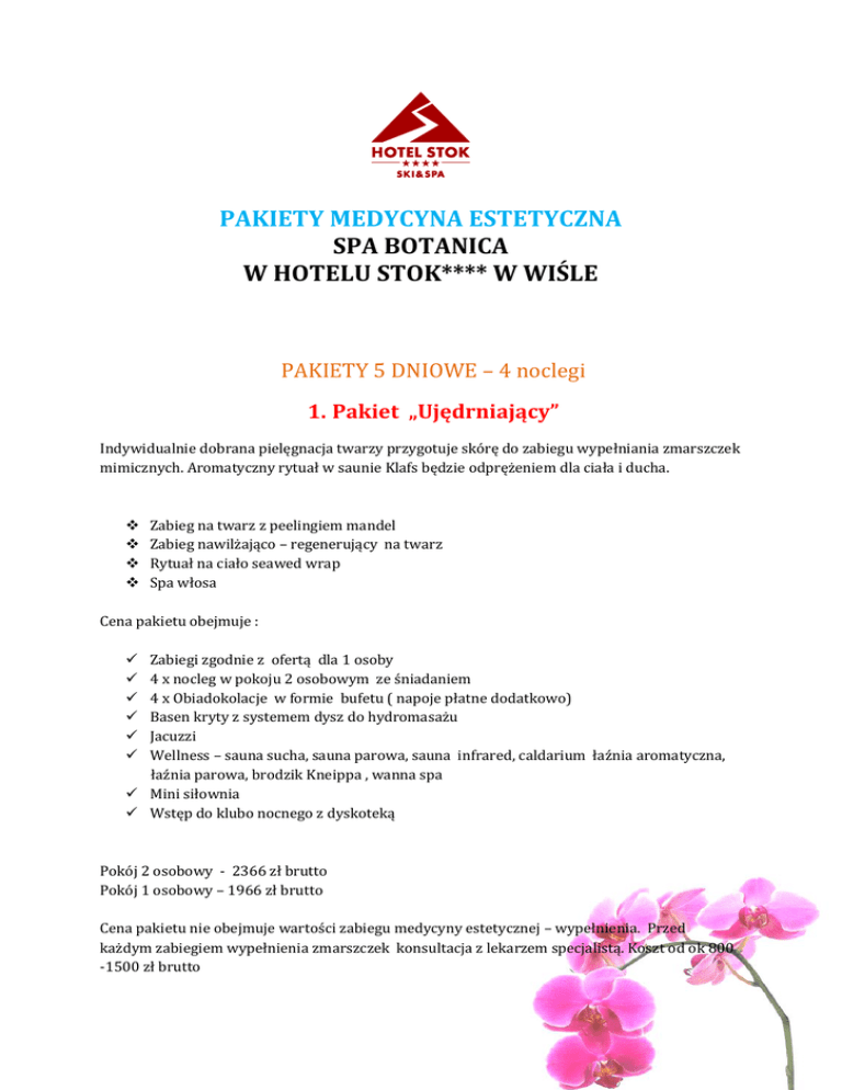 PAKIETY MEDYCYNA ESTETYCZNA SPA BOTANICA W HOTELU STOK**** W WIŚLE PAKIETY 5 DNIOWE – 4 noclegi 1. Pakiet „Ujędrniający” Indywidualnie dobrana pielęgnacja twarzy przygotuje skórę do zabiegu wypełniania zmarszczek mimicznych. Aromatyczny rytuał w saunie Klafs będzie odprężeniem dla ciała i ducha. Zabieg na twarz z peelingiem mandel Zabieg nawilżająco – regenerujący na twarz Rytuał na ciało seawed wrap Spa włosa Cena pakietu obejmuje : Zabiegi zgodnie z ofertą dla 1 osoby 4 x nocleg w pokoju 2 osobowym ze śniadaniem 4 x Obiadokolacje w formie bufetu ( napoje płatne dodatkowo) Basen kryty z systemem dysz do hydromasażu Jacuzzi Wellness – sauna sucha, sauna parowa, sauna infrared, caldarium łaźnia aromatyczna, łaźnia parowa, brodzik Kneippa , wanna spa Mini siłownia Wstęp do klubo nocnego z dyskoteką Pokój 2 osobowy - 2366 zł brutto Pokój 1 osobowy – 1966 zł brutto Cena pakietu nie obejmuje wartości zabiegu medycyny estetycznej – wypełnienia. Przed każdym zabiegiem wypełnienia zmarszczek konsultacja z lekarzem specjalistą. Koszt od ok 800 -1500 zł brutto Szczegółowe informacje pod numerem 33 856 40 32 lub [email protected] 2. Pakiet „Moc nawilżenia” Relaksująca kąpiel i masaż z wykorzystaniem ciepłych olejków aromaterapeutycznych rozluźnią mięśnie i nadadzą blask skórze. Silnie nawilżająca kuracja w zabiegach na twarz pozwoli na dłużej utrzymać odpowiedni poziom nawilżenia skóry co wydłuży efekty zabiegu medycyny estetycznej. Zabieg repair treatment na twarz Hydracure zabieg na twarz Kąpiel odmładzająca w zielonych algach Masaż aromaterapeutyczny Parafina na dłonie Cena pakietu obejmuje : Zabiegi zgodnie z ofertą dla 1 osoby 4 x nocleg w pokoju 2 osobowym ze śniadaniem 4 x Obiadokolacje w formie bufetu ( napoje płatne dodatkowo) Basen kryty z systemem dysz do hydromasażu Jacuzzi Wellness – sauna sucha, sauna parowa, sauna infrared, caldarium łaźnia aromatyczna, łaźnia parowa, brodzik Kneippa , wanna spa Mini siłownię Wstęp do klubo nocnego z dyskoteką Pokój 2 osobowy - 2459 zł brutto Pokój 1 osobowy – 2059 zł brutto Cena pakietu nie obejmuje wartości zabiegu medycyny estetycznej – wypełnienia. Przed każdym zabiegiem wypełnienia zmarszczek konsultacja z lekarzem specjalistą. Koszt od ok 800 -1500 zł brutto Szczegółowe informacje pod numerem 33 856 40 32 lub [email protected] 3 Pełen relaks Zabieg złuszczania oraz z kwasem hialuronowym na twarz przygotuje skórę do zabiegu wypełniania zmarszczek. Owocowa kąpiel wraz z masażem dopełni czas relaksu. Zabieg na twarz z peelingiem mandel Hydracure zabieg na twarz Kąpiel owocowa Masaż częściowy Cena pakietu obejmuje : Zabiegi zgodnie z ofertą dla 1 osoby 4 x nocleg w pokoju 2 osobowym ze śniadaniem 4 x Obiadokolacje w formie bufetu ( napoje płatne dodatkowo) Basen kryty z systemem dysz do hydromasażu Jacuzzi Wellness – sauna sucha, sauna parowa, sauna infrared, caldarium łaźnia aromatyczna, łaźnia parowa, brodzik Kneippa , wanna spa Mini siłownię Wstęp do klubo nocnego z dyskoteką Pokój 2 osobowy - 2162 zł brutto Pokój 1 osobowy – 1762 zł brutto Cena pakietu nie obejmuje wartości zabiegu medycyny estetycznej – wypełnienia. Przed każdym zabiegiem wypełnienia zmarszczek konsultacja z lekarzem specjalistą. Koszt od ok 800 -1500 zł brutto Szczegółowe informacje pod numerem 33 856 40 32 lub [email protected] 4. Nowa Ja To pakiet stworzony z myślą o pełnym przygotowaniu skóry twarzy do zabiegu medycyny estetycznej, co na dłużej utrzyma skórę w odpowiedniej kondycji. Zabieg na twarz z peelingiem mandel Zabieg na twarz Hydracure Kąpiel oczyszczająca Cena pakietu obejmuje : Zabiegi zgodnie z ofertą dla 1 osoby 4 x nocleg w pokoju 2 osobowym ze śniadaniem 4 x Obiadokolacje w formie bufetu ( napoje płatne dodatkowo) Basen kryty z systemem dysz do hydromasażu Jacuzzi Wellness – sauna sucha, sauna parowa, sauna infrared, caldarium łaźnia aromatyczna, łaźnia parowa, brodzik Kneippa , wanna spa Mini siłownię Wstęp do klubo nocnego z dyskoteką Pokój 2 osobowy - 2105 zł brutto Pokój 1 osobowy – 1705 zł brutto Cena pakietu nie obejmuje wartości zabiegu medycyny estetycznej – wypełnienia. Przed każdym zabiegiem wypełnienia zmarszczek konsultacja z lekarzem specjalistą. Koszt od ok 800 -1500 zł brutto Szczegółowe informacje pod numerem 33 856 40 32 lub [email protected] PAKIETY 8 DNIOWE – 7 noclegi 1. Pakiet „Chwila dla Ciebie” Kąpiel pobudzi zmysły a zabieg algowy na ciało intensywnie nawilży skórę. Całości dopełni masaż, który w pełni rozluźni mięśnie. Zabieg na twarz z kwasem hialuronowym wygładzi i odpowiednio nawilży skórę. Kąpiel owocowa Masaż relaksacyjny Zabieg na ciało seaweed wrap Zabieg na twarz z peelingiem mandel Hydracure zabieg na twarz Parafina na dłonie SPA włosa Cena pakietu obejmuje : Zabiegi zgodnie z ofertą dla 1 osoby 7 x nocleg w pokoju 2 osobowym ze śniadaniem 7 x Obiadokolacje w formie bufetu ( napoje płatne dodatkowo) Basen kryty z systemem dysz do hydromasażu Jacuzzi Wellness – sauna sucha, sauna parowa, sauna infrared, caldarium łaźnia aromatyczna, łaźnia parowa, brodzik Kneippa , wanna spa Mini siłownię Wstęp do klubo nocnego z dyskoteką Pokój 2 osobowy - 3542 zł brutto Pokój 1 osobowy – 2912 zł brutto Cena pakietu nie obejmuje wartości zabiegu medycyny estetycznej – wypełnienia. Przed każdym zabiegiem wypełnienia zmarszczek konsultacja z lekarzem specjalistą. Koszt od ok 800 -1500 zł brutto Szczegółowe informacje pod numerem 33 856 40 32 lub [email protected] 2. Pakiet „Moc alg” Maska z wodorostów intensywnie nawilży i oczyści skórę likwidując obrzęki. Indywidualnie dobrana odnowa nada blask włosom i poprawi kondycję skóry głowy, a pielęgnacja twarzy z wykorzystaniem kwasu hialuronowego będzie preludium do kontynuacji pielęgnacji przez lekarza. Zabieg na twarz z peelingi