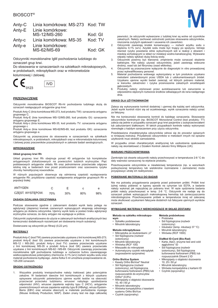 BIOSCOT® Anty-C Anty-E Anty-c Anty-e Linia komórkowa: MS-273 Kod: TW Linie komórkowe: MS-12/MS-260 Kod: GI Linia komórkowa: MS-35 Kod: TV Linie komórkowe: MS-62/MS-69 Kod: GK Odczynniki monoklonalne IgM pochodzenia ludzkiego do oznaczeń grup krwi. Do stosowania w oznaczeniach na szkiełkach mikroskopowych, w probówkach, mikropłytkach oraz w mikrometodzie kolumnowej i żelowej. C 0123 5. UWAGI DLA UŻYTKOWNIKÓW Produkt Anty-C (linia komórkowa MS-273, kod produktu TW): oznaczenia antygenu grupowego C. Produkt Anty-E (linie komórkowe MS-12/MS-260, kod produktu GI): oznaczenia antygenu grupowego E. Produkt Anty-c (linia komórkowa MS-35, kod produktu TV: oznaczenia antygenu grupowego c Produkt Anty-e (linie komórkowe MS-62/MS-69, kod produktu GK): oznaczenia antygenu grupowego e. Odczynniki są przeznaczone do stosowania w oznaczeniach na szkiełkach mikroskopowych, w probówkach, mikropłytkach oraz w mikrometodzie kolumnowej i żelowej przez pracowników przeszkolonych w zakresie badań serologicznych. WPROWADZENIE Zaleca się wykonywanie kontroli dodatniej i ujemnej dla każdej serii odczynnika. Jeżeli wynik kontroli różni się od oczekiwanego, wynik oznaczenia należy uznać za fałszywy. Nie ma konieczności stosowania kontroli do każdego oznaczenia. Stosowanie odczynników kontrolnych (np. BIOSCOT Monoclonal Control (kod produktu: TT) zaleca się jednie w przypadku oznaczeń grup krwi pacjentów z autoprzeciwciałami lub zaburzeniami białkowymi. W takich przypadkach kontrole należy wykonywać równolegle z każdym oznaczeniem przy użyciu odczynnika. Przedstawiona charakterystyka odczynników odnosi się do procedur opisanych w niniejszej instrukcji. Przydatność odczynników w metodach innych niż opisane użytkownik musi określić samodzielnie. W przypadku zmian charakterystyki analitycznej lub uszkodzenia opakowania należy się skontaktować z Działem Kontroli Jakości firmy Millipore (UK). WARUNKI PRZECHOWYWANIA Układ grupowy krwi Rh Układ grupowy krwi Rh obejmuje ponad 40 antygenów lub kompleksów antygenowych zlokalizowanych na powierzchni ludzkich erytrocytów. Pięć podstawowych antygenów układu Rh oraz jednoimienne przeciwciała odgrywa istotną rolę w badaniach krwi przed przetoczeniami oraz szacowaniu ryzyka choroby hemolitycznej noworodków. W różnych populacjach obserwuje się odmienną częstość występowania antygenów Rh; przybliżona częstość występowania antygenów grupowych Rh w populacji białej: C E c e 70% 30% 80% 98% ZASADA DZIAŁANIA ODCZYNNIKA Podczas stosowania zgodnie z zaleceniami dodatni wynik testu polega na aglutynacji (zlepianiu) krwinek czerwonych wykazujących ekspresję odnośnego antygenu po dodaniu odczynnika. Ujemny wynik testu w postaci braku aglutynacji erytrocytów oznacza, że dany antygen nie występuje w próbce. Odczynniki zoptymalizowano do użycia w zalecanych technikach analitycznych bez konieczności dodatkowych rozcieńczeń ani dodawania innych substancji. Dostarczane są odczynniki po filtracji (0,22 µm). MATERIAŁY Produkt Anty-C (kod TW) zawiera przeciwciała uzyskane z linii komórkowej MS-273; produkt Anty-E (kod GI) zawiera przeciwciała uzyskane z linii komórkowych MS-12 i MS-260; produkt Anty-c (kod TV) zawiera przeciwciała uzyskane z linii komórkowej MS-35 a produkt Anty-e (kod GK) zawiera przeciwciała uzyskane z linii komórkowych MS-62 i MS-69. Odczynniki zawierają przeciwciała monoklonalne IgM pochodzenia ludzkiego w roztworze buforu zawierającego wielkocząsteczkowe potencjatory chemiczne, 0,1% (w/v) roztwór azydku sodu oraz materiał pochodzenia bydlęcego. Jedna fiolka 5 ml umożliwia przeprowadzenie ok. 125-200 oznaczeń. ŚRODKI OSTROŻNOŚCI 1. 4. 6. Odczynniki monoklonalne BIOSCOT Rh-Hr pochodzenia ludzkiego służą do oznaczeń następujących antygenów grup krwi: CZĘST. WYSTĘPOW. 3. IVD PRZEZNACZENIE ANTYGEN 2. pewności, że odczynniki wytwarzane z ludzkiej krwi są wolne od czynników zakaźnych. Należy zachować ostrożność podczas stosowania odczynników, niszczenia zużytych opakowań i usuwania ich zawartości. Odczynniki zawierają środek konserwujący — roztwór azydku sodu o stężeniu 0,1% (w/v). Azydek sodu może być trujący po spożyciu. Istnieje również ryzyko powstania silnie wybuchowych soli w reakcji z ołowiem i miedzią wchodzącymi w skład rur instalacji wodno-kanalizacyjnej. Wylewane odpady należy spłukać dużą ilością wody. Odczynniki powinny być klarowne; zmętnienie może oznaczać skażenie bakteryjne. Nie należy używać odczynników, jeżeli zawierają widoczne drobiny, osad lub żel fibrynowy (osad włóknika). Odczynniki są przeznaczone wyłącznie do diagnostyki in vitro prowadzonej przez wykwalifikowany personel. Materiał pochodzenia wołowego wykorzystany w tym produkcie uzyskano metodami zatwierdzonymi przez USDA lub z udokumentowanych źródeł. Uzyskano ujemne wyniki badań zwierząt, od których pobrano materiał, w kierunku zakaźności i ryzyka przenoszenia zakaźnych encefalopatii gąbczastych. Produkty należy utylizować przez autoklawowanie lub zanurzenie w odpowiednio stężonym roztworze środków odkażających do rana następnego dnia. Wszystkie produkty krwiopochodne należy traktować jako potencjalnie zakaźne. W badaniach dawców linii komórkowych z których uzyskano opisywane odczynniki potwierdzono ujemne wyniki testów na obecność przeciwciał przeciwko ludzkiemu wirusowi nabytego upośledzenia odporności (HIV), wirusowi zapalenia wątroby typu C (HCV), antygenów powierzchniowych wirusa zapalenia wątroby typu B (HBsAg), wirusa EpsteinBarra (EBV) oraz wirusów obecnych w materiale pochodzenia mysiego (Mouse Antibody Production, MAP). Żaden znany test nie daje całkowitej Zamknięte lub otwarte odczynniki należy przechowywać w temperaturze 2-8 °C do daty ważności oznaczonej na etykiecie produktu. Przechowywanie odczynników w niewłaściwej temperaturze (np. w warunkach podwyższonej 
