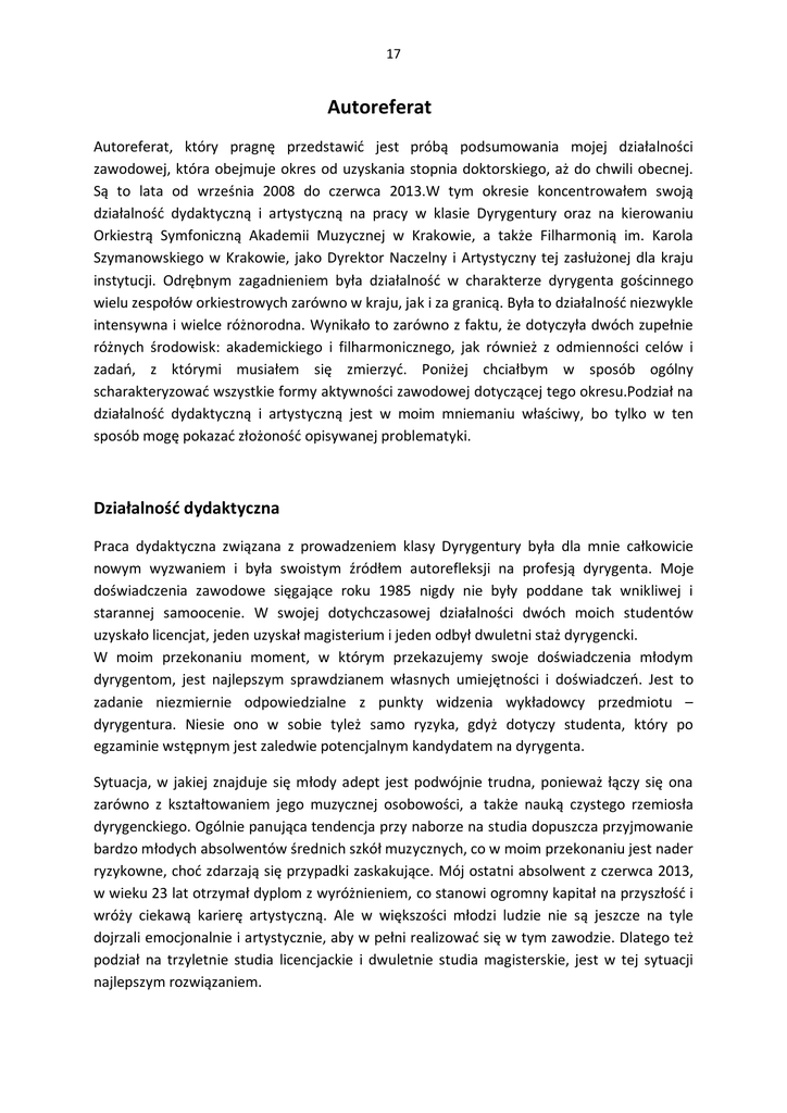 17 Autoreferat Autoreferat, który pragnę przedstawić jest próbą podsumowania mojej działalności zawodowej, która obejmuje okres od uzyskania stopnia doktorskiego, aż do chwili obecnej. Są to lata od września 2008 do czerwca 2013.W tym okresie koncentrowałem swoją działalność dydaktyczną i artystyczną na pracy w klasie Dyrygentury oraz na kierowaniu Orkiestrą Symfoniczną Akademii Muzycznej w Krakowie, a także Filharmonią im. Karola Szymanowskiego w Krakowie, jako Dyrektor Naczelny i Artystyczny tej zasłużonej dla kraju instytucji. Odrębnym zagadnieniem była działalność w charakterze dyrygenta gościnnego wielu zespołów orkiestrowych zarówno w kraju, jak i za granicą. Była to działalność niezwykle intensywna i wielce różnorodna. Wynikało to zarówno z faktu, że dotyczyła dwóch zupełnie różnych środowisk: akademickiego i filharmonicznego, jak również z odmienności celów i zadań, z którymi musiałem się zmierzyć. Poniżej chciałbym w sposób ogólny scharakteryzować wszystkie formy aktywności zawodowej dotyczącej tego okresu.Podział na działalność dydaktyczną i artystyczną jest w moim mniemaniu właściwy, bo tylko w ten sposób mogę pokazać złożoność opisywanej problematyki. Działalność dydaktyczna Praca dydaktyczna związana z prowadzeniem klasy Dyrygentury była dla mnie całkowicie nowym wyzwaniem i była swoistym źródłem autorefleksji na profesją dyrygenta. Moje doświadczenia zawodowe sięgające roku 1985 nigdy nie były poddane tak wnikliwej i starannej samoocenie. W swojej dotychczasowej działalności dwóch moich studentów uzyskało licencjat, jeden uzyskał magisterium i jeden odbył dwuletni staż dyrygencki. W moim przekonaniu moment, w którym przekazujemy swoje doświadczenia młodym dyrygentom, jest najlepszym sprawdzianem własnych umiejętności i doświadczeń. Jest to zadanie niezmiernie odpowiedzialne z punkty widzenia wykładowcy przedmiotu – dyrygentura. Niesie ono w sobie tyleż samo ryzyka, gdyż dotyczy studenta, który po egzaminie wstępnym jest zaledwie potencjalnym kandydatem na dyrygenta. Sytuacja, w jakiej znajduje się młody adept jest podwójnie trudna, ponieważ łączy się ona zarówno z kształtowaniem jego muzycznej osobowości, a także nauką czystego rzemiosła dyrygenckiego. Ogólnie panująca tendencja przy naborze na studia dopuszcza przyjmowanie bardzo młodych absolwentów średnich szkół muzycznych, co w moim przekonaniu jest nader ryzykowne, choć zdarzają się przypadki zaskakujące. Mój ostatni absolwent z czerwca 2013, w wieku 23 lat otrzymał dyplom z wyróżnieniem, co stanowi ogromny kapitał na przyszłość i wróży ciekawą karierę artystyczną. Ale w większości młodzi ludzie nie są jeszcze na tyle dojrzali emocjonalnie i artystycznie, aby w pełni realizować się w tym zawodzie. Dlatego też podział na trzyletnie studia licencjackie i dwuletnie studia magisterskie, jest w tej sytuacji najlepszym rozwiązaniem. 18 Kolejnym ważnym problemem dotyczącym kształcenia młodych dyrygentów jest umiejętny dobór repertuaru, służący właściwemu kształtowaniu muzycznej osobowości młodego dyrygenta. Moim zdaniem, nie można, wręcz nie wolno realizować programu ze studentami na zasadzie schematu „powszechnie obowiązującego”, – czyli na początku tzw. ”prosty” Mozart lub „nieskomplikowany” Haydn a potem Beethoven lub Schubert. Schemat ten jest nie do końca szczęśliwym wyborem, gdyż każdy student ma swoją niepowtarzalną osobowość i każdy wnosi swój osobisty bagaż doświadczeń muzycznych. Takie prowadzenie zajęć według „schematów sprawdzonych „ nie tylko ogranicza rozwój artystyczny, ale również pokazuje fałszywy obraz i kierunek interpretacji „klasyków wiedeńskich”, pozornie łatwych, lecz w moim mniemaniu najtrudniejszych do wykreowania. W początkowym etapie kształcenia, młodzi adepci dyrygentury muszą pokonać głównie problemy natury technicznej, wynikający zarówno z braku umiejętności opanowania materiału muzycznego partytury, jak i podstawowych braków w technice manualnej. Ten pierwszy aspekt zależy od zdolności i doświadczeń zdobywanych przez lata studiów i, drugi zaś od wrodzonych predyspozycji. Na podstawie dotychczasowych doświadczeń, doszedłem do wniosku, że podstawowe tajniki warsztatu dyrygenckiego można doskonalić zarówno na muzyce Bacha, jak i Debussego, czy Prokofiewa. Wszystko zależy w gruncie rzeczy od indywidualnych predyspozycji młodych dyrygentów. W trudnym i wymagającym procesie kształcenia, konieczne jest też stawianie nie tylko pytania -„jak?”, ale również ciągłe pytanie-, „dlaczego?”. Nie ma nic gorszego, niż dyrygenci wykonujący „miarowe, ładne dla oka -ćwiczenia gimnastyczne”, pozbawieni przy tym całkowicie jakiejkolwiek indywidualności. Dyrygent stojący przed orkiestrą musi posiadać głównie osobowość i charyzmę, bo to ostatecznie decyduje, o jakości i „temperaturze interpretacji”. Zdobywanie doświadczeń, to również regularna praca z zawodową orkiestrą symfoniczną pod okiem pedagoga. Ten element kształcenia jest nieco zaniedbywany w polskim systemie edukacji muzycznej. Ekwiwalent, często pojawiający się w postaci zajęć z orkiestrami studenckimi, nie może być do końca traktowany poważnie. Dochodzi w tej sytuacji do swoistej konfrontacji młodego zespołu, pozbawionego jakiegokolwiek doświadczenia z młodym rozpoczynającym edukację dyrygentem. Wszyscy w tej grze od początku stoją na straconych pozycjach. Jedynym ratunkiem w tej sytuacji jest udział w próbach zawodowej orkiestry, na zasadzie asystowania z możliwością prowadzenia sporadycznie prób sekcyjnych. Zawsze w ostateczności pozostają media, czyli dostęp do uczestnictwa w próbach i koncertach na całym świecie metodą „ on line” za pośrednictwem Internetu. Moje zajęcia związane z prowadzeniem Orkiestry Symfonicznej