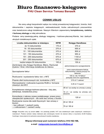 Biuro finansowo-księgowe FHU Clean Service Tomasz Banasik CENNIK USŁUG Na cenę usługi bezpośredni wpływ ma rodzaj prowadzonej księgowości, branŜa, ilość dokumentów i zapisów księgowych, wielowalutowość, liczba zatrudnionych pracowników oraz świadczone usługi dodatkowe. Naszym Klientom zapewniamy kompleksową, rzetelną i fachową obsługę w miłej atmosferze. Podane ceny zawierają pełną obsługę księgową i kadrowo-płacową Klienta, bez Ŝadnych ukrytych dodatkowych opłat. Liczba dokumentów w miesiącu KPiR Księga Handlowa do 15 dokumentów 170 zł 370 zł 16 - 50 dokumentów 270 zł 650 zł 51 - 100 dokumentów 370 zł 800 zł 101 - 150 dokumentów 470 zł 950 zł 151 - 200 dokumentów 570 zł 1100 zł 201 - 250 dokumentów 670 zł 1250 zł kaŜde kolejne 50 dokumentów 100 zł 150 zł Zamknięcie roku Księga Handlowa, Bilans, Rachunek Zysków i Strat, informacja dodatkowa do bilansu jednomiesięczne wynagrodzenie Sporządzanie faktur cena uwarunkowana ilością dokumentów i ilością pozycji na fakturze Rozliczanie i wystawienie faktur dot. z NFZ 100 zł. /do 10 faktur/ powyŜej cena do uzgodnienia Pisanie ofert konkursowych dot. kontraktów z NFZ 210 zł /1 zakres/ Wprowadzanie i rozliczanie kuponów RUM w formacie otwartym dot.NFZ 0,35 zł /1 kupon/ 35 zł./ za osobę na umowę o pracę Kompleksowa obsługa kadrowo-płacowa - listy płac, deklaracje, świadectwa pracy 15 zł / za osobę na umowę um. zlecenie Konsultacja z zakresu prawa podatkowego, prawa pracy, ubezpieczeń społecznych - dla osób bez umowy z biurem Rozliczenia roczne dla osób fizycznych bez umowy z biurem - bez odliczeń 1 osoba/2 osoby - z odliczeniami 1 osoba/2 osoby 120 zł 40 zł / 60 zł 70 zł / 90 zł Uwaga: Wszystkie ceny są cenami netto i nie zawierają podatku VAT oraz dodatkowych opłat urzędowych, skarbowych i notarialnych. Podane wartości naleŜy traktować jako orientacyjne. Cennik nie stanowi oferty w rozumieniu Art.66 Kodeksu Cywilnego i słuŜy jedynie do wyliczenia szacunkowych kosztów współpracy. Więcej informacji pod numerem telefonu 515-192-198, e-mail [email protected]