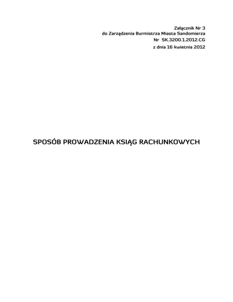 Załącznik Nr 3 do Zarządzenia Burmistrza Miasta Sandomierza Nr SK.3200.1.2012.CG z dnia 16 kwietnia 2012 SPOSÓB PROWADZENIA KSIĄG RACHUNKOWYCH 1. Zakładowy plan kont ♦ Urząd Miejski w Sandomierzu (jednostka budżetowa) Jednostka prowadzi księgi rachunkowe w oparciu o zakładowy plan kont (Załącznik Załącznik nr 3 do zarządzenia) zarządzenia opracowany na podstawie: planu kont stanowiącego załącznik nr 3 do „Rozporządzenie Ministra Finansów z dnia 5 lipca 2010 r. w sprawie szczególnych zasad rachunkowości oraz planów kont dla budżetu państwa, budżetów jednostek samorządu terytorialnego, jednostek budżetowych, samorządowych zakładów budżetowych, państwowych funduszy celowych oraz państwowych jednostek budżetowych mających siedzibę poza granicami Rzeczypospolitej Polskiej (Dz. U. Nr 128, poz. 861 z późn. zm.)” ♦ Gmina Miejska Sandomierz (jednostka samorządu terytorialnego) W jednostce samorządu terytorialnego dodatkowo prowadzone są księgi rachunkowe: - dotyczące wykonania budżetu, budżetu należności finansowych, zobowiązań finansowych, dochodów i wydatków funduszy pomocowych oraz stanu funduszy pomocowych, przychodów z tytułu prywatyzacji oraz operacji nie kasowych (Załącznik Załącznik nr 3a do zarządzenia) zarządzenia według planu kont stanowiącego załącznik nr 2 do „Rozporządzenie Ministra Finansów z dnia 5 lipca 2010 r. w sprawie szczególnych zasad rachunkowości oraz planów kont dla budżetu państwa, budżetów jednostek samorządu terytorialnego, jednostek budżetowych, samorządowych zakładów budżetowych, państwowych funduszy celowych oraz państwowych jednostek budżetowych mających siedzibę poza granicami Rzeczypospolitej Polskiej (Dz. U. Nr 128, poz. 861 z późn. zm.)” - do prowadzenia zasad rachunkowości w zakresie zadań finansowanych z wykorzystaniem środków europejskich j s t (Załącznik nr 3b) - wykaz zbiorów danych tworzących księgi rachunkowe na komputerowych nośnikach danych (Załącznik nr 3c) Zakładowy plan kont zawiera wykaz kont księgi głównej i wykaz ksiąg pomocniczych oraz opis przyjętych przez jednostkę zasad klasyfikacji zdarzeń, a także zasady prowadzenia kont ksiąg pomocniczych oraz ich powiązania z kontami księgi głównej. 2 Załącznik 3a do Zarządzenia Burmistrza Miasta Sandomierza Nr SK.3200.1.2012.CG z dnia 16 kwietnia 2012 2. Wykaz ksiąg rachunkowych Zakładowy plan kont Urzędu Miejskiego w Sandomierzu obejmuje podane poniżej konta służące do księgowania operacji gospodarczych występujących w jednostce : Konta bilansowe Zespół 0 – Majątek trwały 011 Środki trwałe 013 Pozostałe środki trwałe 015 Mienie zlikwidowanych jednostek 016 Dobra kultury 020 Wartości niematerialne i prawne 030 Długoterminowe aktywa finansowe 071 Umorzenie środków trwałych oraz wartości niematerialnych i prawnych 072 Umorzenie pozostałych środków trwałych oraz wartości niematerialnych i prawnych oraz zbiorów bibliotecznych 073 Odpisy aktualizujące długoterminowe aktywa finansowe 080 Inwestycje (środki trwałe w budowie) Zespół 1 – Środki pieniężne i rachunki bankowe 130 Rachunek bieżący jednostki 135 Rachunki środków funduszy specjalnego przeznaczenia 139 Inne rachunki bankowe 140 Krótkoterminowe papiery wartościowe i inne środki pieniężne 141 Środki pieniężne w drodze Zespół 2 – Rozrachunki i roszczenia 201 Rozrachunki z odbiorcami i dostawcami 221 Należności z tytułu dochodów budżetowych 222 Rozliczenie dochodów budżetowych 223 Rozliczenie wydatków budżetowych 224 Rozliczenie dotacji budżetowych oraz płatności z budżetu środków europejskich 225 Rozrachunki z budżetami 226 Długoterminowe należności budżetowe 3 229 Pozostałe rozrachunki publicznoprawne 231 Rozrachunki z tytułu wynagrodzeń 234 Pozostałe rozrachunki z pracownikami 240 Pozostałe rozrachunki 290 Odpisy aktualizujące należności Zespół 3 – Materiały i towary 310 Materiały Zespół 4 – Koszty według rodzajów i ich rozliczenie 400 Amortyzacja 401 Zużycie materiałów i wyposażenia 402 Usługi obce 403 Podatki i opłaty 404 Wynagrodzenia 405 Ubezpieczenia społeczne i inne świadczenia 409 Pozostałe koszty rodzajowe 490 Rozliczenie kosztów Zespół 7 – Przychody i koszty ich uzyskania 700 Sprzedaż produktów i koszt ich wytworzenia 720 Przychody z tytułu dochodów budżetowych 750 Przychody finansowe 751 Koszty finansowe 760 Pozostałe przychody operacyjne 761 Pozostałe koszty operacyjne 770 Zyski nadzwyczajne 771 Straty nadzwyczajne Zespół 8 – Fundusze, rezerwy i wynik finansowy 800 Fundusz jednostki 810 Dotacje budżetowe, płatności z budżetu środków europejskich oraz środki z budżetu na inwestycje 840 Rezerwy i rozliczenia międzyokresowe przychodów 851 Zakładowy fundusz świadczeń socjalnych 855 Fundusz mienia zlikwidowanych jednostek 860 Wynik finansowy 4 Konta pozabilansowe 975 Wydatki strukturalne 980 Plan finansowy wydatków budżetowych 981 Plan finansowy niewygasających wydatków 998 Zaangażowanie wydatków budżetowych roku bieżącego 999 Zaangażowanie wydatków budżetowych przyszłych lat Księgi pomocnicze tworzy się do następujących kont księgi głównej : 011 „Środki trwałe” według: - księgi inwentarzowej - tabeli amortyzacyjnej. Księga inwentarzowa prowadzona jest w sposób chronologiczny: - dla wszystkich środków trwałych - dla wszystkich środków trwałych z podziałem na grupy odpowiadające KŚT i zawiera następujące informacje: - datę przyjęcia do użytkowania, numer i rodzaj dowodu - numer inwentarzowy obiektu - nazwę środka trwałego - specyfikację wszystkich części składających się na zespół komputerowy lub inny składający się z określonych części złożony środek trwały - wartość początkową środka trwałego i wartości poszczególnych części składowych - wartość po aktualizacji - wartość po ulepszeniu - symbol klasyfikacji 