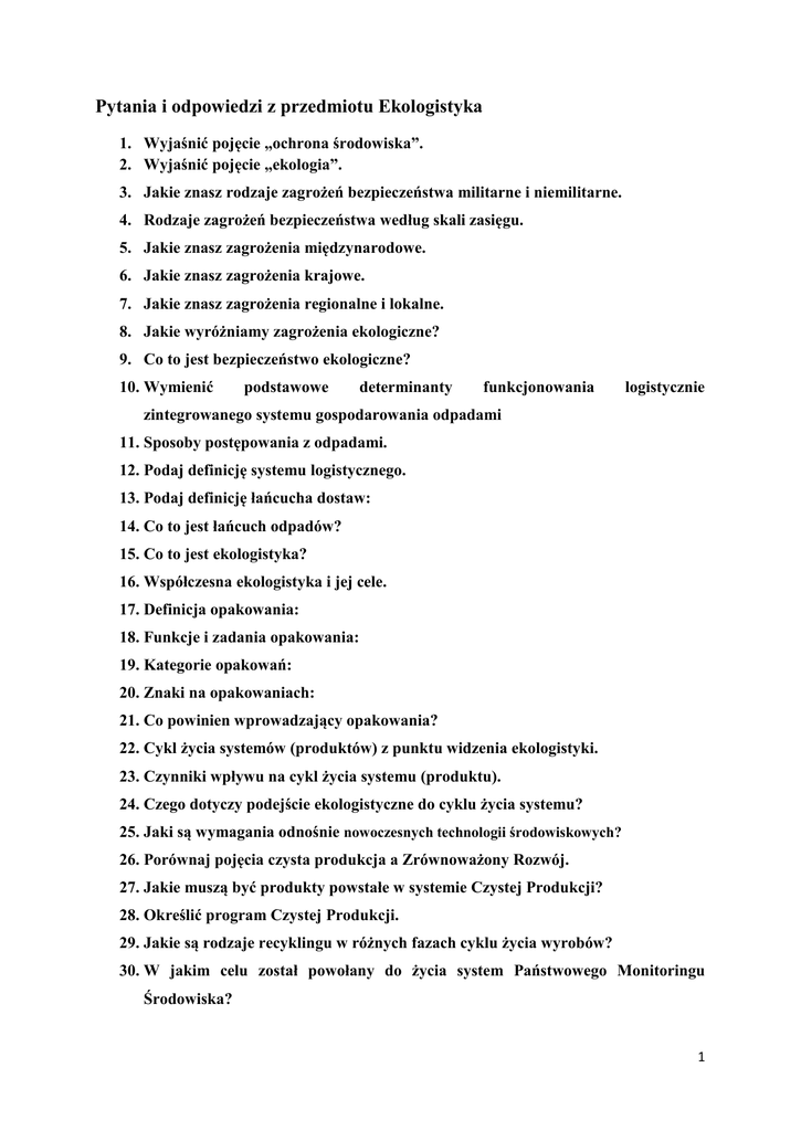 Pytania i odpowiedzi z przedmiotu Ekologistyka 1. Wyjaśnić pojęcie „ochrona środowiska”. 2. Wyjaśnić pojęcie „ekologia”. 3. Jakie znasz rodzaje zagrożeń bezpieczeństwa militarne i niemilitarne. 4. Rodzaje zagrożeń bezpieczeństwa według skali zasięgu. 5. Jakie znasz zagrożenia międzynarodowe. 6. Jakie znasz zagrożenia krajowe. 7. Jakie znasz zagrożenia regionalne i lokalne. 8. Jakie wyróżniamy zagrożenia ekologiczne? 9. Co to jest bezpieczeństwo ekologiczne? 10. Wymienić podstawowe determinanty funkcjonowania logistycznie zintegrowanego systemu gospodarowania odpadami 11. Sposoby postępowania z odpadami. 12. Podaj definicję systemu logistycznego. 13. Podaj definicję łańcucha dostaw: 14. Co to jest łańcuch odpadów? 15. Co to jest ekologistyka? 16. Współczesna ekologistyka i jej cele. 17. Definicja opakowania: 18. Funkcje i zadania opakowania: 19. Kategorie opakowań: 20. Znaki na opakowaniach: 21. Co powinien wprowadzający opakowania? 22. Cykl życia systemów (produktów) z punktu widzenia ekologistyki. 23. Czynniki wpływu na cykl życia systemu (produktu). 24. Czego dotyczy podejście ekologistyczne do cyklu życia systemu? 25. Jaki są wymagania odnośnie nowoczesnych technologii środowiskowych? 26. Porównaj pojęcia czysta produkcja a Zrównoważony Rozwój. 27. Jakie muszą być produkty powstałe w systemie Czystej Produkcji? 28. Określić program Czystej Produkcji. 29. Jakie są rodzaje recyklingu w różnych fazach cyklu życia wyrobów? 30. W jakim celu został powołany do życia system Państwowego Monitoringu Środowiska? 1 31. Do czego wykorzystywane są informacje z Państwowego Monitoringu Środowiska? 32. W jakim zakresie prowadzone są badania monitoringowe Państwowego Monitoringu Środowiska? 33. Jakie są najczęstsze składniki kosztów logistycznych? 34. Na czym polega redukcja kosztów fizycznego przepływu materiałów w przedsiębiorstwie? 35. Podaj przykładowe koszty logistyczne w firmie. 36. Co to są koszty fizycznego przepływu materiałów? 37. Przedstaw sposób kalkulacji ogólnych całkowitych kosztów logistyki. 38. Podaj składniki kosztów odpadów. 2