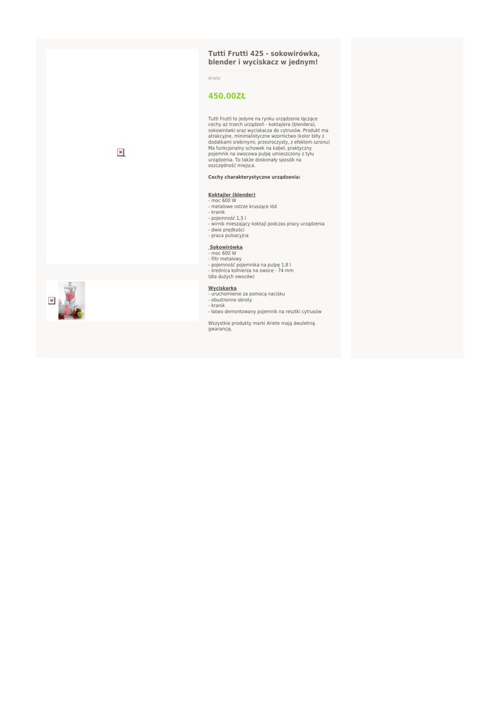 Tutti Frutti 425 - sokowirówka, blender i wyciskacz w jednym! Ariete 450.00ZŁ Tutti Frutti to jedyne na rynku urządzenie łączące cechy aż trzech urządzeń - koktajlera (blendera), sokowirówki oraz wyciskacza do cytrusów. Produkt ma atrakcyjne, minimalistyczne wzornictwo (kolor biłly z dodatkami srebrnymi, przezroczysty, z efektem szronu) Ma funkcjonalny schowek na kabel, praktyczny pojemnik na owocowa pulpę umieszczony z tyłu urządzenia. To także doskonały sposób na oszczędność miejsca. Cechy charakterystyczne urządzenia: Koktajler (blender) - moc 600 W - metalowe ostrze kruszące lód - kranik - pojemność 1,5 l - wirnik mieszający koktajl podczas pracy urządzenia - dwie prędkości - praca pulsacyjna Sokowirówka - moc 600 W - filtr metalowy - pojemność pojemnika na pulpę 1,8 l - średnica kołnierza na owoce - 74 mm (dla dużych owoców) Wyciskarka - uruchomienie za pomocą nacisku - obustronne obroty - kranik - łatwo demontowany pojemnik na resztki cytrusów Wszystkie produkty marki Ariete mają dwuletnią gwarancję.