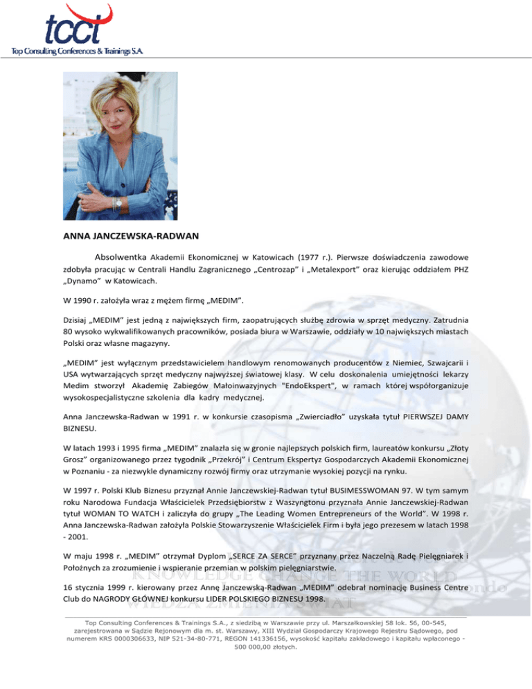 ANNA JANCZEWSKA-RADWAN Absolwentka Akademii Ekonomicznej w Katowicach (1977 r.). Pierwsze doświadczenia zawodowe zdobyła pracując w Centrali Handlu Zagranicznego „Centrozap” i „Metalexport” oraz kierując oddziałem PHZ „Dynamo” w Katowicach. W 1990 r. założyła wraz z mężem firmę „MEDIM”. Dzisiaj „MEDIM” jest jedną z największych firm, zaopatrujących służbę zdrowia w sprzęt medyczny. Zatrudnia 80 wysoko wykwalifikowanych pracowników, posiada biura w Warszawie, oddziały w 10 największych miastach Polski oraz własne magazyny. „MEDIM” jest wyłącznym przedstawicielem handlowym renomowanych producentów z Niemiec, Szwajcarii i USA wytwarzających sprzęt medyczny najwyższej światowej klasy. W celu doskonalenia umiejętności lekarzy Medim stworzył Akademię Zabiegów Małoinwazyjnych "EndoEkspert", w ramach której współorganizuje wysokospecjalistyczne szkolenia dla kadry medycznej. Anna Janczewska-Radwan w 1991 r. w konkursie czasopisma „Zwierciadło” uzyskała tytuł PIERWSZEJ DAMY BIZNESU. W latach 1993 i 1995 firma „MEDIM” znalazła się w gronie najlepszych polskich firm, laureatów konkursu „Złoty Grosz” organizowanego przez tygodnik „Przekrój” i Centrum Ekspertyz Gospodarczych Akademii Ekonomicznej w Poznaniu - za niezwykle dynamiczny rozwój firmy oraz utrzymanie wysokiej pozycji na rynku. W 1997 r. Polski Klub Biznesu przyznał Annie Janczewskiej-Radwan tytuł BUSIMESSWOMAN 97. W tym samym roku Narodowa Fundacja Właścicielek Przedsiębiorstw z Waszyngtonu przyznała Annie Janczewskiej-Radwan tytuł WOMAN TO WATCH i zaliczyła do grupy „The Leading Women Entrepreneurs of the World”. W 1998 r. Anna Janczewska-Radwan założyła Polskie Stowarzyszenie Właścicielek Firm i była jego prezesem w latach 1998 - 2001. W maju 1998 r. „MEDIM” otrzymał Dyplom „SERCE ZA SERCE” przyznany przez Naczelną Radę Pielęgniarek i Położnych za zrozumienie i wspieranie przemian w polskim pielęgniarstwie. 16 stycznia 1999 r. kierowany przez Annę Janczewską-Radwan „MEDIM” odebrał nominację Business Centre Club do NAGRODY GŁÓWNEJ konkursu LIDER POLSKIEGO BIZNESU 1998. _____________________________________________________________________________________________________ Top Consulting Conferences & Trainings S.A., z siedzibą w Warszawie przy ul. Marszałkowskiej 58 lok. 56, 00-545, zarejestrowana w Sądzie Rejonowym dla m. st. Warszawy, XIII Wydział Gospodarczy Krajowego Rejestru Sądowego, pod numerem KRS 0000306633, NIP 521-34-80-771, REGON 141336156, wysokość kapitału zakładowego i kapitału wpłaconego 500 000,00 złotych. W marcu 1999 r. Kolegium Redakcyjne „Trybuny Śląskiej” przyznało Prezes Annie Janczewskiej-Radwan MIEJSCE W LOŻY LIDERÓW 1998 r. W 2001 r. miesięcznik „Home & Market” zaliczył Panią Annę Janczewską-Radwan do 50 najbardziej wpływowych kobiet w Polsce. W 2002 r. Pani Anna Janczewska-Radwan ukończyła roczny kurs pt. „Management 2002”, który jest programem rozwoju umiejętności menedżerskich i poprawy efektywności firm – uczestników, zorganizowany przez Kanadyjski Instytut Zarządzania we współpracy z Harvard Business School Publishing. W roku 2003 Anna Janczewska-Radwan została Wiceprezesem Ogólnopolskiej Izby Gospodarczej Wyrobów Medycznych „POLMED”. W latach 2004 – 2008 Pani Anna Janczewska-Radwan była Członkiem Rady Zamówień Publicznych przy Prezesie Urzędu Zamówień Publicznych. W 2006 r. Pani Anna Janczewska-Radwan otrzymała dyplom za wkład w rozwój wideochirurgii w Polsce, przyznany z okazji 15-lecia Sekcji Wideochirurgii Towarzystwa Chirurgów Polskich. W roku 2008 r. Pani Anna Janczewska-Radwan objęła funkcję Prezesa Ogólnopolskiej Izby Gospodarczej Wyrobów Medycznych „POLMED”. Od 1993 r. Medim jest aktywnym członkiem BCC. _____________________________________________________________________________________________________ Top Consulting Conferences & Trainings S.A., z siedzibą w Warszawie przy ul. Marszałkowskiej 58 lok. 56, 00-545, zarejestrowana w Sądzie Rejonowym dla m. st. Warszawy, XIII Wydział Gospodarczy Krajowego Rejestru Sądowego, pod numerem KRS 0000306633, NIP 521-34-80-771, REGON 141336156, wysokość kapitału zakładowego i kapitału wpłaconego 500 000,00 złotych.