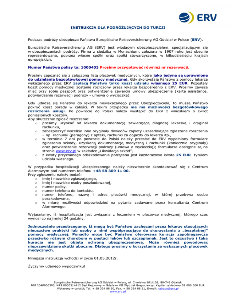 INSTRUKCJA DLA PODRÓ UJ CYCH DO TURCJI Podczas podró y ubezpiecza Pa stwa Europäische Reiseversicherung AG Oddzia w Polsce (ERV). Europäische Reiseversicherung AG (ERV) jest wiod cym ubezpieczycielem, specjalizuj cym si w ubezpieczeniach podró y. Firma z siedzib w Monachium, za ona w 1907 roku jest obecnie reprezentowana, poprzez w asne spó ki oraz spó ki stowarzyszone, w kilkudziesi ciu krajach europejskich. Numer Pa stwa polisy to: 1000403 Prosimy przygotowa równie nr rezerwacji. Prosimy zapozna si z za czon list placówek medycznych, które jako jedyne s uprawnione do udzielania bezgotówkowej pomocy medycznej. Gdy skorzystaj Pa stwo z pomocy lekarza wskazanego przez ERV zap ac Pa stwo tylko koszt udzia u w asnego 25 EUR. Pozosta y koszt pomocy medycznej zostanie rozliczony przez lekarza bezpo rednio z ERV. Prosimy zawsze mie przy sobie paszport oraz potwierdzenie zawarcia umowy ubezpieczenia (karta assistance, potwierdzenie rezerwacji podro y - umowa o wycieczk ). Gdy udadz si Pa stwo do lekarza niewskazanego przez Ubezpieczyciela, to musz Pa stwo pokry koszt porady w ca ci. W takim przypadku nie ma mo liwo ci bezgotówkowego rozliczenia us ugi. Po powrocie do Polski nale y wyst pi do ERV z wnioskiem o zwrot poniesionych kosztów. Aby skutecznie zg osi roszczenie: o prosimy uzyska od lekarza dokumentacj zawieraj diagnoz lekarsk i orygina rachunku, o zabezpieczy wszelkie inne orygina y dowodów zap aty uzasadniaj ce zg aszane roszczenia – np. rachunki (paragony) z apteki, rachunki za dojazdy do lekarza itp., o w terminie 7 dni po powrocie do Polski nale y przes do ERV wype niony formularz zg oszenia szkody, uzyskan dokumentacj medyczn i rachunki (koniecznie orygina y) oraz potwierdzenie rezerwacji podro y (umowa o wycieczk ); formularze dost pne s na stronie www.erv.pl w zak adce „Likwidacja szkód”, o z kwoty przyznanego odszkodowania potr cana jest ka dorazowo kwota 25 EUR tytu em udzia u w asnego. W przypadku hospitalizacji Ubezpieczonego nale y niezw ocznie skontaktowa si z Centrum Alarmowym pod numerem telefonu +48 58 309 11 00. Przy zg oszeniu nale y poda : o imi i nazwisko zg aszaj cego, o imi i nazwisko osoby poszkodowanej, o numer polisy, o numer telefonu do kontaktu, o numer telefonu, nazw i adres placówki medycznej, w której przebywa osoba poszkodowana, o w miar mo liwo ci odpowiedzie na pytania zadawane przez konsultanta Centrum Alarmowego. Wyja niamy, i hospitalizacja jest zwi zana z leczeniem w placówce medycznej, którego czas wynosi co najmniej 24 godziny. Jednocze nie przestrzegamy, i mog by Pa stwo zach cani przez lekarzy stosuj cych nieuczciwe praktyki lub osoby z nimi wspó pracuj ce do skorzystania z „bezp atnej” pomocy medycznej. Ponadto mo e by Pa stwu oferowana kuracja zapobiegawcza przeciwko ró nym chorobom w postaci leków lub szczepionek. Jest to oszustwo i taka kuracja nie jest obj ta ochron ubezpieczeniow . Mo e równie powodowa nieprzewidziane skutki uboczne. Dlatego prosimy o korzystanie ze wskazanych placówek medycznych. Niniejsza instrukcja wchodzi w ycie 01.05.2012r. yczymy udanego wypoczynku! Europäische Reiseversicherung AG Oddzia w Polsce, ul. Chmielna 101/102, 80-748 Gda sk NIP 2040000303, KRS 0000214412 S d Rejonowy w Gda sku VII Wydzia Gospodarczy, Kapita zak adowy 52 000 000 EUR Wp acony w ca ci; Tel. + 58 324 88 50, Fax. + 58 324 88 51, E-mail: [email protected] www.erv.pl