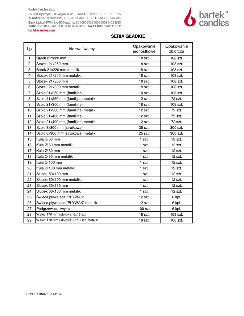 SERIA GŁADKIE Lp. Nazwa świecy Opakowanie jednostkowe Opakowanie zbiorcze 1. Barok 21x220 mm 18 szt. 108 szt. 2. Stożek 21x250 mm 18 szt. 108 szt. 3. Barok 21x220 mm metalik 18 szt. 108 szt. 4. Stożek 21x250 mm metalik 18 szt. 108 szt. 5. Stożek 21x300 mm 18 szt. 108 szt. 6. Stożek 21x300 mm metalik 18 szt. 108 szt. 7. Szpic 21x250 mm (familijna) 18 szt. 108 szt. 8. Szpic 21x250 mm (familijna) metalik 12 szt. 72 szt. 9. Szpic 21x300 mm (familijna) 18 szt. 108 szt. 10. Szpic 21x300 mm (familijna) metalik 12 szt. 72 szt. 11. Szpic 21x400 mm (familijna) 12 szt. 72 szt. 12. Szpic 21x400 mm (familijna) metalik 12 szt. 72 szt. 13. Szpic 8x300 mm (stroikowa) 25 szt. 300 szt. 14. Szpic 8x300 mm (stroikowa) metalik 25 szt. 300 szt. 15. Kula Ø 60 mm 1 szt. 12 szt. 16. Kula Ø 60 mm metalik 1 szt. 12 szt. 17. Kula Ø 80 mm 1 szt. 12 szt. 18. Kula Ø 80 mm metalik 1 szt. 12 szt. 19. Kula Ø 100 mm 1 szt. 12 szt. 20. Kula Ø 100 mm metalik 1 szt. 12 szt. 21. Słupek 50x100 mm 1 szt. 12 szt. 22. Słupek 50x100 mm metalik 1 szt. 12 szt. 23. Słupek 60x130 mm 1 szt. 12 szt. 24. Słupek 60x130 mm metalik 1 szt. 12 szt. 25. Świeca pływająca "PŁYWAK" 12 szt. 6 kpl. 26. Świeca pływająca "PŁYWAK" metalik 12 szt. 6 kpl. 27. Podgrzewacz zwykły 100 szt. 6 kpl. 28. Walec 170 mm (stołowa) 6x18 szt. 18 szt. 108 szt. 29. Walec 170 mm (stołowa) 6x18 szt. metalik 18 szt. 108 szt. CENNIK Z DNIA 01-01-2014