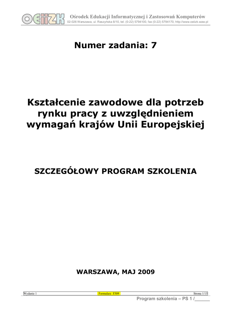 Ośrodek Edukacji Informatycznej i Zastosowań Komputerów 02-026 Warszawa, ul. Raszyńska 8/10, tel. (0-22) 5794100, fax (0-22) 5794170, http://www.oeiizk.waw.pl Numer zadania: 7 Kształcenie zawodowe dla potrzeb rynku pracy z uwzględnieniem wymagań krajów Unii Europejskiej SZCZEGÓŁOWY PROGRAM SZKOLENIA WARSZAWA, MAJ 2009 Wydanie 1 Formularz F509 Strona 1/15 Program szkolenia – PS 1 /______ Ośrodek Edukacji Informatycznej i Zastosowań Komputerów 02-026 Warszawa, ul. Raszyńska 8/10, tel. (0-22) 5794100, fax (0-22) 5794170, http://www.oeiizk.waw.pl Przeznaczenie Szkolenie przeznaczone jest dla czynnych zawodowo nauczycieli, posiadających pełne kwalifikacje do nauczanego przedmiotu (m.in. zasadniczych szkół zawodowych, techników, placówek kształcenia ustawicznego i praktycznego, ośrodków dokształcania i doskonalenia zawodowego umożliwiających uzyskanie i uzupełniane umiejętności i kwalifikacji zawodowych), dyrektorów szkół zawodowych oraz nauczycieli – doradców zawodowych, którzy są zainteresowani tematyką kształcenia zawodowego z uwzględnieniem wymagań krajów Unii Europejskiej. Wymagania wstępne Posiadanie kwalifikacji do nauczania przedmiotów zawodowych, zatrudnienie w szkole zawodowej, pełnienie funkcji dyrektora szkoły zawodowej lub pełnienie funkcji nauczyciela - doradcy zawodowego. Elementarne umiejętności posługiwania się komputerem i typowymi urządzeniami peryferyjnymi (klawiatura, monitor, mysz, drukarka) oraz podstawowa umiejętność pracy w środowisku Windows w zakresie: zarządzania folderami i plikami, uruchamiania programów, korzystania z podręcznych aplikacji Windows. Podstawowa umiejętność pracy w sieci Internet. Cele szkolenia Poznanie oczekiwań i rozwiązań krajów Unii Europejskiej, dotyczących kształcenia i szkolenia zawodowego. Uzyskanie informacji na temat dokumentów, regulujących wzajemne uznawanie wykształcenia i kwalifikacji zdobytych w różnych krajach Unii Europejskiej. Zdobycie wiedzy na temat działań podjętych przez UE w celu zapewnienia jakości w dziedzinie kształcenia i szkolenia zawodowego. Poznanie doświadczeń różnych krajów europejskich w zakresie współpracy dotyczącej kształcenia zawodowego. Poznanie nowej roli doradztwa zawodowego na europejskim rynku pracy. Zapoznanie ze sposobami wdrażania technologii informacyjnej i możliwościami jej wykorzystania w kształceniu i doskonaleniu zawodowym. Cele operacyjne Zostały opisane szczegółowo w kolejnych modułach szkolenia. Plan szkolenia Organizacja szkolenia przewiduje 25 godzin zajęć, w tym 10 godzin zajęć teoretycznych (wykłady) oraz 15 godzin zajęć praktycznych. Zajęcia będą odbywać się raz w tygodniu, w godzinach przedpołudniowych lub popołudniowych w postaci pięciu 5 godzinnych spotkań poświęconych realizacji poszczególnych modułów lub w systemie dwóch weekendowych sesji: pierwsza piątek, sobota, niedziela; druga – piątek, sobota – po 5 godzin każdego dnia. Wydanie 1 Formularz F509 Strona 2/15 Program szkolenia – PS 2 /______ Ośrodek Edukacji Informatycznej i Zastosowań Komputerów 02-026 Warszawa, ul. Raszyńska 8/10, tel. (0-22) 5794100, fax (0-22) 5794170, http://www.oeiizk.waw.pl Organizatorzy przewidują dodatkowo, poza godzinami wynikającymi ze specyfikacji zamówienia, organizację konferencji otwierającej, której celem będzie wprowadzenie uczestników w tematykę szkolenia, prezentacja podstawowych pojęć, terminów i dokumentów oraz przegląd wszystkich zagadnień, przewidzianych następnie do rozwinięcia podczas zajęć. Drugim ważnym celem będzie także zapoznanie z platformą MODDLE, na której będą umieszczone materiały dla uczestników szkoleń. Liczba uczestników w grupie – 25. Moduł 0 Liczba godzin Temat teoretycznych KSZTAŁCENIE ZAWODOWE DLA POTRZEB RYNKU PRACY Z UWZGLĘDNIENIEM WYMAGAŃ KRAJÓW UNII EUROPEJSKIEJ praktycznych 5 KONFERENCJA OTWIERAJĄCA CYKL SESJI DLA WSZYSTKICH UCZESTNIKÓW WYMAGANIA UNII EUROPEJSKIEJ WOBEC KSZTAŁCENIA ZAWODOWEGO 1. Zadaniem modułu będzie przedstawienie, co każdy europejski nauczyciel kształcenia zawodowego powinien wiedzieć na ten temat. 3 2 - 5 TECHNOLOGIA INFORMACYJNA I KOMUNIKACYJNA W KSZTAŁCENIU ZAWODOWYM DLA POTRZEB RYNKU PRACY Celem modułu jest pokazanie, w jaki sposób technologia informacyjna wpływa na zwiększenie skuteczności nauczania przedmiotów zawodowych w szkołach i innych placówkach oświatowych zajmujących się szkolnictwem zawodowym poprzez: 2. Wydanie 1 wzbudzanie i rozwijanie zainteresowania nowoczesnymi rozwiązaniami w zakresie technologii edukacyjnej wspierającymi pracę współczesnego nauczyciela zawodu; kształtowanie postaw kreatywnych u uczniów, nastawionych na lepsze wykorzystanie nowoczesnych technologii; wzmacnianie zaufania do własnych umiejętności związanych z wykorzystywaniem narzędzi informatycznych; przygotowanie do wykonywania zawodu w sposób profesjonalny. Formularz F509 Strona 3/15 Program szkolenia – PS 3 /______ Ośrodek Edukacji Informatycznej i Zastosowań Komputerów 02-026 Warszawa, ul. Raszyńska 8/10, tel. (0-22) 5794100, fax (0-22) 5794170, http://www.oeiizk.waw.pl Moduł Liczba godzin Temat teoretycznych praktycznych - 5 - 5 2 3 POLSKIE DOŚWIADCZENIA W ZAPEWNIANIU JAKOŚCI KSZTAŁCENIA ZAWODOWEGO – część 1 3. 4 Celem modułu jest próba prostego przekazu, co to znaczy „jakość kształcenia zawodowego” – dla systemu, dla szkoły, dla placówki kształcącej zawodowo, dla pojedynczego nauczyciela. POLSKIE DOŚWIADCZENIA W ZAPEWNIANIU JAKOŚCI KSZTAŁCENIA ZAWODOWEGO – część 2 Celem modułu jest pokazanie, jakie działania związane z podnoszeniem jakości szkolnictwa zawodowego były związane z odpowiedzią na potrzeby europejskiego rynku pracy. KIERUNKI DZIAŁAŃ W ZAKRESIE ZAPEWNIANIA JAKOŚCI KSZTAŁCENIA ZAWODOWEGO Celem modułu jest przedstawienie, w jaki sposób można podnosić jakość kształcenia zawodowego poprzez korzystan