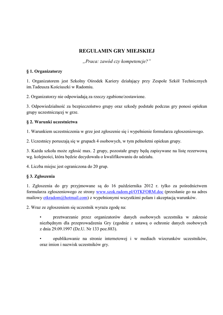 REGULAMIN GRY MIEJSKIEJ „Praca: zawód czy kompetencje?” § 1. Organizatorzy 1. Organizatorem jest Szkolny Ośrodek Kariery działający przy Zespole Szkół Technicznych im.Tadeusza Kościuszki w Radomiu. 2. Organizatorzy nie odpowiadają za rzeczy zgubione/zostawione. 3. Odpowiedzialność za bezpieczeństwo grupy oraz szkody podstałe podczas gry ponosi opiekun grupy uczestniczącej w grze. § 2. Warunki uczestnictwa 1. Warunkiem uczestniczenia w grze jest zgłoszenie się i wypełnienie formularza zgłoszeniowego. 2. Uczestnicy poruszają się w grupach 4 osobowych, w tym pełnoletni opiekun grupy. 3. Każda szkoła może zgłosić max. 2 grupy, pozostałe grupy będą zapisywane na listę rezerwową wg. kolejności, która będzie decydowała o kwalifikowaniu do udziału. 4. Liczba miejsc jest ograniczona do 20 grup. § 3. Zgłoszenia 1. Zgłoszenia do gry przyjmowane są do 16 października 2012 r. tylko za pośrednictwem formularza zgłoszeniowego ze strony www.szok.radom.pl/OTKFORM.doc (przesłanie go na adres mailowy [email protected]) z wypełnionymi wszystkimi polam i akceptacją warunków. 2. Wraz ze zgłoszeniem się uczestnik wyraża zgodę na: • przetwarzanie przez organizatorów danych osobowych uczestnika w zakresie niezbędnym dla przeprowadzenia Gry (zgodnie z ustawą o ochronie danych osobowych z dnia 29.09.1997 (Dz.U. Nr 133 poz.883). • opublikowanie na stronie internetowej i w mediach wizerunków uczestników, oraz imion i nazwisk uczestników gry. § 4. Zasady Gry Gra odbędzie się 18 października 2012r. w godzinach 10.00-15.30. Miejsce startu: świetlica szkolna w Zespole Szkół Techncznych w Radomiu, w przedziale czasowym od 9.40 do 10.00. 1. Aby rozpocząć grę uczestnicy muszą wcześnej wypełnić punktowane zadanie zerowe pod hasłem „IPD”, który dostępny jest w internecie: www.szok.radom.pl/OTKIPD.doc oraz przesłać formularz zgłoszeniowy www.szok.radom.pl/OTKFORM.doc 2. IPD jest formą zadania przed grą, brak wykonania zadania wiąże się z dyskwalifikacją grupy. 3. Przyjęcie do gry będzie potwierdzone mailem na adres pełoletniego opiekuna. 4. Podczas gry uczestnicy będą wykonywać zadania, dzięki którym zdobędą informacje związane z doradztwem zawodowym, a w szczególności na temat różnic między zawodem a kompetencjami. 5. Każda grupa odwiedzi max. 7 punktów kontrolnych, o których zostanie poinformowana podczas startu. Czas nie jest punktowany, jednak punkty aktywne będątylko do godziny 15.30. 6. Każda grupa wykona na punkcie jedno zadanie (w sumie podczas gry do 7 zadań) ocenione przez osobę znajdującą się na punkcie kontrolnym, a grę zakończy na starcie (świetlica szkolna z ZST w Radomiu) zdając kartę gry z punktacją. 7. Podczas gry nie można się rozdzielać, przemieszczanie się między punktami następuje w sposób dowolny. 8. Po zakończeniu gry, grupy mają za zadanie napisać wypracowanie na temat „Praca: zawód czy kompetencje – co o tym sądzisz?”, używając informacji zdobytych podczas gry (i nie tylko). 9. Wypracowania od każdej z grup po jednym przyjmowane będą mailowo ([email protected]) do 21 października 2012r. Brak wypracowania dyskwalifikuje grupę. § 5. Wyłanianie zwycięzców: 1. Warunkiem wyruszenia na grę jest wypełnienie przez uczestników IPD (zadania zerowego), formularza zgłoszeniowego, wykonanie wszystkich zadać z gry oraz przesłaniu wypracowania. 2. Podczas wyłaniania zwycięzkich grup te elementy będą oceniane. 3. Zadania będą punktowane w następujący sposób: • • • Zadanie zerowe (IPD) – max. 18 punktów Zadanie z każdego z punktów kontrolnych – max. 6 punktów (łącznie max. 42 punktów) Zadanie „wypracowanie” – max. 40 punktów § 6. Wręczenie nagrody Nagrody (1 miejsce) i upominki (wyróżnienia) będą przyznane uroczyście nie później miesiąc po zakończniu gry. § 7. Interpretacja regulaminu zależy od organizatora. W sprawach spornych informacji udziela organizator: Tomasz Magnowski tel. 692411443, mail: [email protected]