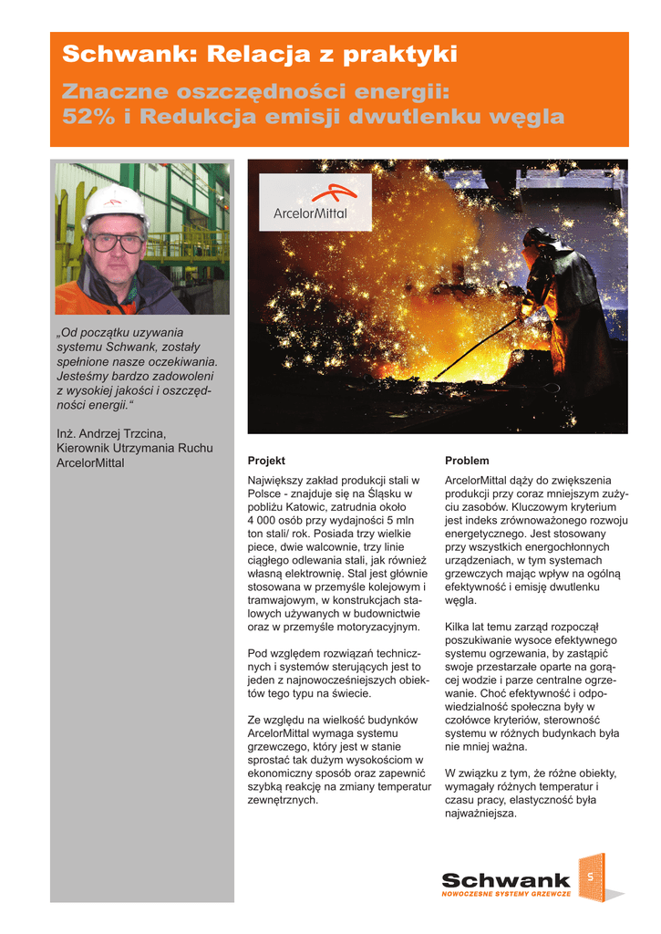 Schwank: Relacja z praktyki Znaczne oszczędności energii: 52% i Redukcja emisji dwutlenku węgla „Od początku uzywania systemu Schwank, zostały spełnione nasze oczekiwania. Jesteśmy bardzo zadowoleni z wysokiej jakości i oszczędności energii.“ Inż. Andrzej Trzcina, Kierownik Utrzymania Ruchu ArcelorMittal Projekt Problem Największy zakład produkcji stali w Polsce - znajduje się na Śląsku w pobliżu Katowic, zatrudnia około 4 000 osób przy wydajności 5 mln ton stali/ rok. Posiada trzy wielkie piece, dwie walcownie, trzy linie ciągłego odlewania stali, jak również własną elektrownię. Stal jest głównie stosowana w przemyśle kolejowym i tramwajowym, w konstrukcjach stalowych używanych w budownictwie oraz w przemyśle motoryzacyjnym. ArcelorMittal dąży do zwiększenia produkcji przy coraz mniejszym zużyciu zasobów. Kluczowym kryterium jest indeks zrównoważonego rozwoju energetycznego. Jest stosowany przy wszystkich energochłonnych urządzeniach, w tym systemach grzewczych mając wpływ na ogólną efektywność i emisję dwutlenku węgla. Pod względem rozwiązań technicznych i systemów sterujących jest to jeden z najnowocześniejszych obiektów tego typu na świecie. Ze względu na wielkość budynków ArcelorMittal wymaga systemu grzewczego, który jest w stanie sprostać tak dużym wysokościom w ekonomiczny sposób oraz zapewnić szybką reakcję na zmiany temperatur zewnętrznych. Kilka lat temu zarząd rozpoczął poszukiwanie wysoce efektywnego systemu ogrzewania, by zastąpić swoje przestarzałe oparte na gorącej wodzie i parze centralne ogrzewanie. Choć efektywność i odpowiedzialność społeczna były w czołówce kryteriów, sterowność systemu w różnych budynkach była nie mniej ważna. W związku z tym, że różne obiekty, wymagały różnych temperatur i czasu pracy, elastyczność była najważniejsza. Schwank: Relacja z praktyki Znaczne oszczędności energii: 52% i Redukcja emisji dwutlenku węgla Rozwiązanie Wyniki Po gruntownych poszukiwaniach najlepszego systemu, została podjęta decyzja, aby wybrać system ogrzewania Schwank ze względu na jego najwyższy współczynnik radiacji i niską emisję dwutlenku węgla. Ten nowy system ogrzewania jest bardzo elastyczny. Może nagrzać różnych obszarach wymagań produkcyjnych ciepło, a cały system jest sterowany z jednego miejsca. Z tej koncepcji osiągnęliśmy wysoki komfort we wszystkich miejscach pracy. Średnie oszczędności energii stanowi 52%. Udało nam się osiągnąć wyższy zwrot z inwestycji niż polityki obliczonej, w ciągu dwóch lat. Kolejnym zadaniem systemu grzewczego jest utrzymanie temperatury na stałym poziomie we wszystkich obszarach, podczas gdy każdy obszar ma inną temperaturę docelową. Od wdrożenia systemu grzewczego w 2006 roku, zawsze osiągane były temperatury docelowe nawet pomimo kilku surowych zim. Schwank dostarczył ponad 72 jasneych promienników podczerwieni oraz sterowniki temperatury ThermoControl Plus do zarządzania indywidualnymi strefami grzewczymi. Andrzej Trzcina, Dyrektor Administracji i konserwacja ArcelorMittal potwierdził, że z systemu, aby osiągnąć znaczne oszczędności energii, a co więcej, to cieszy się wysokiej jakości produkty i wysoki poziom usług z firmy Schwank. Polska Niemcy Schwank Polska Sp.zo.o ul. Targowa 5 41-503 Chorzów Tel.: +48-32-201 05 58 Fax: +48-32-201 05 59 E-mail: [email protected] Internet: www.schwank.pl Schwank GmbH Bremerhavener Str. 43 50735 Cologne Tel.: +49-(0)221-7176 0 Fax: +49-(0)221-7176 288 E-mail: [email protected] Internet: www.schwank.de