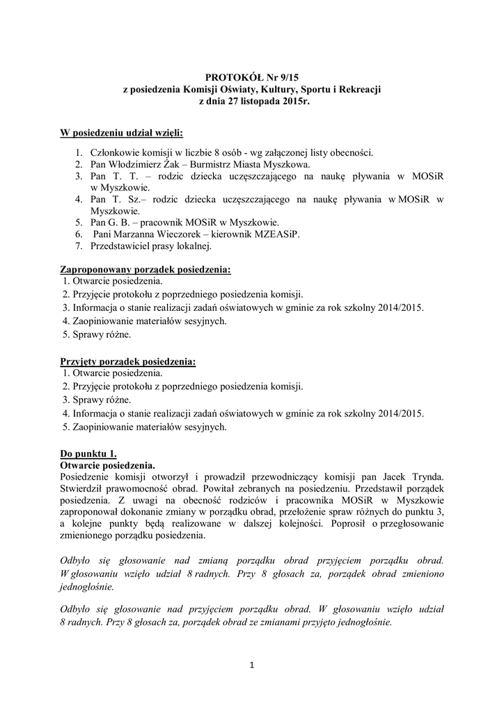 PROTOKÓŁ Nr 9/15 z posiedzenia Komisji Oświaty, Kultury, Sportu i Rekreacji z dnia 27 listopada 2015r. W posiedzeniu udział wzięli: 1. Członkowie komisji w liczbie 8 osób - wg załączonej listy obecności. 2. Pan Włodzimierz Żak – Burmistrz Miasta Myszkowa. 3. Pan T. T. – rodzic dziecka uczęszczającego na naukę pływania w MOSiR w Myszkowie. 4. Pan T. Sz.– rodzic dziecka uczęszczającego na naukę pływania w MOSiR w Myszkowie. 5. Pan G. B. – pracownik MOSiR w Myszkowie. 6. Pani Marzanna Wieczorek – kierownik MZEASiP. 7. Przedstawiciel prasy lokalnej. Zaproponowany porządek posiedzenia: 1. Otwarcie posiedzenia. 2. Przyjęcie protokołu z poprzedniego posiedzenia komisji. 3. Informacja o stanie realizacji zadań oświatowych w gminie za rok szkolny 2014/2015. 4. Zaopiniowanie materiałów sesyjnych. 5. Sprawy różne. Przyjęty porządek posiedzenia: 1. Otwarcie posiedzenia. 2. Przyjęcie protokołu z poprzedniego posiedzenia komisji. 3. Sprawy różne. 4. Informacja o stanie realizacji zadań oświatowych w gminie za rok szkolny 2014/2015. 5. Zaopiniowanie materiałów sesyjnych. Do punktu 1. Otwarcie posiedzenia. Posiedzenie komisji otworzył i prowadził przewodniczący komisji pan Jacek Trynda. Stwierdził prawomocność obrad. Powitał zebranych na posiedzeniu. Przedstawił porządek posiedzenia. Z uwagi na obecność rodziców i pracownika MOSiR w Myszkowie zaproponował dokonanie zmiany w porządku obrad, przełożenie spraw różnych do punktu 3, a kolejne punkty będą realizowane w dalszej kolejności. Poprosił o przegłosowanie zmienionego porządku posiedzenia. Odbyło się głosowanie nad zmianą porządku obrad przyjęciem porządku obrad. W głosowaniu wzięło udział 8 radnych. Przy 8 głosach za, porządek obrad zmieniono jednogłośnie. Odbyło się głosowanie nad przyjęciem porządku obrad. W głosowaniu wzięło udział 8 radnych. Przy 8 głosach za, porządek obrad ze zmianami przyjęto jednogłośnie. 1 Do punktu 2. Przyjęcie protokołu z poprzedniego posiedzenia komisji. Do protokołu uwag nie zgłoszono. Przy 8 głosach za, protokół został przyjęty jednogłośnie. Do punktu 3. Sprawy różne. Przewodniczący komisji pan Jacek Trynda powiedział, że z uwagi na obecność rodziców i pracownika MOSiR na komisji, którzy chcą radnych poinformować o jakiejś sytuacji oddaje im głos. Pan G. B. pracownik MOSiR przywitał pana Burmistrza i radnych. Jestem pracownikiem MOSiR w Myszkowie, mam funkcję ratownika i instruktora pływania. Pracuję tam prawie 20 lat i od pewnego czasu nie mogę wykonywać swojej pracy. Pan dyrektor Piotr Wysocki podejrzewa mnie, że działam na szkodę zakładu, więc chciałem nakreślić kilka sytuacji od początku. Przy MOSiR działa sekcja WOPR, jestem członkiem i instruktorem WOPR. Mogę prowadzić kursy na ratownika i szkolenia młodzieży w zakresie ratownictwa i pierwszej pomocy. Pan dyrektor Piotr Wysocki oskarżył mnie o to, że pobierałem pieniądze od rodziców i zatrzymywałem je dla siebie. Jest to nagrywane, więc mówię tak jak jest. Do sekcji WOPR potrzeba jest kilka elementów. Żeby prowadzić zajęcia trzeba mieć: fantoma, kilka hula hop, krążki. Są takie elementy, że hula hop są wiązane do krążków, dzieci przepływają przez trzy hula hop pod wodą, wyciągają manekina, jest to forma zabawy. Nie są to zajęcia typu pływanie, tam przychodzą dzieci, które już potrafią pływać. Są to zajęcia rozwojowe, bo ileś procent z tych dzieci będzie chciało zostać kiedyś ratownikiem wodnym i związać sobie z tym życie. Są godziny, w których pokazuję jak reanimować, jak udzielić pierwszej pomocy, jak ułożyć poszkodowanego. Zebrałem od rodziców 950 zł, bo nie miałem sprzętu, zakupiłem manekina, który do dzisiaj tam jest, krążki, hula hop, ale pan dyrektor w tym dniu zaraz dał innego instruktora, do którego te dzieci nie przyszły. Tego Pana dzieci też chodziły na tą sekcję (został wskazany jeden z rodziców będących na komisji). Dyrektor wystawił listę, ile Ci rodzice mi dali, oczywiście rodzice napisali, że mi nic nie dali, więc napisał pismo do pana prokuratora i dał je panu Andrzejowi, byłemu kierownikowi, bo teraz go gdzieś wyrzucił, bo też z nim robi taką jazdę, p. A. A. ma 62 lata. Prokurator wezwał mnie na przesłuchanie. Poszedłem, wziąłem rachunki za manekina, krążki i je przedstawiłem. Prokurator popatrzył na mnie, roześmiał się i mówił, że musiałby wszystkich nauczycieli w Myszkowie aresztować, bo jego dzieci też chodzą na korepetycje np. z angielskiego. Odpisał, że nie widzi znamion przestępstwa, więc pan dyrektor przyszedł i powiedział: tym razem Ci się kolego udało, ale następnym razem Ci się nie uda. Minęło ileś czasu, pracowałem w UKS, były jakieś zgrzyty, pozyskaliśmy unijne pieniądze na prowadzenie bezpłatnych zajęć pływania dla dzieci. Były cztery edycje, dwie wiosenne, dwie jesienne, pan dyrektor wypłacał mnie, panu R., panu S., panu N. B. i panu A. K. za I edycję, za II, za III, za IV edycję nam nie wypłacił, do dzisiaj jest mi winny 1,600 zł. Mówił: wypłacę Wam za chwilę, był wtedy prezesem UKS, do dzisiaj nie zobaczyłem tych pieniędzy, a mówi, że ja oszukuję. Jeżeli prowadzę zajęcia w brodziku, na zajęciach mam 19 osób, ale 3 z tych osób ma rodzeństwo po 4 lata i rodzic się mnie pyta, czy ten malczak może sobie biegać przy mnie, zgadzam się, bo pouczy się, popatrzy i na następny kurs czy za rok, czy za pół zapisze się znowu. Pan dyrektor przychodzi, wyrzuca dzieci z wody, bierze kartkę, spisuje na kartce. Te dzieci wystraszone są, 2 rodzice to widzieli, w czasie zajęć piętnaście po jedenastej, spisuje na kartce te dzieci, po czym wychodzi i ja prowadzę dalej zajęcia. To jest jakaś farsa. Jakby był w porządku, to jest pedagog, to by powiedział: jak wyjdą zrób zbiórkę, spiszę sobie te nazwiska. Jeżeli dziecko jest niepewn