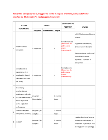 Kandydaci ubiegający się o przyjęcie na studia II stopnia oraz inne formy kształcenia składają do 14 lipca 2017 r. następujące dokumenty: DOKUMENT DO FORMA RODZAJ POBRANIA UWAGI DOKUMENTU oryginał tłumaczenie kopia wkleić kolorowe, aktualne zdjęcie Kwestionariusz 1 kwestionariusz kandydata 2 oryginały - - (dokument do pobrania na stronie internetowej) wypełniać czytelnymi, drukowanymi literami dane osobowe zapisywać łacińskimi literami, zgodnie z zapisem w paszporcie Oświadczenie oświadczenie o zapoznaniu się z 2 zasadami, trybem i 2 oryginały - - (dokument do pobrania na stronie internetowej) zakresem rekrutacji (zał. nr 5) dokumenty potwierdzające polskie pochodzenie, 3 na podstawie których konsul wystawia oryginały (do wglądu) - 1 zwykła kopia opinię o polskim pochodzeniu 4 Karta Polaka (jeśli oryginał (do kandydat ją posiada) wglądu) - 2 zwykłe kopie należy skopiować strony 5 paszport oryginał (do wglądu) - 2 zwykłe z danymi osobowymi, z kopie miejscem rejestracji oraz z wizą (jeśli kandydat ją posiada) 1 kopia zaświadczenie z lekarskie 6 stwierdzające brak przeciwskazań do oryginał oryginał tłumaczenie ui2 sztuki podjęcia studiów na tłumacz danym kierunku enia druk 1 zdr/u-10 tłumaczenie od tłumacza certyfikowanego lub bardzo dobre tłumaczenie własne o apostille występuje się do Departamentu Kontroli Jakości Wyksztalcenia dyplom (jeśli 7 kandydat go posiada) opatrzony apostille oryginał do wglądu Ministerstwa Edukacji tłumaczenie kopia Republiki Białoruś tłumaczenie należy wykonać u tłumacza certyfikowanego wypis z indeksu (program studiów ukończonych na 8 Białorusi, tzn. wykaz przedmiotów, ocen, oryginał tłumaczenie - tłumaczenie od tłumacza certyfikowanego godzin w tygodniu semestr po semestrze aż do Dyplomu) świadectwo tłumaczenie od tłumacza ukończenia szkoły 9 średniej (dyplom oryginał (do „atestat” wraz z wglądu) certyfikowanego lub tłumaczenie kopia bardzo dobre tłumaczenie własne załącznikiem z ocenami) 10 listy polecające od dwóch profesorów ze oryginał tłumaczenie listy sporządzone w języku rosyjskim lub białoruskim wymagają swojego kraju tłumaczenia od tłumacza certyfikowanego lub bardzo dobrego tłumaczenie własnego można składać listy polecające sporządzone w języku angielskim (nie wymagają tłumaczenia) zgoda na przyjęcie na studia wystawione przez uczelnię w Polsce lub zgoda pracownika wybranej 11 instytucji naukowej w Polsce stwierdzające gotowość oryginał (może być wydruk z emaila) przeprowadzenia projektu naukowego w danej instytucji ewentualnie: 12 dyplomy, certyfikaty, oryginał lub potwierdzenia osiągnięć etc. kopia - kopia