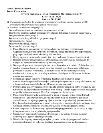 Anna Zalewska – Rudo Inessa Czerwińska Kryteria oceniania z języka rosyjskiego dla Gimnazjum nr 54 Klasy 1b, 2b, 3a,3b Rok szk. 2015/2016 Wymagania niezbędne do uzyskania poszczególnych stopni określa ogólnie WSO i kryteria przedmiotowej oceny z języka rosyjskiego: Formami sprawdzenia osiągnięć są: 1)praca klasowe oparte na podstawie programowej, waga 3 2)kartkówki oparte na celach poszczególnych lekcji, dotyczące bieżących treści waga 2 3)odpowiedzi uczniów, waga 1 4)prace w klasie, indywidualne i grupowe, waga 1 5)prace domowe, waga 1 6)aktywność na lekcji, waga 1 7)czytanie lub pisanie, waga 1 Prace klasowe i sprawdziany są zapowiadane z co najmniej tygodniowym wyprzedzeniem, krótkie kartkówki z ostatnich 3 lekcji nie muszą być zapowiadane, przy czym kartkówka trwa nie dłużej niż 20 minut. Oceny są jawne zarówno dla ucznia, jak i jego rodziców (prawnych opiekunów). Rodzice uczniów mają możliwość otrzymania poprawionych prac pisemnych do wglądu po uprzednim umówieniu się z nauczycielem. Nauczyciel sprawdza i omawia pisemne prace kontrolne w terminie 12 dni roboczych. Jeżeli z przyczyn losowych uczeń nie może napisać pracy klasowej z całą klasą, powinien to uczynić w terminie 12 dni roboczych od daty ustania przyczyny nieobecności. Nauczyciel na prośbę ucznia ma obowiązek ustalić termin i miejsce pisania sprawdzianu, Nienapisanie pracy klasowej w terminie dodatkowym ustalonym przez nauczyciela(nieusprawiedliwione) jest podstawą do wystawienia oceny niedostatecznej z danego zakresu materiału (bez możliwości poprawy oceny). Poprawa prac klasowych jest dobrowolna dla uczniów i musi się odbyć w ciągu 12 dni roboczych od daty oddania ocenionych prac. Formę i termin poprawy ustala nauczyciel na prośbę zainteresowanego. Uczeń przystępuje do niej tylko raz . Prace sprawdzające i testy są omawiane w klasie w oparciu o listę sprawdzanych umiejętności i analizę wyników, aby każdy uczeń mógł na podstawie punktacji zweryfikować, co wymaga poprawy i jak powinien uczyć się dalej. (samokontrola) Przy kontroli ustnej (odpowiedzi ustne, referaty, itp.)- nauczyciel ustnie na forum klasy wskazuje obszary poprawnie wykonane i te, które wymagają przećwiczenia. Uczeń ma prawo do dwukrotnego zgłoszenia nieprzygotowania się do lekcji w ciągu jednego semestru, bez wyjaśniania jego powodów Uczeń, który zapomniał ćwiczeń, podręcznika i w związku z tym nie ma pracy domowej musi zgłosić nieprzygotowanie; Nieodrobienie pracy domowej po wykorzystaniu limitu nieprzygotowań lub bez pisemnej informacji od rodziców skutkuje uzyskaniem oceny niedostatecznej. Podstawą wystawienia oceny klasyfikacyjnej są oceny bieżące o rożnym stopniu ważności oraz inne odnotowane w dzienniku lekcyjnym informacje o przebiegu pracy ucznia. Ocena klasyfikacyjna nie jest średnią arytmetyczną ocen bieżących; Roczna ocena klasyfikacyjna z danych zajęć edukacyjnych jest wystawiana na podstawie osiągnięć ucznia z trzech trymestrów. Ocena ta może zostać podwyższona o jeden stopień, jeżeli uczeń uzyskał bardzo wysokie wyniki z trzech etapów ligi naukowej z danego przedmiotu w bieżącym roku szkolnym; Wyróżniający się udział w konkursie, olimpiadzie, kole przedmiotowym lub lidze naukowej podlega ocenie bieżącej. Na klasyfikację końcową składają się klasyfikacyjne oceny roczne uzyskane w ciągu trzech lat trwania przedmiotu. Ocena klasyfikacyjna wystawiana jest na podstawie postępu dokonanego przez ucznia przez okres trwania przedmiotu. Uczeń jest oceniany w zakresie czterech podstawowych sprawności językowych: mówienia, pisania, czytania, słuchania. Uwzględnia się 5 poziomów wymagań, z których każdy odpowiada określonej ocenie szkolnej. 1. Ocena celująca Uczeń: - wyrożnia się w kilku zakresach : osiąga sukcesy w konkursach języka rosyjskiego lub w olimpiadach; wyjątkowe bogactwo leksyki, ciekawe ujęcie tematu, doskonała znajomość struktur gramatycznych, przez cały rok szkolny pracuje samodzielnie nad doskonaleniem znajomości języka i demonstruje na lekcjach wyniki tej pracy (np. recytuje wiersze w języku rosyjskim, prowadzi, po uzgodnieniu z nauczycielem, lekcję na zadany temat, wygłasza wykład w języku rosyjskim, lub przygotowuje i pokazuje prezentację multimedialną, pełni obowiązki asystenta nauczyciela itd.). 2. Ocena bardzo dobra Słuchanie Uczeń: -bez trudu rozumie vypowiedzi rosyjskojęzyczne zawierające treści zgodne z programem nauczania wypowiadane w normalnym tempie, -rozumie dłuższe instrukcje formułowane w języku rosyjskim i prawidłowo na nie reaguje, -sprawnie wyszukuje i rozumie informacje ogolne i szczegołowe zawarte w wypowiedziach i dialogach, -rozumie ogolny sens skomplikowanych tekstow. Mówienie Uczeń: -swobodnie zdobywa i udziela informacji w typowych sytuacjach dnia codziennego, -prezentuje w pełni swoje myśli, uczucia, spostrzeżdnia i pytania, -potrafi ustosunkować się do usłyszanych wypowiedzi, -posługuje się idiomami, -płynnie inicjuje, podtrzymuje i kończy rozmowę w sytuacji bezpośredniego kontaktu z rozmowcą, używając w tym celu odpowiednich środkow językowych, -formułuje wypowiedzi z użyciem bogatych ( struktur leksykalnych i składniowych, -potrafi dostosować styl swojej wypowiedzi do danej sytuacji i odbiorcy, -jego wypowiedzi pod względem fonetycznym są poprawne (z uwzględnieniem sporadycznych błędow w akcentualizacji) bez błędow w wymowie i intonacji. Czytanie Uczeń: -czyta ze zrozumieniem teksty rożnego rodzaju, -sprawnie znajduje szczegołowe informacje w tekście -potrafi ustosunkować się do przeczytanego tekstu. Pisanie Uczeń: -bez trudu dostrzega rożnice między fonetyczną a graficzną formą wyrazu, -bez trudu pisze wypowiedzi pisemne z zakresu przewidzianego materiałem nauczania, -potrafi wypełnić formularz w języku rosyjskim, -stosuje bogate formy leksykalne, struktury gramatyczne i skła