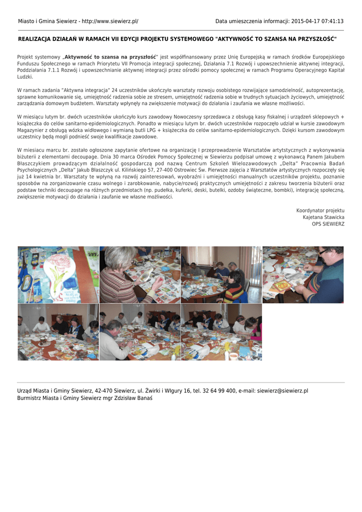 Miasto i Gmina Siewierz - http://www.siewierz.pl/ Data umieszczenia informacji: 2015-04-17 07:41:13 REALIZACJA DZIAŁAŃ W RAMACH VII EDYCJI PROJEKTU SYSTEMOWEGO "AKTYWNOŚĆ TO SZANSA NA PRZYSZŁOŚĆ" Projekt systemowy „Aktywność to szansa na przyszłość” jest współfinansowany przez Unię Europejską w ramach środków Europejskiego Funduszu Społecznego w ramach Priorytetu VII Promocja integracji społecznej, Działania 7.1 Rozwój i upowszechnienie aktywnej integracji, Poddziałania 7.1.1 Rozwój i upowszechnianie aktywnej integracji przez ośrodki pomocy społecznej w ramach Programu Operacyjnego Kapitał Ludzki. W ramach zadania ”Aktywna integracja” 24 uczestników ukończyło warsztaty rozwoju osobistego rozwijające samodzielność, autoprezentację, sprawne komunikowanie się, umiejętność radzenia sobie ze stresem, umiejętność radzenia sobie w trudnych sytuacjach życiowych, umiejętność zarządzania domowym budżetem. Warsztaty wpłynęły na zwiększenie motywacji do działania i zaufania we własne możliwości. W miesiącu lutym br. dwóch uczestników ukończyło kurs zawodowy Nowoczesny sprzedawca z obsługą kasy fiskalnej i urządzeń sklepowych + książeczka do celów sanitarno-epidemiologicznych. Ponadto w miesiącu lutym br. dwóch uczestników rozpoczęło udział w kursie zawodowym Magazynier z obsługą wózka widłowego i wymianą butli LPG + książeczka do celów sanitarno-epidemiologicznych. Dzięki kursom zawodowym uczestnicy będą mogli podnieść swoje kwalifikacje zawodowe. W miesiacu marcu br. zostało ogłoszone zapytanie ofertowe na organizację I przeprowadzenie Warsztatów artytstycznych z wykonywania biżuterii z elementami decoupage. Dnia 30 marca Ośrodek Pomocy Społecznej w Siewierzu podpisał umowę z wykonawcą Panem Jakubem Błaszczykiem prowadzącym działalność gospodarczą pod nazwą Centrum Szkoleń Wielozawodowych „Delta” Pracownia Badań Psychologicznych „Delta” Jakub Błaszczyk ul. Kilińskiego 57, 27-400 Ostrowiec Św. Pierwsze zajęcia z Warsztatów artystycznych rozpoczęły się już 14 kwietnia br. Warsztaty te wpłyną na rozwój zainteresowań, wyobraźni i umiejętności manualnych uczestników projektu, poznanie sposobów na zorganizowanie czasu wolnego i zarobkowanie, nabycie/rozwój praktycznych umiejętności z zakresu tworzenia biżuterii oraz podstaw techniki decoupage na różnych przedmiotach (np. pudełka, kuferki, deski, butelki, ozdoby świąteczne, bombki), integrację społeczną, zwiększenie motywacji do działania i zaufanie we własne możliwości. Koordynator projektu Kajetana Stawicka OPS SIEWIERZ Urząd Miasta i Gminy Siewierz, 42-470 Siewierz, ul. Żwirki i WIgury 16, tel. 32 64 99 400, e-mail: [email protected] Burmistrz Miasta i Gminy Siewierz mgr Zdzisław Banaś
