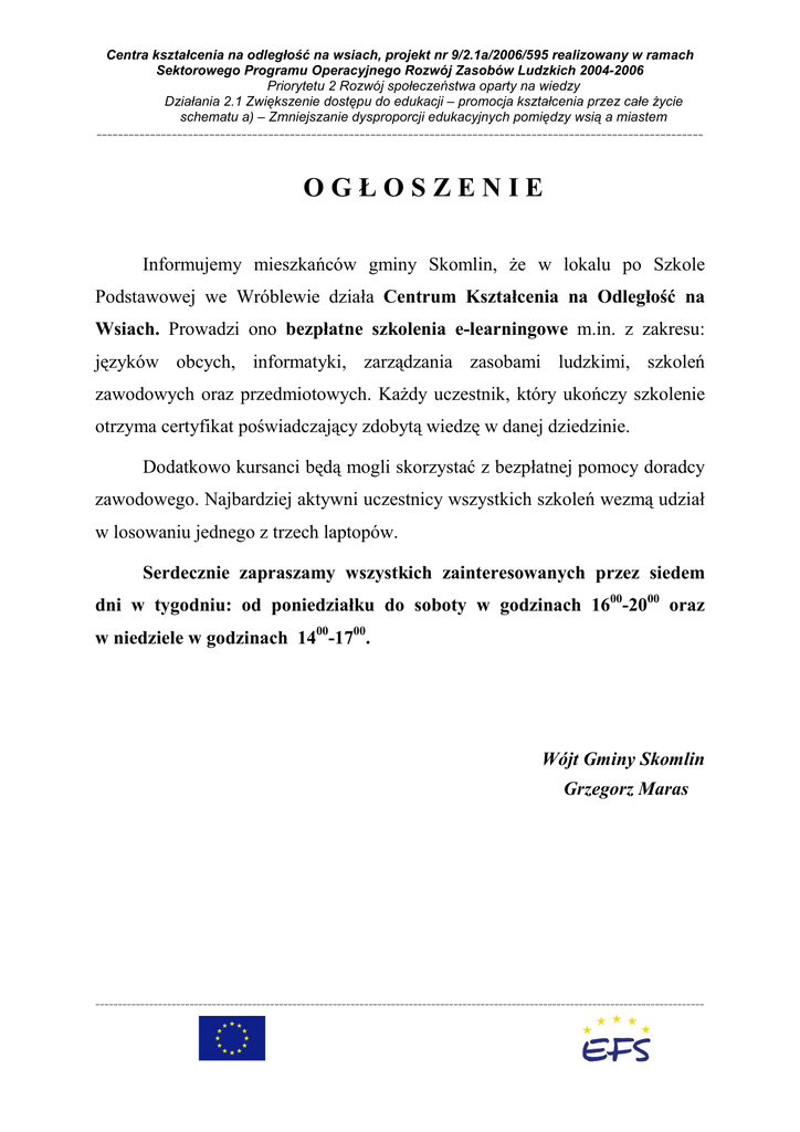 Centra kształcenia na odległość na wsiach, projekt nr 9/2.1a/2006/595 realizowany w ramach Sektorowego Programu Operacyjnego Rozwój Zasobów Ludzkich 2004-2006 Priorytetu 2 Rozwój społeczeństwa oparty na wiedzy Działania 2.1 Zwiększenie dostępu do edukacji – promocja kształcenia przez całe Ŝycie schematu a) – Zmniejszanie dysproporcji edukacyjnych pomiędzy wsią a miastem ----------------------------------------------------------------------------------------------------------------- OGŁOSZENIE Informujemy mieszkańców gminy Skomlin, Ŝe w lokalu po Szkole Podstawowej we Wróblewie działa Centrum Kształcenia na Odległość na Wsiach. Prowadzi ono bezpłatne szkolenia e-learningowe m.in. z zakresu: języków obcych, informatyki, zarządzania zasobami ludzkimi, szkoleń zawodowych oraz przedmiotowych. KaŜdy uczestnik, który ukończy szkolenie otrzyma certyfikat poświadczający zdobytą wiedzę w danej dziedzinie. Dodatkowo kursanci będą mogli skorzystać z bezpłatnej pomocy doradcy zawodowego. Najbardziej aktywni uczestnicy wszystkich szkoleń wezmą udział w losowaniu jednego z trzech laptopów. Serdecznie zapraszamy wszystkich zainteresowanych przez siedem dni w tygodniu: od poniedziałku do soboty w godzinach 1600-2000 oraz w niedziele w godzinach 1400-1700. Wójt Gminy Skomlin Grzegorz Maras ----------------------------------------------------------------------------------------------------------------------------------------