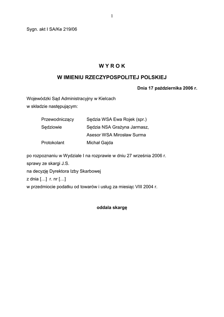 1 Sygn. akt I SA/Ke 219/06 WYROK W IMIENIU RZECZYPOSPOLITEJ POLSKIEJ Dnia 17 października 2006 r. Wojewódzki Sąd Administracyjny w Kielcach w składzie następującym: Przewodniczący Sędzia WSA Ewa Rojek (spr.) Sędziowie Sędzia NSA GraŜyna Jarmasz, Asesor WSA Mirosław Surma Protokolant Michał Gajda po rozpoznaniu w Wydziale I na rozprawie w dniu 27 września 2006 r. sprawy ze skargi J.S. na decyzję Dyrektora Izby Skarbowej z dnia […] r. nr […] w przedmiocie podatku od towarów i usług za miesiąc VIII 2004 r. oddala skargę 2 ISA/Ke 219/06 Uzasadnienie ZaskarŜoną decyzją z dnia […]. nr. […] Dyrektor Izby Skarbowej utrzymał w mocy decyzję nr. […] wydaną dnia […]. przez Naczelnika Urzędu Skarbowego w W. w sprawie określenia dla J. S. zobowiązania podatkowego w podatku od towarów i usług za miesiąc sierpień 2004 w kwocie […] zł. W uzasadnieniu wskazał, Ŝe w trakcie postępowania kontrolnego w zakresie prawidłowości rozliczenia podatku VAT za okres od stycznia do sierpnia 2004r. ustalono, Ŝe J. S. w miesiącu sierpniu 2004r. zaewidencjonował i odliczył podatek naliczony wynikający faktur VAT na zakup oleju napędowego, wystawionych przez podmiot nieuprawniony do ich wystawienia tj. F.H.U. A – A.P. wobec, którego zastosowano środek karny w postaci zakazu prowadzenia wszelkiej działalności gospodarczej na okres 2 lat. Prawomocne orzeczenie o zakazie prowadzenia działalności gospodarczej jest formą odpowiedzialności prawnej stwarzająca sytuację, w której osoba objęta zakazem zostaje wyeliminowana na pewien czas z udziału w Ŝyciu gospodarczym. Skoro prawomocne orzeczenie sądu jest wiąŜące dla wszystkich to A.P. od 19.IX.2003r. nie naleŜał do kręgu podmiotów uprawnionych do wystawiania faktur , wymienionych w § 11 rozporządzenia Min. Fin. z dnia 27.IV.2004r. w sprawie zwrotu podatku niektórym podatnikom, zaliczkowego zwrotu podatku, zasad wystawiania faktur, sposobu ich przechowywania oraz listy towarów i usług do których nie mają zastosowania zwolnienia od podatku od towarów i usług (Dz.U.Nr. 97 poz. 971). Zgodnie z § 14 ust. 2 pkt 1 lit. a rozporządzenia Min.Fin. z dnia 27.IV.2004r. w sprawie wykonania niektórych przepisów ustawy o podatku od towarów i usług, w przypadku gdy sprzedaŜ towarów lub usług została udokumentowania fakturami lub fakturami korygującymi wystawionymi przez podmiot nieistniejący lub nieuprawniony do wystawienia faktur lub faktur korygujących, faktury te nie stanowią podstawy do obniŜenia podatku naleŜnego oraz zwrotu róŜnicy podatku lub zwrotu podatku naliczonego. Skoro więc A.P. w dacie wystawienia przedmiotowych faktur nie był podmiotem uprawnionym do ich wystawienia, J. S. nie przysługiwało prawo obniŜenia podatku naleŜnego o podatek naliczony zawarty w tych fakturach. Organ wskazał nadto, Ŝe konstrukcja podatku VAT polega na tym, Ŝe nabywca towarów i usług moŜe ze swojego podatku potrącić podatek uiszczony przez zbywcę. Z materiału dowodowego zebranego w sprawie wynika zaś jednoznacznie, Ŝe wystawca zakwestionowanych faktur nie rozliczył wynikającej z nich kwot podatku VAT. Wskazał teŜ, 3 Ŝe wyrok ETS z dnia 12.I.2006r. w połączonych sprawach C- 354/03, C-355/03 i C 484/03 na który powoływał się podatnik tyczy innego stanu faktycznego. Orzeczenie to mówi bowiem, iŜ prawo podatnika do odliczenia podatku naliczonego VAT nie moŜe ucierpieć wskutek okoliczności, Ŝe w łańcuchu dostaw, którego część stanowią owe transakcje, o czym podatnik ten nie wie lub nie moŜe wiedzieć, inna transakcja, wcześniejsza lub późniejsza w stosunku do tej, która została dokonana przez niego, stanowi oszustwo w podatku VAT. W przedmiotowej sprawie podatnik był bezpośrednim uczestnikiem nieprawidłowej transakcji nie zaś transakcji wcześniejszych czy późniejszych w stosunku do zakwestionowanej. Organ podniósł nadto, Ŝe nie mógł dopuścić jako dowodu zawnioskowanych przez skarŜącego orzeczeń sądowych albowiem orzecznictwo sądowe nie moŜe stanowić dowodu w sprawie zgodnie z dyspozycja art.181 Ordynacji podatkowej. Na powyŜsze rozstrzygnięcie skargę do Wojewódzkiego Sądu Administracyjnego w Kielcach wniósł J. S.. Decyzji zarzucił naruszenie art. 2 i 7 w zw. z art. 8 Konstytucji RP, VI Dyrektywy Rady Unii Europejskiej oraz art. 121 § 1, 124 180,187§ 1 i 191 Ordynacji podatkowej wnosząc w konsekwencji o jej uchylenie. W uzasadnieniu skargi nie wskazał na czym miałoby polegać naruszenie art. 7 w zw. z art. 8 Konstytucji RP. Odnośnie zarzutu naruszenia art. 2 Konstytucji podniósł, Ŝe naruszenia upatruje w tym, Ŝe całą odpowiedzialność za wykonanie wyroku sądu powszechnego organy przeniosły na niego. Wyjaśnił, Ŝe jedyną konsekwencją naruszenia przez sprzedawcę zakazu prowadzenia działalności gospodarczej stał się zakaz odliczenia podatku VAT przez niego. Powołał się w tym zakresie na wybrane tezy z uzasadnienia Trybunału Konstytucyjnego sporządzonego w sprawie K 24/2003.Uzasadniając naruszenie VI Dyrektywy skarŜący wskazał Ŝe, w sytuacji gdy przepisy krajowe są niekorzystne dla podatnika ma on moŜliwość bezpośredniego stosowania przepisów VI Dyrektywy. Podkreślił, iŜ z orzecznictwa ETS wynika, Ŝe podatnicy mają prawo powoływać się na uprawnienia wynikające z bezpośrednio skutecznych przepisów prawa europejskiego. Ograniczenie prawa podatnika do odliczenia podatku naliczonego stanowi naruszenie zasady neutralności VAT, która została sformułowana w art. 2 I Dyrektywy Rady z dnia 11.IV.1967r. W piśmie procesowym złoŜonym na rozprawie dnia 27.IX. 2006r. będącym rozwinięciem skargi podatnik podniósł, Ŝe przy wydaniu decyzji organ pominął przepis art. 17 VI Dyrektywy w zw. z art. 2 ust. 1 I Dyrektywy RUE wyraŜający zasadę neutralności podatku VAT. W świetle powyŜszych przepisów oraz orzeczenia ETS z dnia 6.VII.2006r. w sprawach C- 439/04 i C440/04 organ dokonał 
