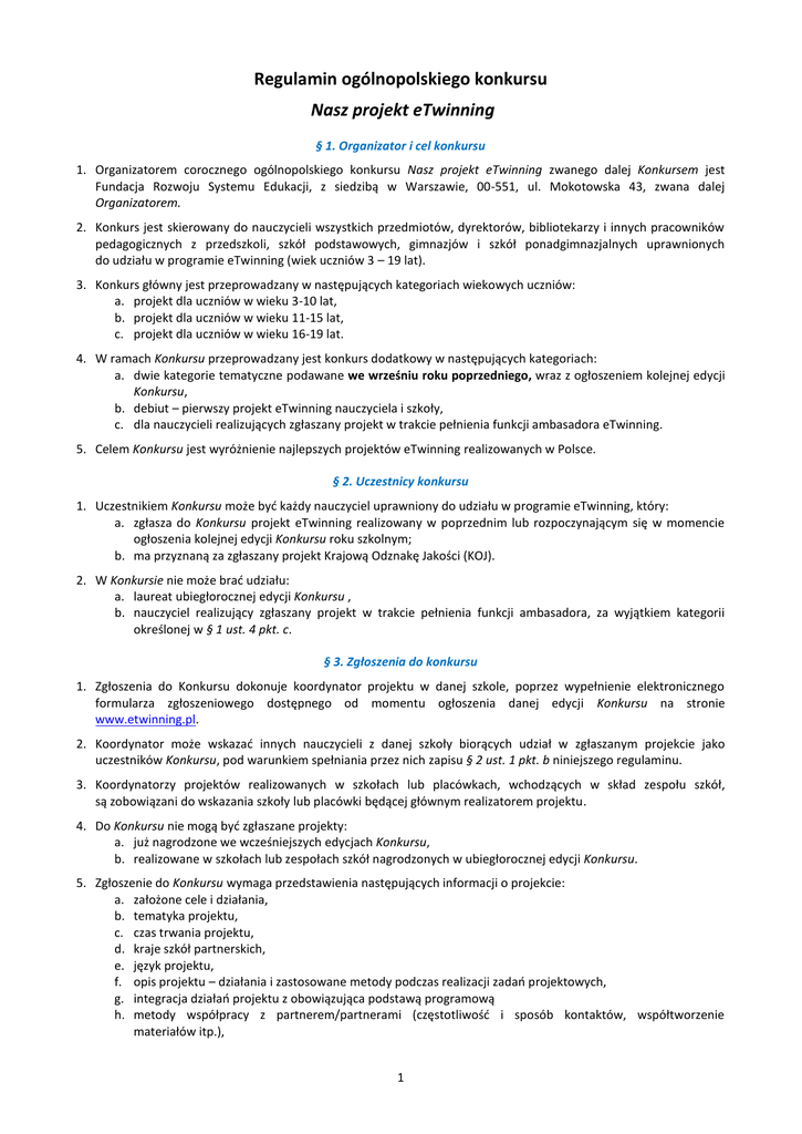Regulamin ogólnopolskiego konkursu Nasz projekt eTwinning § 1. Organizator i cel konkursu 1. Organizatorem corocznego ogólnopolskiego konkursu Nasz projekt eTwinning zwanego dalej Konkursem jest Fundacja Rozwoju Systemu Edukacji, z siedzibą w Warszawie, 00-551, ul. Mokotowska 43, zwana dalej Organizatorem. 2. Konkurs jest skierowany do nauczycieli wszystkich przedmiotów, dyrektorów, bibliotekarzy i innych pracowników pedagogicznych z przedszkoli, szkół podstawowych, gimnazjów i szkół ponadgimnazjalnych uprawnionych do udziału w programie eTwinning (wiek uczniów 3 – 19 lat). 3. Konkurs główny jest przeprowadzany w następujących kategoriach wiekowych uczniów: a. projekt dla uczniów w wieku 3-10 lat, b. projekt dla uczniów w wieku 11-15 lat, c. projekt dla uczniów w wieku 16-19 lat. 4. W ramach Konkursu przeprowadzany jest konkurs dodatkowy w następujących kategoriach: a. dwie kategorie tematyczne podawane we wrześniu roku poprzedniego, wraz z ogłoszeniem kolejnej edycji Konkursu, b. debiut – pierwszy projekt eTwinning nauczyciela i szkoły, c. dla nauczycieli realizujących zgłaszany projekt w trakcie pełnienia funkcji ambasadora eTwinning. 5. Celem Konkursu jest wyróżnienie najlepszych projektów eTwinning realizowanych w Polsce. § 2. Uczestnicy konkursu 1. Uczestnikiem Konkursu może byd każdy nauczyciel uprawniony do udziału w programie eTwinning, który: a. zgłasza do Konkursu projekt eTwinning realizowany w poprzednim lub rozpoczynającym się w momencie ogłoszenia kolejnej edycji Konkursu roku szkolnym; b. ma przyznaną za zgłaszany projekt Krajową Odznakę Jakości (KOJ). 2. W Konkursie nie może brad udziału: a. laureat ubiegłorocznej edycji Konkursu , b. nauczyciel realizujący zgłaszany projekt w trakcie pełnienia funkcji ambasadora, za wyjątkiem kategorii określonej w § 1 ust. 4 pkt. c. § 3. Zgłoszenia do konkursu 1. Zgłoszenia do Konkursu dokonuje koordynator projektu w danej szkole, poprzez wypełnienie elektronicznego formularza zgłoszeniowego dostępnego od momentu ogłoszenia danej edycji Konkursu na stronie www.etwinning.pl. 2. Koordynator może wskazad innych nauczycieli z danej szkoły biorących udział w zgłaszanym projekcie jako uczestników Konkursu, pod warunkiem spełniania przez nich zapisu § 2 ust. 1 pkt. b niniejszego regulaminu. 3. Koordynatorzy projektów realizowanych w szkołach lub placówkach, wchodzących w skład zespołu szkół, są zobowiązani do wskazania szkoły lub placówki będącej głównym realizatorem projektu. 4. Do Konkursu nie mogą byd zgłaszane projekty: a. już nagrodzone we wcześniejszych edycjach Konkursu, b. realizowane w szkołach lub zespołach szkół nagrodzonych w ubiegłorocznej edycji Konkursu. 5. Zgłoszenie do Konkursu wymaga przedstawienia następujących informacji o projekcie: a. założone cele i działania, b. tematyka projektu, c. czas trwania projektu, d. kraje szkół partnerskich, e. język projektu, f. opis projektu – działania i zastosowane metody podczas realizacji zadao projektowych, g. integracja działao projektu z obowiązująca podstawą programową h. metody współpracy z partnerem/partnerami (częstotliwośd i sposób kontaktów, współtworzenie materiałów itp.), 1 Regulamin konkursu Nasz projekt eTwinning i. j. k. l. zastosowane technologie informacyjno-komunikacyjne, atrakcyjnośd projektu dla jego uczestników, wypracowane materiały i rezultaty oraz ich przydatnośd na przyszłośd, ewaluacja projektu: podsumowanie projektu (osiągnięty poziom założonych celów, określenie ewentualnej wartości dodanej, nieprzewidzianej w momencie planowania projektu, napotkane problemy podczas realizacji itp.), mocne i słabe strony projektu – tzw. sukcesy i porażki projektu, sposób ewaluacji – czy i w jaki sposób uzyskiwano sygnał zwrotny od uczestników na etapie realizacji lub po ukooczeniu projektu (np. ankieta lub inny sposób monitorowania potrzeb uczestników, bieżąca analiza ryzyka w projekcie itp.), m. rozpowszechnianie projektu (możliwośd powtórzenia projektu przez inną szkołę lub szkoły z innych krajów). 6. Koordynator musi zapewnid Organizatorowi dostęp do TwinSpace projektu poprzez utworzenie konta gościa i podanie w zgłoszeniu danych do logowania. 7. Jeżeli większośd wypracowanych materiałów projektu znajduje się na innych portalach czy stronach internetowych, na TwinSpace projektu muszą znajdowad się odnośne linki. 8. Termin przesyłania zgłoszeo upływa w dniu 31 stycznia roku danej edycji Konkursu. § 4. Przebieg oceny formalnej i merytorycznej 1. Ocenę formalną zgłoszeo do Konkursu przeprowadza Organizator. 2. Ocenę merytoryczną projektów spełniających warunki formalne przeprowadza jury Konkursu, które powoływane jest na podstawie oddzielnego regulaminu. 3. W pierwszej kolejności oceniane są zgłoszenia do konkursu dodatkowego w kategoriach tematycznych i dla nauczycieli realizujących zgłaszany projekt w trakcie pełnienia funkcji ambasadora eTwinning. W przypadku niezakwalifikowania się projektu do grona laureatów, projekt jest ponownie oceniany w konkursie głównym, za wyjątkiem projektów określonych w § 1 ust. 4 pkt. c, które są oceniane tylko w konkursie dodatkowym. 4. Spośród projektów, które nie zostały laureatami konkursu w kategoriach opisanych w ust. 3 i będących pierwszym projektem eTwinning uczestnika konkursu i pierwszym, zrealizowanym w jego szkole, Krajowe Biuro eTwinning wskazuje projekt, który uzyskał największą liczbę punktów w ocenie merytorycznej, jako laureata w kategorii określonej w § 1 ust. 4 pkt. b, z zastrzeżeniem § 5 ust. 2. 5. Na podstawie informacji o projekcie określonych w § 3 ust. 5 i TwinSpace projektu ocena merytoryczna jest przeprowadzana w następujących kryteriach: a. innowacja pedagogiczna i kreatywnośd (powiązanie celów i działao projektu z założoną tematyką; w jaki sposób aspekty projektu uznad można za innowacyj