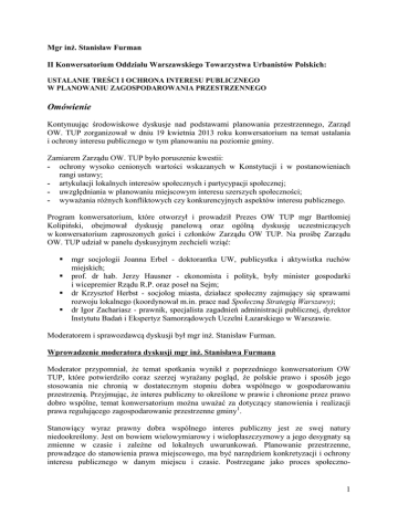 Mgr inż. Stanisław Furman II Konwersatorium Oddziału Warszawskiego Towarzystwa Urbanistów Polskich: USTALANIE TREŚCI I OCHRONA INTERESU PUBLICZNEGO W PLANOWANIU ZAGOSPODAROWANIA PRZESTRZENNEGO Omówienie Kontynuując środowiskowe dyskusje nad podstawami planowania przestrzennego, Zarząd OW. TUP zorganizował w dniu 19 kwietnia 2013 roku konwersatorium na temat ustalania i ochrony interesu publicznego w tym planowaniu na poziomie gminy. Zamiarem Zarządu OW. TUP było poruszenie kwestii: - ochrony wysoko cenionych wartości wskazanych w Konstytucji i w postanowieniach rangi ustawy; - artykulacji lokalnych interesów społecznych i partycypacji społecznej; - uwzględniania w planowaniu miejscowym interesu szerszych społeczności; - wyważania różnych konfliktowych czy konkurencyjnych aspektów interesu publicznego. Program konwersatorium, które otworzył i prowadził Prezes OW TUP mgr Bartłomiej Kolipiński, obejmował dyskusję panelową oraz ogólną dyskusję uczestniczących w konwersatorium zaproszonych gości i członków Zarządu OW TUP. Na prośbę Zarządu OW. TUP udział w panelu dyskusyjnym zechcieli wziąć: mgr socjologii Joanna Erbel - doktorantka UW, publicystka i aktywistka ruchów miejskich; prof. dr hab. Jerzy Hausner - ekonomista i polityk, były minister gospodarki i wicepremier Rządu R.P. oraz poseł na Sejm; dr Krzysztof Herbst - socjolog miasta, działacz społeczny zajmujący się sprawami rozwoju lokalnego (koordynował m.in. prace nad Społeczną Strategią Warszawy); dr Igor Zachariasz - prawnik, specjalista zagadnień administracji publicznej, dyrektor Instytutu Badań i Ekspertyz Samorządowych Uczelni Łazarskiego w Warszawie. Moderatorem i sprawozdawcą dyskusji był mgr inż. Stanisław Furman. Wprowadzenie moderatora dyskusji mgr inż. Stanisława Furmana Moderator przypomniał, że temat spotkania wynikł z poprzedniego konwersatorium OW TUP, które potwierdziło coraz szerzej wyrażany pogląd, że polskie prawo i sposób jego stosowania nie chronią w dostatecznym stopniu dobra wspólnego w gospodarowaniu przestrzenią. Przyjmując, że interes publiczny to określone w prawie i chronione przez prawo dobro wspólne, temat konwersatorium można uważać za dotyczący stanowienia i realizacji prawa regulującego zagospodarowanie przestrzenne gminy1. Stanowiący wyraz prawny dobra wspólnego interes publiczny jest ze swej natury niedookreślony. Jest on bowiem wielowymiarowy i wielopłaszczyznowy a jego desygnaty są zmienne w czasie i zależne od lokalnych uwarunkowań. Planowanie przestrzenne, prowadzące do stanowienia prawa miejscowego, ma być narzędziem konkretyzacji i ochrony interesu publicznego w danym miejscu i czasie. Postrzegane jako proces społeczno- 1 polityczny, w którym współuczestniczą urbaniści, ma służyć rzetelnemu wyważaniu różnych, często wzajemnie konfliktowych aspektów interesu publicznego w gospodarowaniu przestrzenią i łączyć troskę o dobro wspólne z prawami jednostek. Jednak daleko posunięta liberalizacja gospodarowania przestrzenią, postawy konsumpcyjne i apoteozowanie indywidualizmu w kulturze skutkują postrzeganiem przestrzeni głównie przez pryzmat interesów prywatnych i korporacyjnych i przyzwalaniem na dominację tych interesów nad interesami ogółu. Nie jest od tego niestety wolne także orzecznictwo sądów administracyjnych. System prawny nie tworzy warunków sprzyjających realizacji wskazanych w ustawach treści interesu publicznego w gospodarowaniu przestrzenią i nie chodzi tu tylko o ustawę o planowaniu i zagospodarowaniu przestrzennym, ale o szeroko pojęte otocznie prawne w jakim funkcjonuje ta ustawa. Na pasywność władz publicznych w ochronie interesu publicznego w gospodarowaniu przestrzenią wpływa też istotnie sytuacja finansów publicznych. Przy niskim poziomie kapitału społecznego i braku zaufania społecznego zawodzą ponadto zbiurokratyzowane procedury partycypacji społecznej w planowaniu przestrzennym. Konsekwencją są niska, jakość i chaos przestrzeni, rosnące wykluczenia społeczne i tracone korzyści ekonomiczne. Potrzeba zmiany tego stanu rzeczy jest niewątpliwa jednak jest ona trudna do przeprowadzenia. Brak po temu woli politycznej, dobrego prawa i sprawnej administracji. Dzisiejsze konwersatorium ma służyć prezentacji i wymianie poglądów na drogi i warunki restytucji pozycji interesu publicznego - zwłaszcza ładu przestrzennego - w działaniach podejmowanych w zakresie gospodarowania przestrzenią na poziomie gminy, gdzie poprzez stanowienie prawa miejscowego dokonuje się jego ostateczna konkretyzacja i są ustalone rygory jego ochrony. O pierwszą wypowiedź zwrócił się do dr Igora Zachariasza. Wypowiedź dr Igora Zachariasza ( tekst nadesłany przez autora wypowiedzi) Pojęcie interesu publicznego ma trwałe miejsce w historii państwa i prawa, jednakże zasadniczo zmieniło swoje funkcje na gruncie prawnym na przestrzeni ostatnich dwustu lat. Pojęcie to znane było już w prawie rzymskim, zgodnie ze słynną sentencją Ulpiana: Publicum ius est quod ad statum rei Romanae spectat, privatum quod ad singulorum utilitatem, służyło w tym okresie przede wszystkim odróżnianiu stosunków prywatnoprawnych od stosunków publicznoprawnych, wprowadzając do doktryny prawa tzw. kryterium utylitarności jako podstawę dla wyróżnienia stosunków prawnych o charakterze publicznym. 2 Prawo służące Rzymowi miało charakter prawa publicznego, służące jednostce, prawa prywatnego. Jednak w tym okresie, jak i także w czasach późniejszych, pojęcie to nie przyczyniało się do stworzenia dychotomicznego podziału na prawo prywatne i publiczne. Kryterium utylitarności, rozumiane dość swobodnie przez władcę, jako legitymizacja władzy, tak w czasach rzymskich, tak i w późniejszych państwach feudalnych czy policyjnych, służyło w istocie usprawiedliwieniu działań władcy, które on, poza wiążącym go prawem, uważał za podejmo