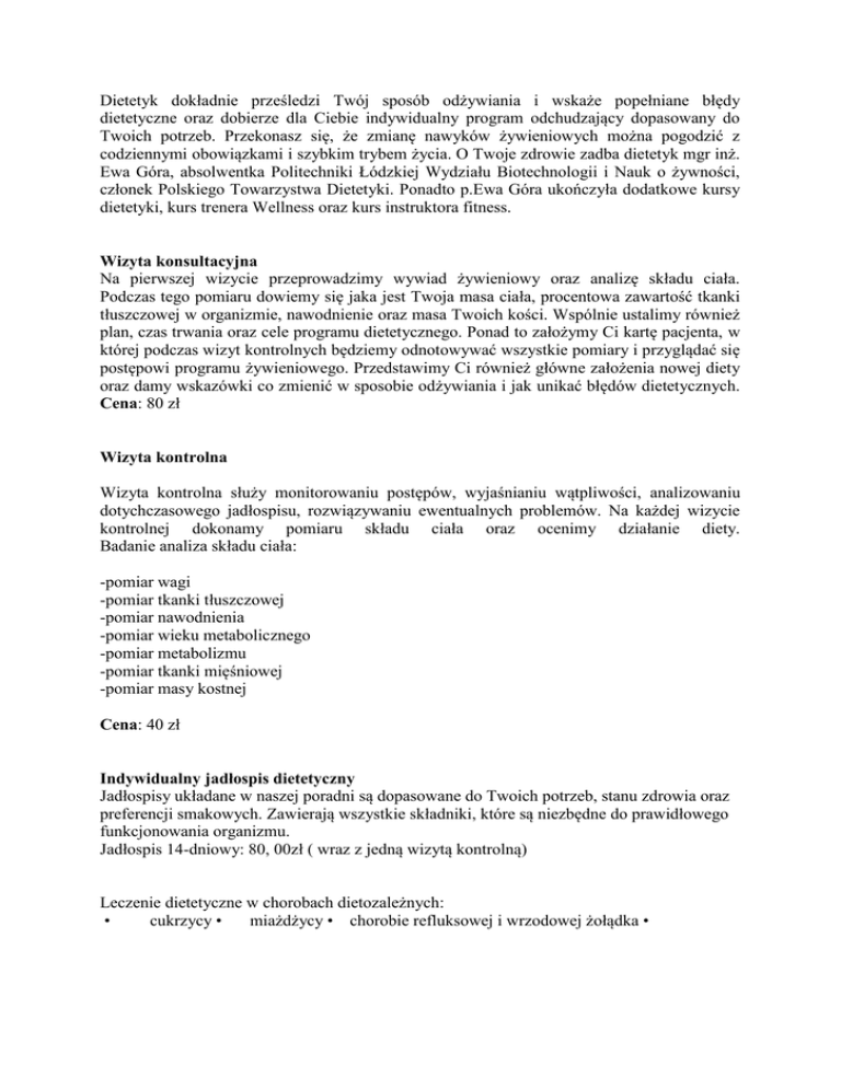 Dietetyk dokładnie prześledzi Twój sposób odżywiania i wskaże popełniane błędy dietetyczne oraz dobierze dla Ciebie indywidualny program odchudzający dopasowany do Twoich potrzeb. Przekonasz się, że zmianę nawyków żywieniowych można pogodzić z codziennymi obowiązkami i szybkim trybem życia. O Twoje zdrowie zadba dietetyk mgr inż. Ewa Góra, absolwentka Politechniki Łódzkiej Wydziału Biotechnologii i Nauk o żywności, członek Polskiego Towarzystwa Dietetyki. Ponadto p.Ewa Góra ukończyła dodatkowe kursy dietetyki, kurs trenera Wellness oraz kurs instruktora fitness. Wizyta konsultacyjna Na pierwszej wizycie przeprowadzimy wywiad żywieniowy oraz analizę składu ciała. Podczas tego pomiaru dowiemy się jaka jest Twoja masa ciała, procentowa zawartość tkanki tłuszczowej w organizmie, nawodnienie oraz masa Twoich kości. Wspólnie ustalimy również plan, czas trwania oraz cele programu dietetycznego. Ponad to założymy Ci kartę pacjenta, w której podczas wizyt kontrolnych będziemy odnotowywać wszystkie pomiary i przyglądać się postępowi programu żywieniowego. Przedstawimy Ci również główne założenia nowej diety oraz damy wskazówki co zmienić w sposobie odżywiania i jak unikać błędów dietetycznych. Cena: 80 zł Wizyta kontrolna Wizyta kontrolna służy monitorowaniu postępów, wyjaśnianiu wątpliwości, analizowaniu dotychczasowego jadłospisu, rozwiązywaniu ewentualnych problemów. Na każdej wizycie kontrolnej dokonamy pomiaru składu ciała oraz ocenimy działanie diety. Badanie analiza składu ciała: -pomiar wagi -pomiar tkanki tłuszczowej -pomiar nawodnienia -pomiar wieku metabolicznego -pomiar metabolizmu -pomiar tkanki mięśniowej -pomiar masy kostnej Cena: 40 zł Indywidualny jadłospis dietetyczny Jadłospisy układane w naszej poradni są dopasowane do Twoich potrzeb, stanu zdrowia oraz preferencji smakowych. Zawierają wszystkie składniki, które są niezbędne do prawidłowego funkcjonowania organizmu. Jadłospis 14-dniowy: 80, 00zł ( wraz z jedną wizytą kontrolną) Leczenie dietetyczne w chorobach dietozależnych: • cukrzycy • miażdżycy • chorobie refluksowej i wrzodowej żołądka •