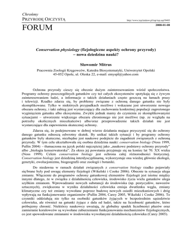 Chrońmy PRZYRODĘ OJCZYSTĄ http://www.iop.krakow.pl/iop/iop.asp?0403 2008-01-08 FORUM Conservation physiology (fizjologiczne aspekty ochrony przyrody) − nowa dziedzina nauki? Sławomir Mitrus Pracownia Zoologii Kręgowców, Katedra Biosystematyki, Uniwersytet Opolski 45-052 Opole, ul. Oleska 22, e-mail: [email protected] Ochrona przyrody cieszy się obecnie dużym zainteresowaniem wśród społeczeństwa. Programy ochrony poszczególnych gatunków czy też całych ekosystemów spotykają się z żywym zainteresowaniem ludzi, a informacje o takich działaniach często goszczą na łamach prasy i telewizji. Rzadko zdarza się, by problemy związane z ochroną danego gatunku nie były skomplikowane. Tylko w niektórych przypadkach możliwe i wskazane jest utworzenie nowego obszaru ochrony, i taki zabieg jest wystarczający dla zachowania konkretnej populacji zagrożonego wyginięciem gatunku albo ekosystemu. Zwykle jednak mamy do czynienia ze skomplikowanymi sytuacjami − utworzenie większego obszaru chronionego nie jest możliwe (np. ze względu na potrzeby okolicznych mieszkańców) albo/oraz przeprowadzenie takich działań nie jest wystarczające dla zapewnienia skutecznej ochrony. Zdarza się, że podejmowane w dobrej wierze działania mające przyczynić się do ochrony danego gatunku odnoszą odwrotny skutek. By unikać takich sytuacji i by programy ochrony gatunków były skuteczne, niezbędne jest naukowe podejście do zagadnień związanych z ochroną przyrody. W tym celu ukształtowała się osobna dziedzina nauki: conservation biology (Noss 1999, Pullin 2004) − tłumaczona na język polski najczęściej jako „naukowe podstawy ochrony przyrody” albo „biologia konserwatorska”. Za okres jej powstania przyjmuje się na koniec lat 70. XX wieku (Noss 1999). Celem conservation biology jest ochrona całej różnorodności biotycznej. Conservation biology jest dziedziną interdyscyplinarną, wykorzystuje ona wiedzę głównie ekologii, genetyki, ewolucjonizmu, biogeografii oraz zoologii i botaniki. Do niedawna w ramach działań związanych z conservation biology rzadko pojawiały się/brane były pod uwagę elementy fizjologii (Wikelski i Cooke 2006). Obecnie ta sytuacja ulega zmianie. Włączenie do programów ochrony gatunkowej elementów fizjologii jest istotne między innymi dlatego, że w związku z działalnością człowieka, środowisko życia wielu gatunków ulega szybkim zmianom. Wprowadzanie nowych substancji do środowiska (np. pestycydów, nawozów sztucznych), zwiększona w wyniku działalności człowieka emisja dwutlenku węgla, zmiany klimatyczne czy też zmiany wywołane poprzez budowę nowych osiedli mieszkaniowych i dróg wpływają na funkcjonowanie organizmów (Pullin 2004, Carey 2005, Wikelski i Cooke 2006). Te czynniki oddziałują nie tylko na osobniki gatunków żyjących w bezpośrednim sąsiedztwie człowieka, ale również na gatunki żyjące z dala od ludzi, także na liczebność gatunków, które próbujemy chronić. Niektórzy naukowcy uważają, że globalny spadek liczebności płazów oraz zamieranie koralowców są wywołane zaburzeniami funkcjonowania mechanizmów fizjologicznych, co jest spowodowane zmianami w środowisku wywołanymi działalnością człowieka (Carey 2005). Sztandarowym przykładem powiązania zagadnień fizjologii i zagrożeń organizmów żywych jest stosowanie DDT (dichlorodifenylotrichloroetan; Wikelski i Cooke 2006). Ten środek chemiczny służący do zwalczania szkodników upraw rolnych był stosowany na szeroką skalę w latach 40. i 50. XX wieku. Jego skuteczność (zmniejszenie się liczby szkodników roślin uprawnych) obserwowana w krótkim czasie po wykonaniu oprysków przyczyniła się do stosowania tego środka na masową skalę. Jednakże okazało się, że DDT jest kumulowany w tkankach zwierząt zjadających owady lub drapieżników żerujących na zwierzętach owadożernych, przyczyniając się do spadku liczebności niektórych gatunków, w tym ptaków drapieżnych. Akumulowanie tego związku w organizmach przyczynia się do zaburzenia procesów fizjologicznych, a to z kolei wpływa na obniżenie przeżywalności lub możliwości wydania potomstwa przez osobniki będące pod wpływem DDT (Pullin 2004). Przykładem, jak zrozumienie mechanizmów fizjologicznych może pomóc przy ochronie gatunków jest ochrona północnoamerykańskiego żółwia pustynnego Gopherus agassizi (Cooper, 1863). Jest to gatunek żółwia zagrożony wyginięciem. Przez długi czas spadek jego liczebności wiązano z niszczeniem siedlisk, wzrostem liczebności drapieżników czy też odłowami zwierząt ze środowiska. Prawdopodobnie główną przyczyną są choroby układu oddechowego żółwi będące wynikiem zaburzenia mechanizmów fizjologicznych. Jedna z hipotez głosi, że przyczyną tych zaburzeń jest nadmierna koncentracja w organizmach zwierząt niektórych pierwiastków. Żółwie tego gatunku są przystosowane do życia w bardzo suchym środowisku, a potrzebną do przeżycia wodę czerpią głównie z pokarmu roślinnego. Żółwie, zjadając rośliny, wprowadzają do organizmu także potas, który niektóre rośliny pustynne akumulują w tkankach w dużych ilościach. Żółwie pustynne nie posiadają gruczołów solnych, ale w przypadku wystarczającej dostępności wody nadmiar potasu wydalany jest z odchodami. Jednakże w czasie bardzo suchych lat żółwiom nie wystarcza wody do jego wydalenia z organizmu i muszą odżywiać się roślinami o niższej zawartości potasu. W takich latach szczególnie niebezpieczne dla przetrwania gatunku staje się konkurencja ze strony zwierząt hodowlanych, które zjadają dużą część roślin i zmuszają żółwie do odżywiania się roślinami o wyższej zawartości potasu. Jeśli ta hipoteza jest prawdziwa, dla ochrony tego gatunku wystarczy w latach suchych ograniczyć wypas bydła na terenach będących obszarami żerowania żółwi. Obecnie uważa się, że bez