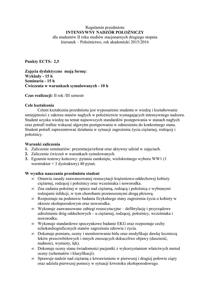 Regulamin przedmiotu INTENSYWNY NADZÓR POŁOŻNICZY dla studentów II roku studiów stacjonarnych drugiego stopnia kierunek – Położnictwo, rok akademicki 2015/2016 Punkty ECTS: 2,5 Zajęcia dydaktyczne mają formę: Wykłady - 15 h Seminaria - 15 h Ćwiczenia w warunkach symulowanych - 10 h Czas realizacji: II rok /III semestr Cele kształcenia Celem kształcenia przedmiotu jest wyposażenie studenta w wiedzę i kształtowanie umiejętności z zakresu stanów nagłych w położnictwie wymagających intensywnego nadzoru. Student uzyska wiedzę na temat najnowszych standardów postępowania w stanach nagłych oraz potrafi trafnie wskazać algorytm postępowania w odniesieniu do konkretnego stanu. Student potrafi zaprezentować działania w sytuacji zagrożenia życia ciężarnej, rodzącej i położnicy. Warunki zaliczenia 1. Zaliczenie seminariów: prezentacja/referat oraz aktywny udział w zajęciach. 2. Zaliczenie ćwiczeń w warunkach symulowanych. 3. Egzamin testowy końcowy: pytania zamknięte, wielokrotnego wyboru WW1 (1 werstraktor + 3 dystraktory) 40 pytań. W wyniku nauczania przedmiotu student • Omawia zasady zaawansowanej resuscytacji krążeniowo-oddechowej kobiety ciężarnej, rodzącej i położnicy oraz wcześniaka i noworodka. • Zna zadania położnej w opiece nad ciężarną, rodzącą i położnicą z wybranymi rodzajami infekcji, w tym chorobami przenoszonymi drogą płciową. • Rozpoznaje na podstawie badania fizykalnego stany zagrożenia życia u kobiety w okresie okołoporodowym oraz noworodka. • Wykonuje zaawansowane zabiegi resuscytacyjne – defibrylację i przyrządowe udrożnienie dróg oddechowych – u ciężarnej, rodzącej, położnicy, wcześniaka i noworodka. • Wykonuje standardowe spoczynkowe badanie EKG oraz rozpoznaje cechy echokardiograficznych stanów zagrożenia zdrowia i życia. • Dokonuje pomiaru, oceny i monitorowania bólu oraz modyfikuje dawkę leczniczą leków przeciwbólowych i innych znoszących dokuczliwe objawy (duszność, nudności, wymioty, lęk). • Dokonuje oceny stanu świadomości pacjentki z wykorzystaniem właściwych metod oceny (schematów i klasyfikacji). • Sprawuje nadzór nad ciężarną z krwawieniem w pierwszej i drugiej połowie ciąży oraz udziela pierwszej pomocy w sytuacji krwotoku okołoporodowego. • • • • • Diagnozuje wstępnie zatorowość płucną oraz wdraża działania ratujące życie w przypadku zatorowości płucnej. Dokonuje oceny ciężkości urazu oraz proponuje procedury postępowania uwzględniające ciężkość urazu, czas trwania ciąży i stan ogólny poszkodowanej położnicy. Przejawia odpowiedzialność za udział w podejmowaniu decyzji zawodowych. Przejawia odpowiedzialność za bezpieczeństwo własne i osób powierzonych opiece. Przestrzega zasad etyki zawodowej w relacji z pacjentem, zespołem terapeutycznym i w pracy badawczej. MATERIAŁ NAUCZANIA Tematy wykładów 1. Umieralność okołoporodowa płodów, noworodków i kobiet. 2. Przyczyny zgonów ciężarnych, rodzących i położnic. 3. Intensywny nadzór w ciąży wysokiego ryzyka. 4. Internistyczne stany naglące u ciężarnej, rodzącej i położnicy. 5. Krwawienia we wczesnej i późnej ciąży. 6. Profilaktyka i postępowanie w krwotoku u ciężarnej, rodzącej i położnicy. 7. Intensywna terapia w położnictwie – stany zagrożenia życia (algorytm postępowania RKO) Tematy seminariów 1. Nadciśnienie w ciąży i jego powikłania. Rozpoznanie, postępowanie diagnostycznolecznicze. 2. Stany naglące podczas porodu: wypadnięcie pępowiny, pęknięcie macicy, dystocja barkowa, zator wodami płodowymi). 3. Nauroprotekcja, resuscytacja wewnątrzmaciczna płodu. Cięcie cesarskie ze wskazań nagłych. 4. Postępowanie z ciężarna z urazem. 5. Zatorowość płucna – rozpoznanie zasady postępowania. 6. Postępowanie około zabiegowe w położnictwie – pozapołożnicze wskazania do zabiegu operacyjnego. Nadzór na ciążą. Tematy ćwiczeń 1. Zaawansowana resuscytacja krążeniowo-oddechowa u ciężarnej, rodzącej, położnicy, noworodka i wcześniaka. 2. Technika spoczynkowego badania EKG. Literatura podstawowa 1. Kruszyński Z.: Anestezjologia i intensywna terapia położnicza. PZWL, Warszawa, 2014. 2. Bręborowicz G.H (red): Położnictwo i ginekologia. PZWL, Warszawa 2010. 3. Kusza K., Rzymski S.: Współczesne problemy anestezjologii i intensywnej terapii w położnictwie i pediatrii. Wydawca: Europejska Fundacja ds. Szkolenia w Anestezjologii, 2013. Organizacja zajęć 1. Organizacja zajęć odbywa się zgodnie z Regulaminem Studiów Uniwersytetu Medycznego we Wrocławiu od roku akademickiego 2015/2016 (załącznik do uchwały Nr 1522 Senatu Uniwersytetu Medycznego im. Piastów Śląskich we Wrocławiu z dnia 29 kwietnia 2015r.) 2. Zajęcia odbywają się zgodnie z harmonogramem w godzinach przewidzianych w planie zajęć. 3. Student zobowiązany jest do uczestniczenia w zajęciach z grupą studencką, do której został przydzielony. Zmiana grupy seminaryjnej/ćwiczeniowej jest możliwa za zgodą opiekuna roku. 4. Udział w zajęciach jest obowiązkowy. 5. Każda nieobecność na zajęciach musi być usprawiedliwiona. Usprawiedliwienie nieobecności odbywa się na podstawie zaświadczenia lekarskiego, lub innego poświadczenia nieobecności wynikającego z powodu ważnych zdarzeń losowych. 6. Student ma obowiązek przygotowania się na każde kolejne zajęcia z zakresu obowiązującego materiału zgodnie z przedłożonym programem przedmiotu. 7. Jeśli student podczas zajęć dydaktycznych wykazał się wysokim poziomem wiedzy i umiejętności praktycznych, egzaminator może zwolnić go z egzaminu końcowego z wpisaniem do indeksu odpowiedniej oceny. 8. Na terenie Uczelni i w miejscach odbywania zajęć z przedmiotu należy utrzymywać porządek i czystość oraz zachować ciszę, palenie tytoniu jest wzbronione. W trakcie trwania zajęć zabrania się spożywania posiłków, korzystania z tel