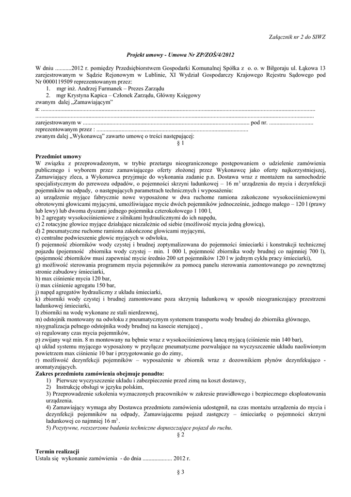 Załącznik nr 2 do SIWZ Projekt umowy - Umowa Nr ZP/ZOŚ/4/2012 W dniu ...........2012 r. pomiędzy Przedsiębiorstwem Gospodarki Komunalnej Spółka z o. o. w Biłgoraju ul. Łąkowa 13 zarejestrowanym w Sądzie Rejonowym w Lublinie, XI Wydział Gospodarczy Krajowego Rejestru Sądowego pod Nr 0000119509 reprezentowanym przez: 1. mgr inż. Andrzej Furmanek – Prezes Zarządu 2. mgr Krystyna Kapica – Członek Zarządu, Główny Księgowy zwanym dalej „Zamawiającym” a: .......................................................................................................................................................................................... ............................................................................................................................................................................................. zarejestrowanym w ................................................................................................................. pod nr. .............................. reprezentowanym przez : ....................................................................................................... zwanym dalej „Wykonawcą” zawarto umowę o treści następującej: §1 Przedmiot umowy W związku z przeprowadzonym, w trybie przetargu nieograniczonego postępowaniem o udzielenie zamówienia publicznego i wyborem przez zamawiającego oferty złożonej przez Wykonawcę jako oferty najkorzystniejszej, Zamawiający zleca, a Wykonawca przyjmuje do wykonania zadanie p.n. Dostawa wraz z montażem na samochodzie specjalistycznym do pzrewozu odpadów, o pojemności skrzyni ładunkowej – 16 m 3 urządzenia do mycia i dezynfekcji pojemników na odpady, o następujących parametrach technicznych i wyposażeniu: a) urządzenie myjące fabrycznie nowe wyposażone w dwa ruchome ramiona zakończone wysokociśnieniowymi obrotowymi głowicami myjącymi, umożliwiające mycie dwóch pojemników jednocześnie, jednego małego – 120 l (prawy lub lewy) lub dwoma dyszami jednego pojemnika czterokołowego 1 100 l, b) 2 agregaty wysokociśnieniowe z silnikami hydraulicznymi do ich napędu, c) 2 rotacyjne głowice myjące działające niezależnie od siebie (możliwość mycia jedną głowicą), d) 2 pneumatyczne ruchome ramiona zakończone głowicami myjącymi, e) centralne podwieszenie głowic myjących w odwłoku, f) pojemność zbiorników wody czystej i brudnej zoptymalizowana do pojemności śmieciarki i konstrukcji technicznej pojazdu (pojemność zbiornika wody czystej – min. 1 000 l, pojemność zbiornika wody brudnej co najmniej 700 l), (pojemność zbiorników musi zapewniać mycie średnio 200 szt pojemników 120 l w jednym cyklu pracy śmieciarki), g) możliwość sterowania programem mycia pojemników za pomocą panelu sterowania zamontowanego po zewnętrznej stronie zabudowy śmieciarki, h) max ciśnienie mycia 120 bar, i) max ciśnienie agregatu 150 bar, j) napęd agregatów hydrauliczny z układu śmieciarki, k) zbiorniki wody czystej i brudnej zamontowane poza skrzynią ładunkową w sposób nieograniczający przestrzeni ładunkowej śmieciarki, l) zbiorniki na wodę wykonane ze stali nierdzewnej, m) odstojnik montowany na odwłoku z pneumatycznym systemem transportu wody brudnej do zbiornika głównego, n)sygnalizacja pełnego odstojnika wody brudnej na kasecie sterującej , o) regulowany czas mycia pojemników, p) zwijany wąż min. 8 m montowany na bębnie wraz z wysokociśnieniową lancą myjącą (ciśnienie min 140 bar), q) układ systemu myjącego wyposażony w przyłącze pneumatyczne pozwalające na wyczyszczenie układu naoliwionym powietrzem max ciśnienie 10 bar i przygotowanie go do zimy, r) możliwość dezynfekcji pojemników – wyposażenie w zbiornik wraz z dozownikiem płynów dezynfekująco aromatyzujących. Zakres przedmiotu zamówienia obejmuje ponadto: 1) Pierwsze wyczyszczenie układu i zabezpieczenie przed zimą na koszt dostawcy, 2) Instrukcję obsługi w języku polskim, 3) Przeprowadzenie szkolenia wyznaczonych pracowników w zakresie prawidłowego i bezpiecznego eksploatowania urządzenia. 4) Zamawiający wymaga aby Dostawca przedmiotu zamówienia udostępnił, na czas montażu urządzenia do mycia i dezynfekcji pojemników na odpady, Zamawiającemu pojazd zastępczy – śmieciarkę o pojemności skrzyni ładunkowej co najmniej 16 m3 . 5) Pozytywne, rozszerzone badania techniczne dopuszczające pojazd do ruchu. §2 Termin realizacji Ustala się wykonanie zamówienia - do dnia .................... 2012 r. §3 Wynagrodzenie Za wykonany przedmiot umowy dostawca otrzyma wynagrodzenie: cena netto ............................. zł (słownie zł: ........................................................................................................................) podatek VAT ................... % co stanowi kwotę .............................. zł (słownie zł: ............................................................) cena brutto .................................. zł (słownie zł:..................................................................................................................). Należne wynagrodzenie zostanie wypłacone Dostawcy jednorazowo w terminie 30 dni licząc od daty złożenia w siedzibie Zamawiającego prawidłowo wystawionej faktury po uprzednim, protokolarnym odbiorze przez Zamawiającego przedmiotu zamówienia. Przelew na konto Wykonawcy ................................................... Nr ........................................................................... Oferowana cena wykonania zamówienia nie ulegnie zwiększeniu w okresie trwania umowy. §4 Warunki gwarancji i serwis 1. Okres udzielenia gwarancji na całość przedmiotu umowy wynosi ........ miesiące licząc od daty odbioru przedmiotu umowy. W okresie gwarancji Wykonawca na własny koszt dokona niezbędnych napraw sprzętu i usunie wady sprzętu powstałe z nie winy Zamawiającego. 2. Wykonawca w okresie trwania gwarancj